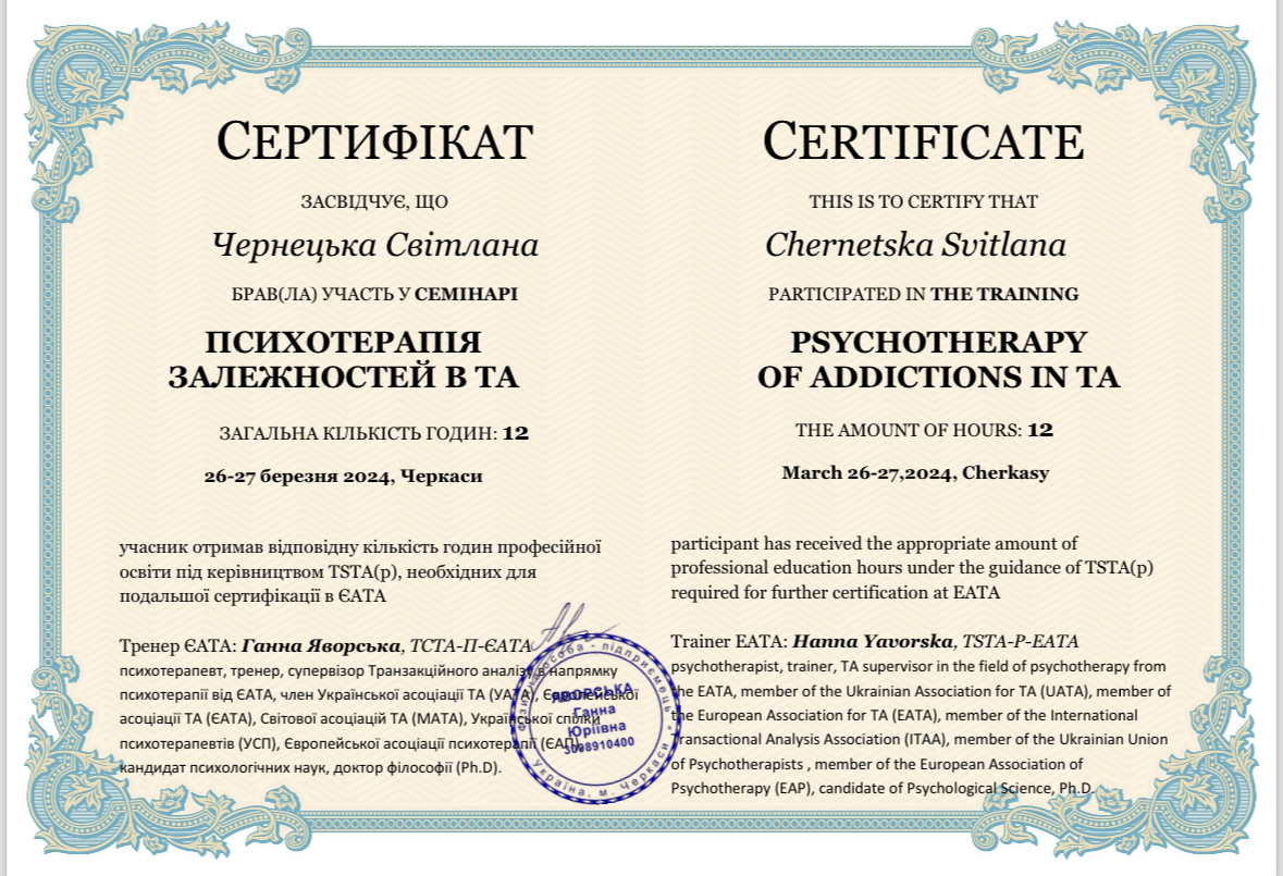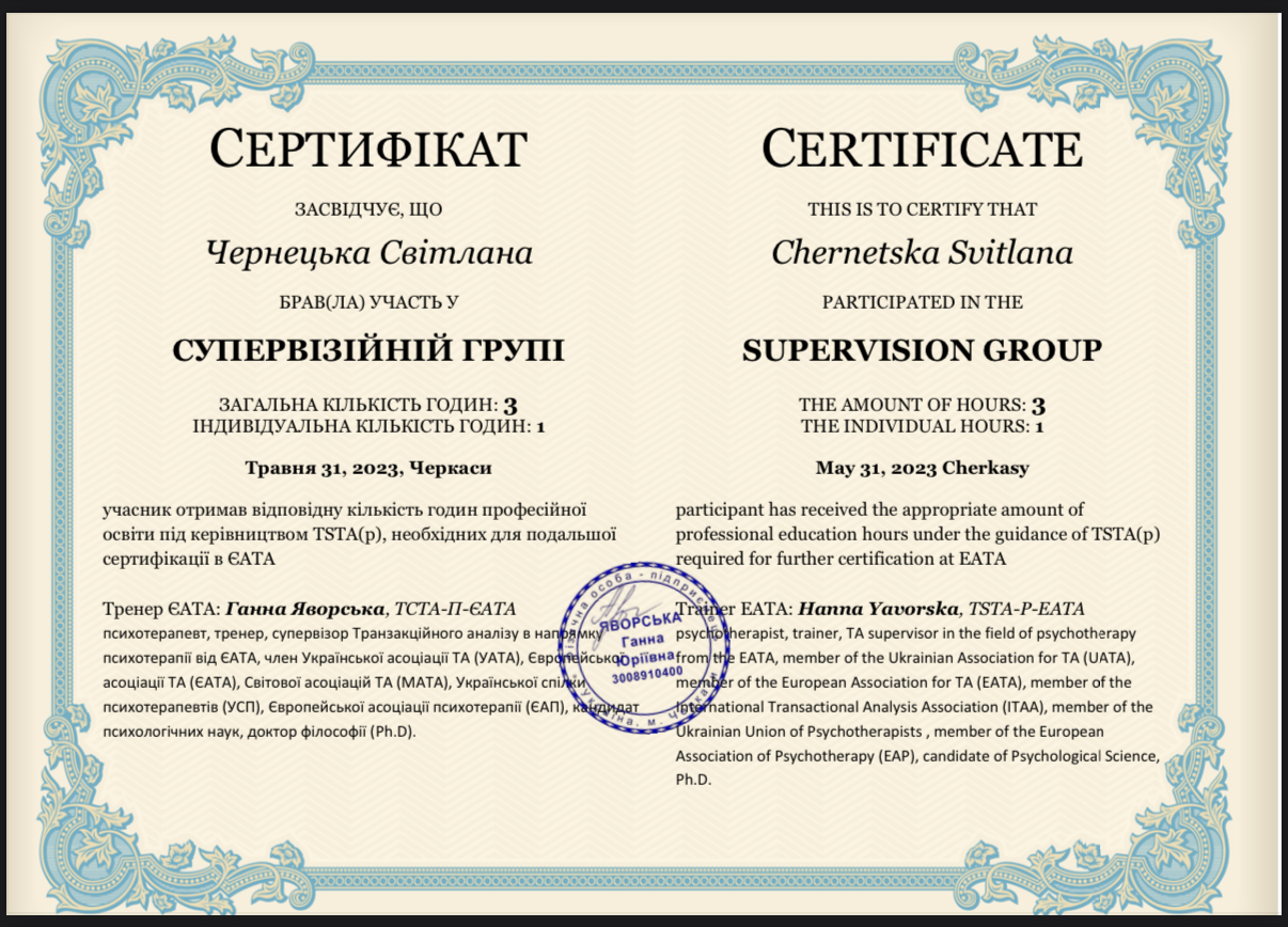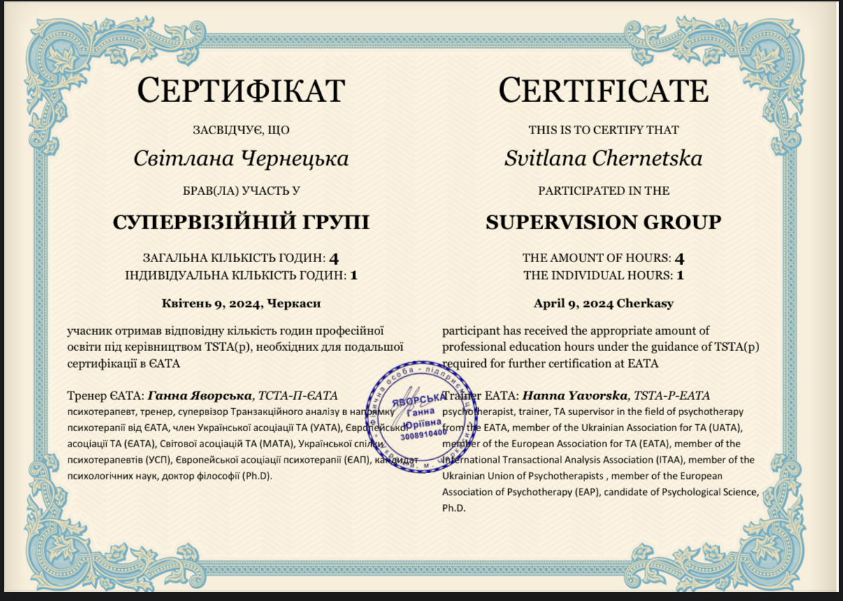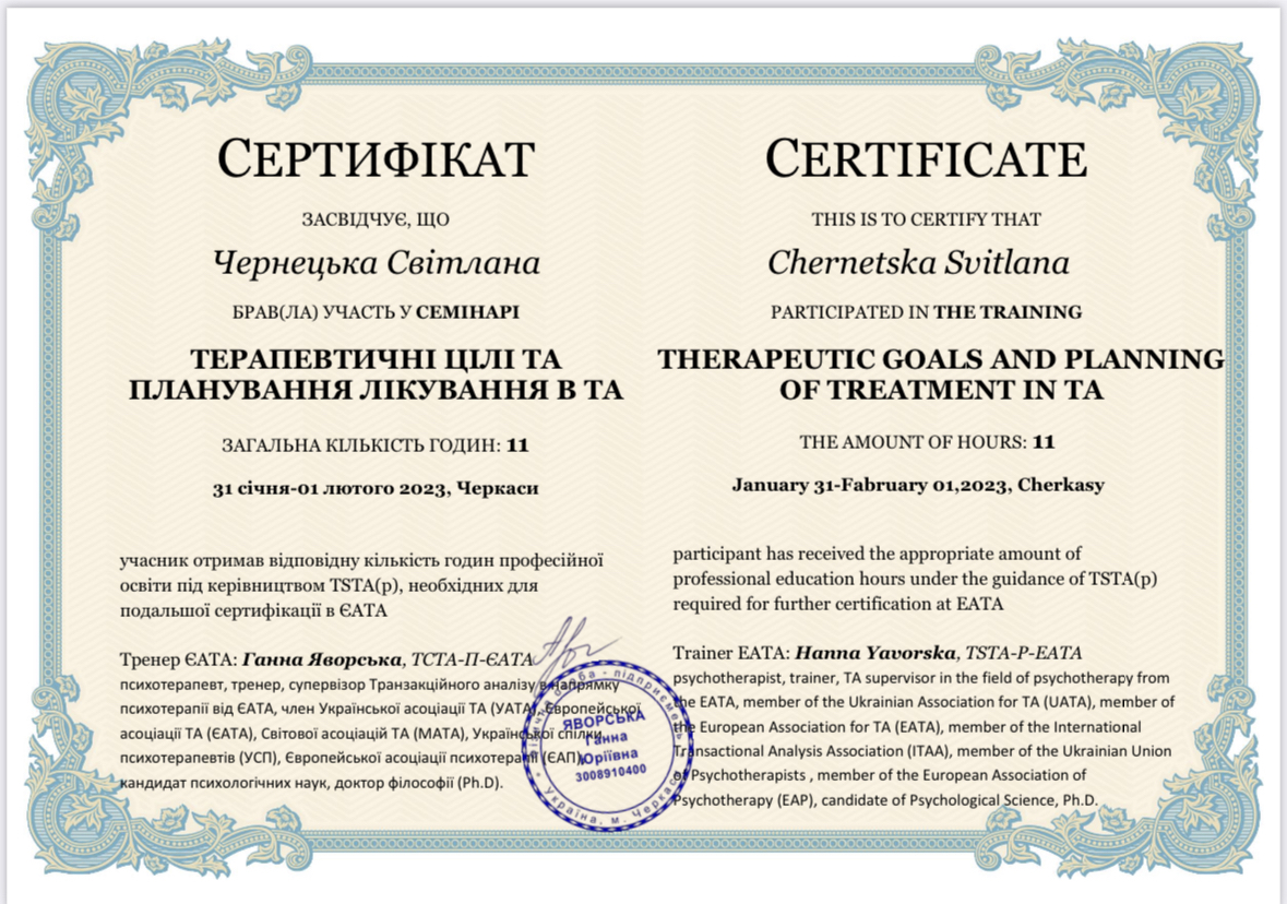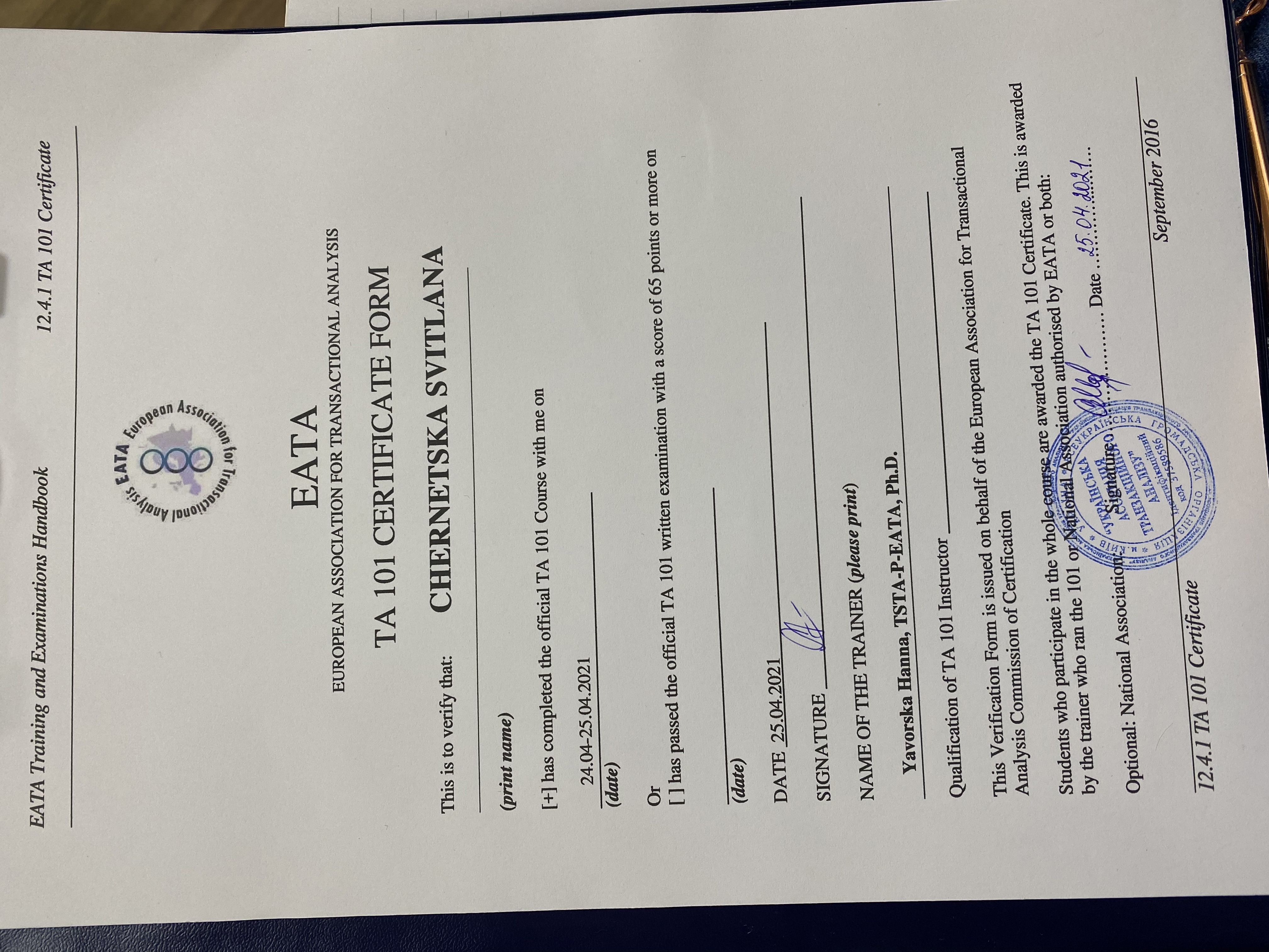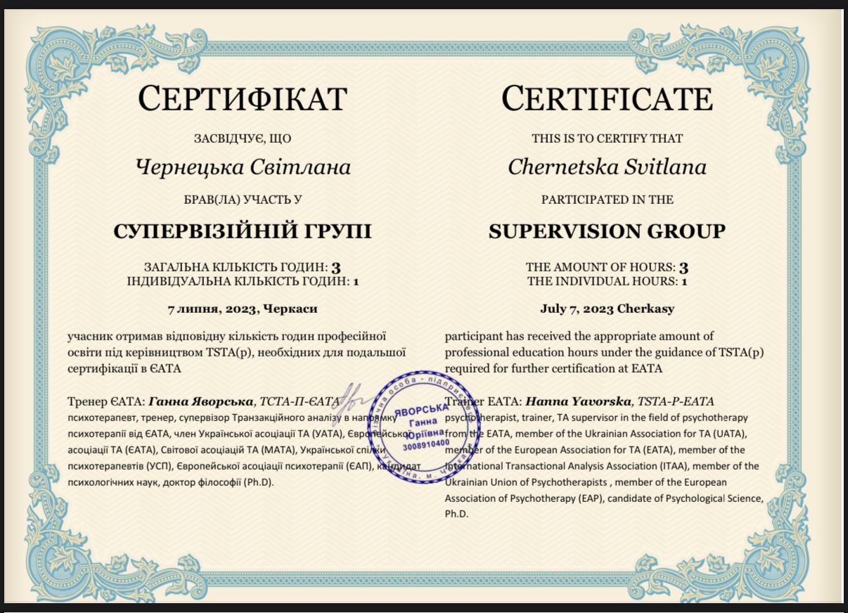 * Психолог-практик в психотерапевтическом методе транзакционного анализа. Профессиональное 4-летнее образование, член Европейской Ассоциации транзакционного анализа (EATA), член Украинской ассоциации транзакционного анализа (UATA), член Национальной психологической ассоциации (NPA).