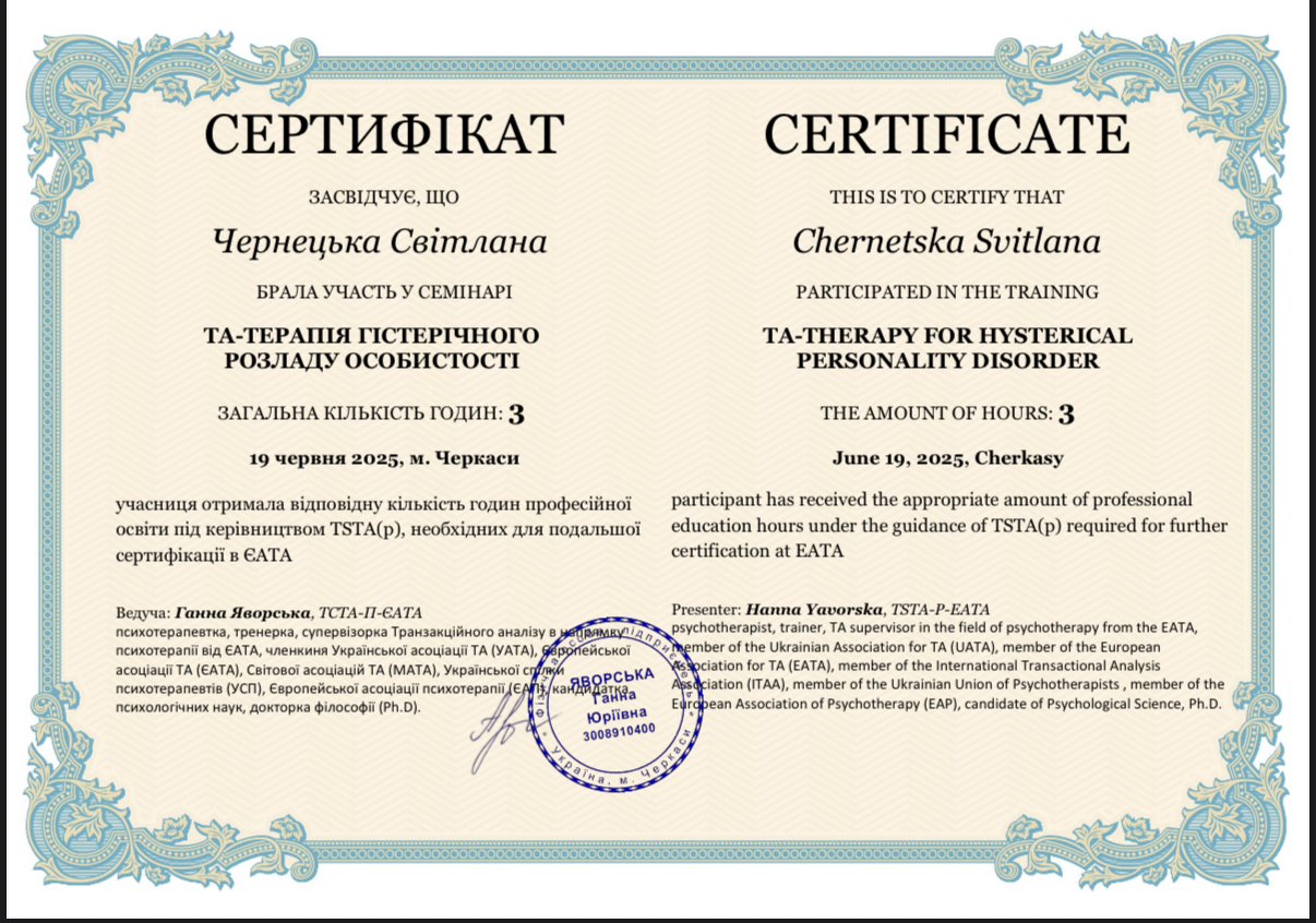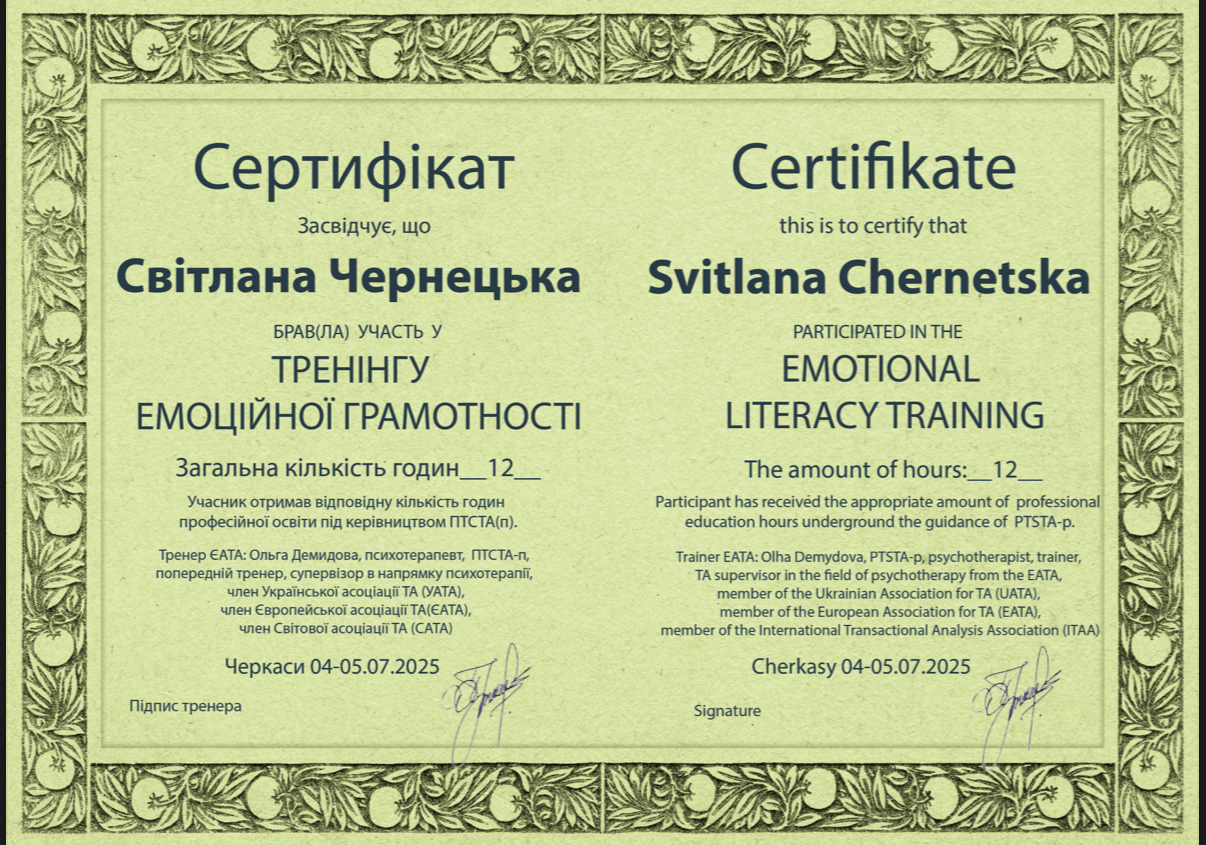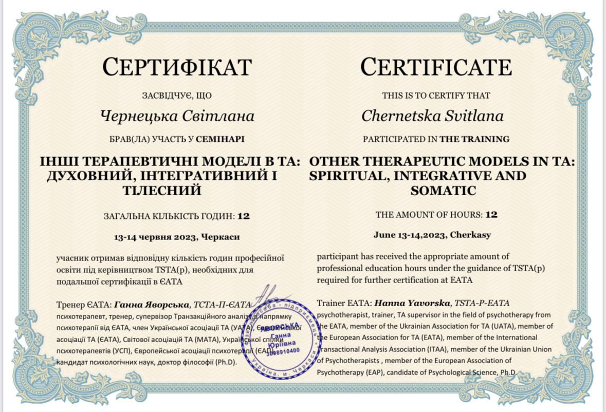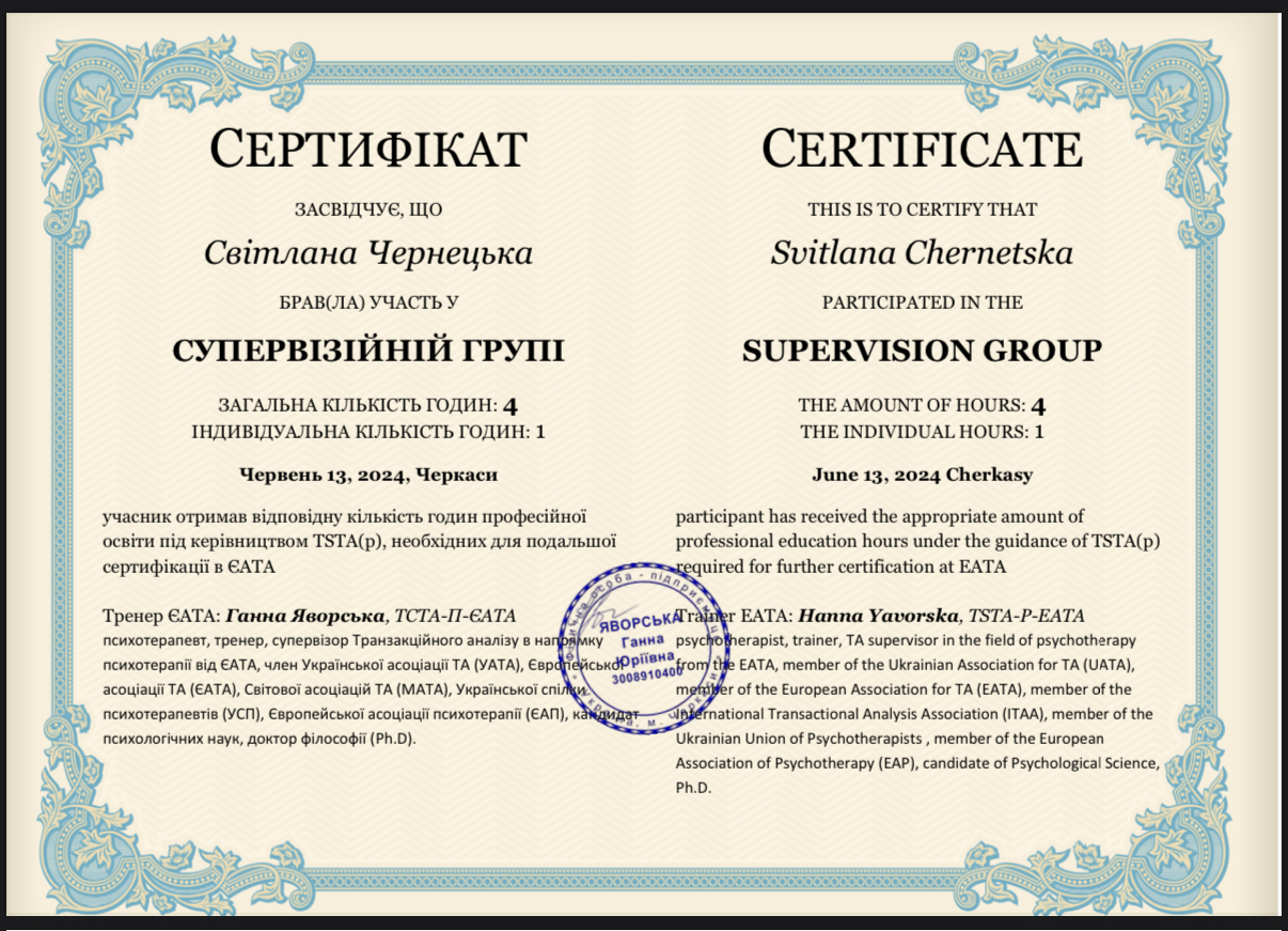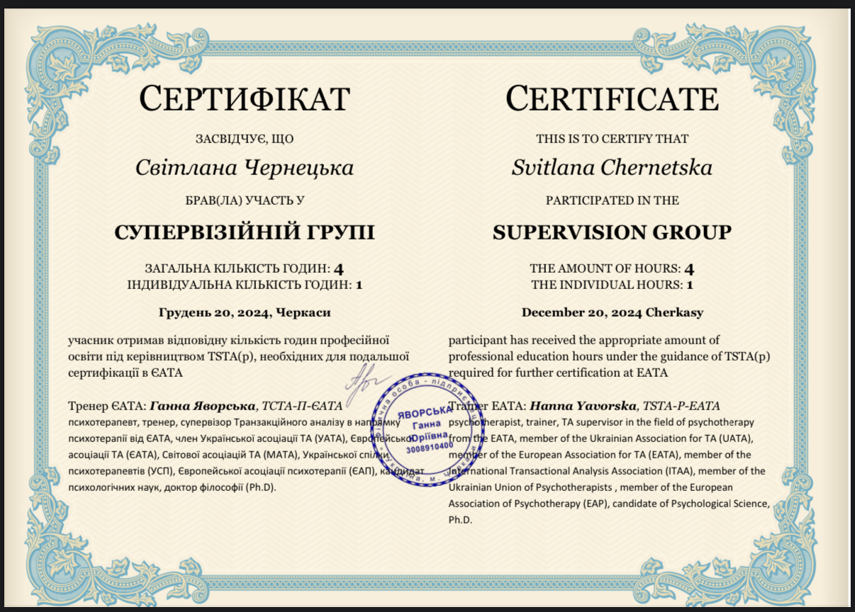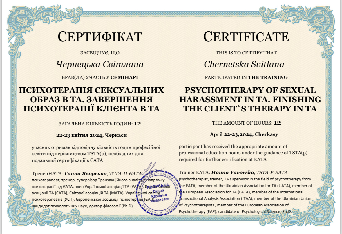 * Психолог-практик в психотерапевтическом методе транзакционного анализа. Профессиональное 4-летнее образование, член Европейской Ассоциации транзакционного анализа (EATA), член Украинской ассоциации транзакционного анализа (UATA), член Национальной психологической ассоциации (NPA).