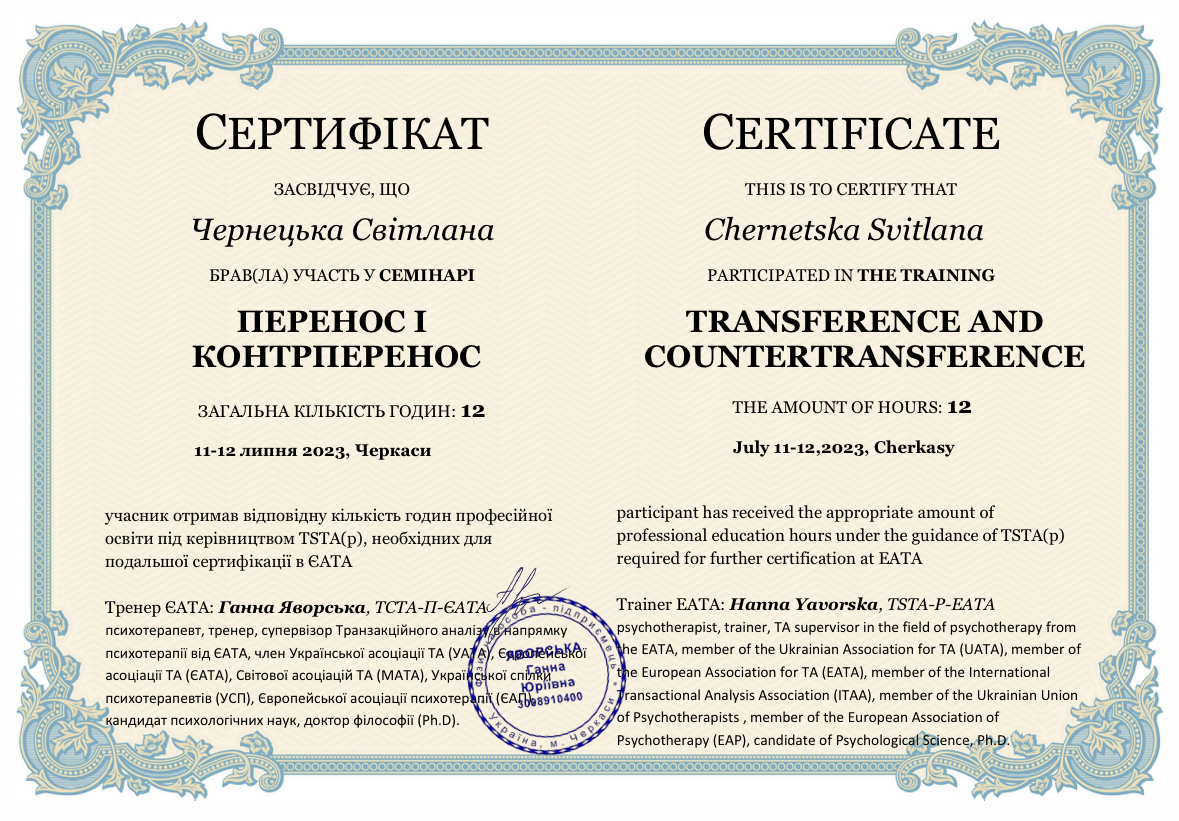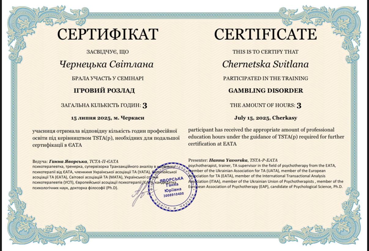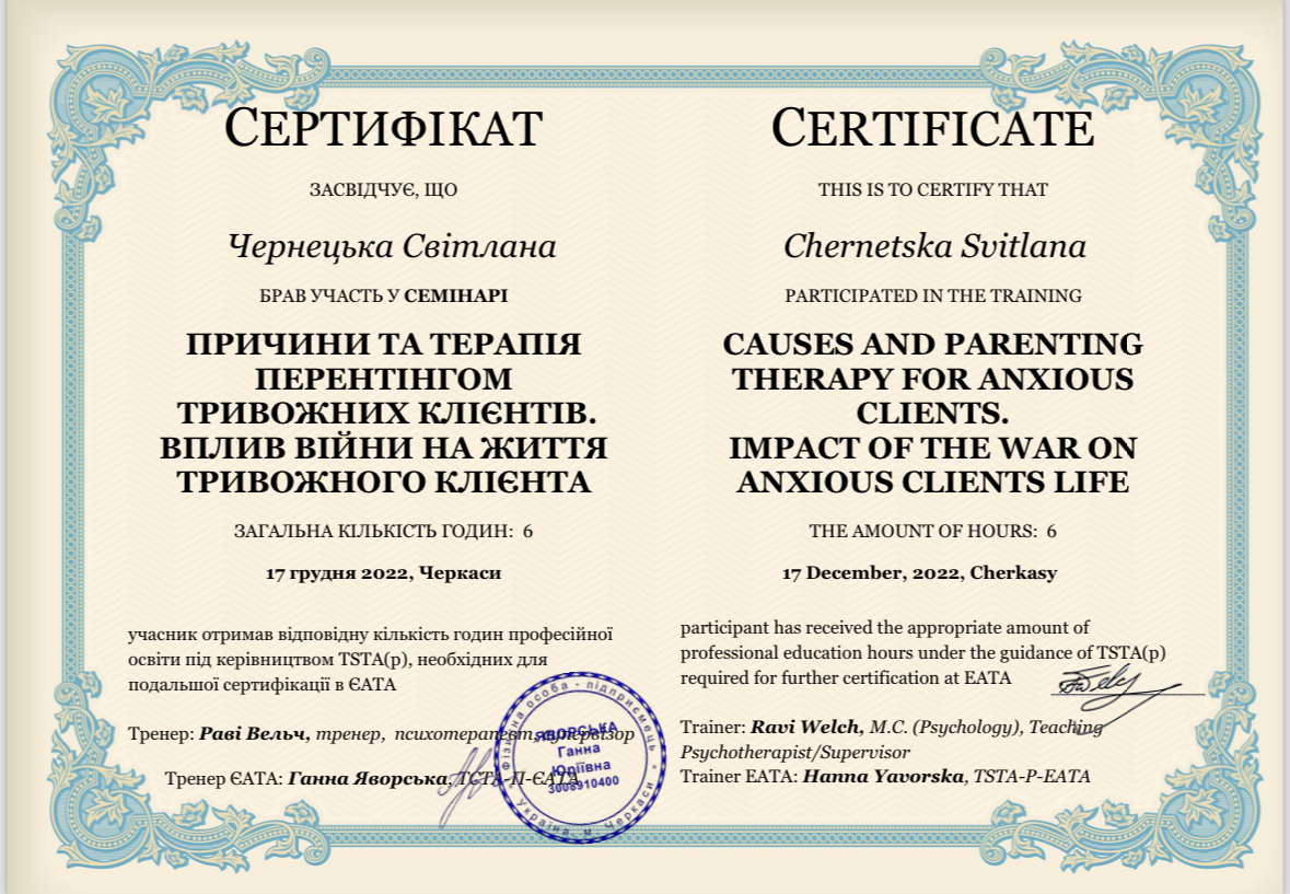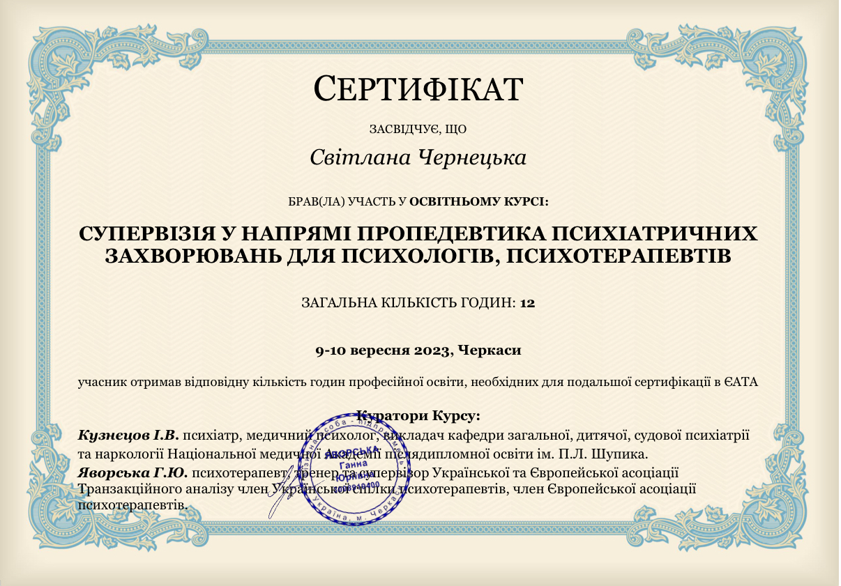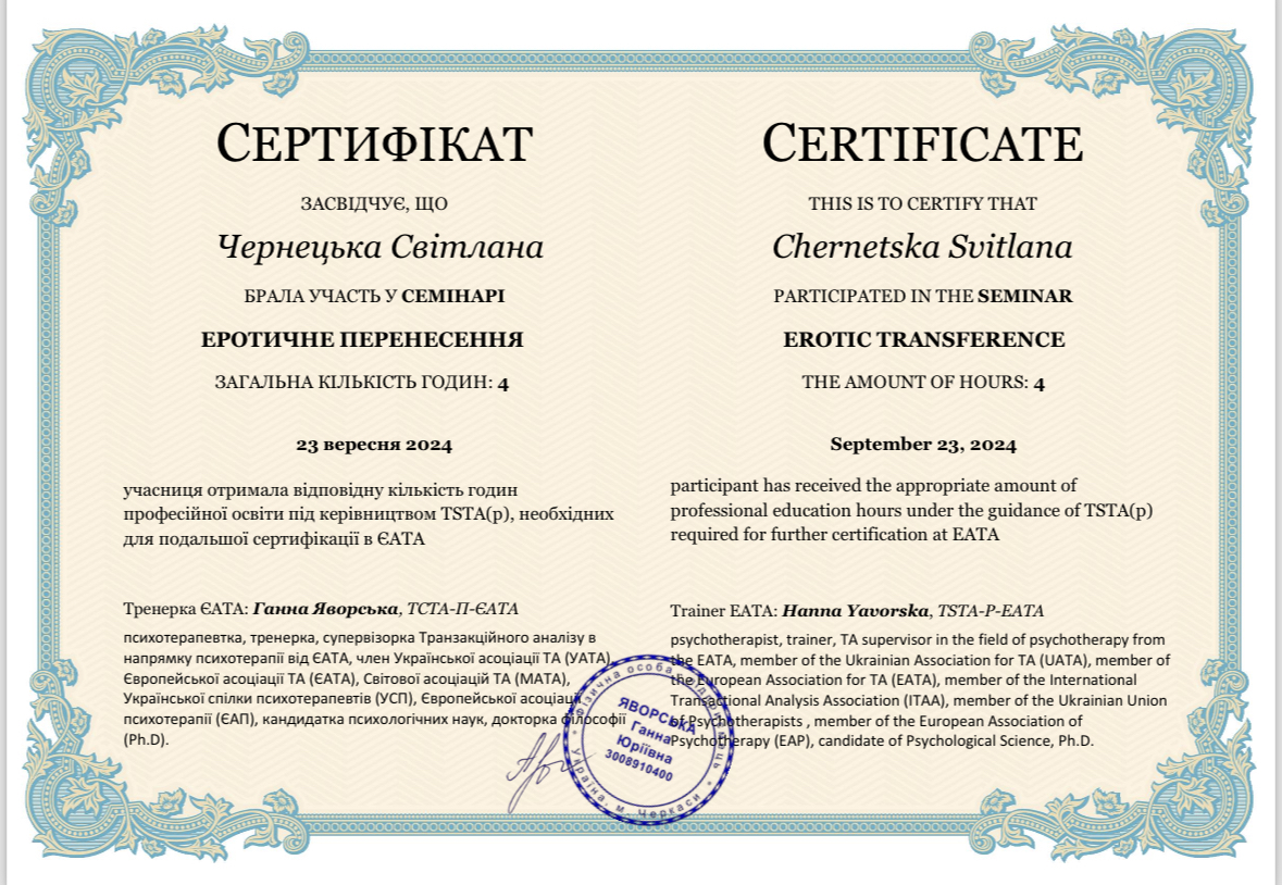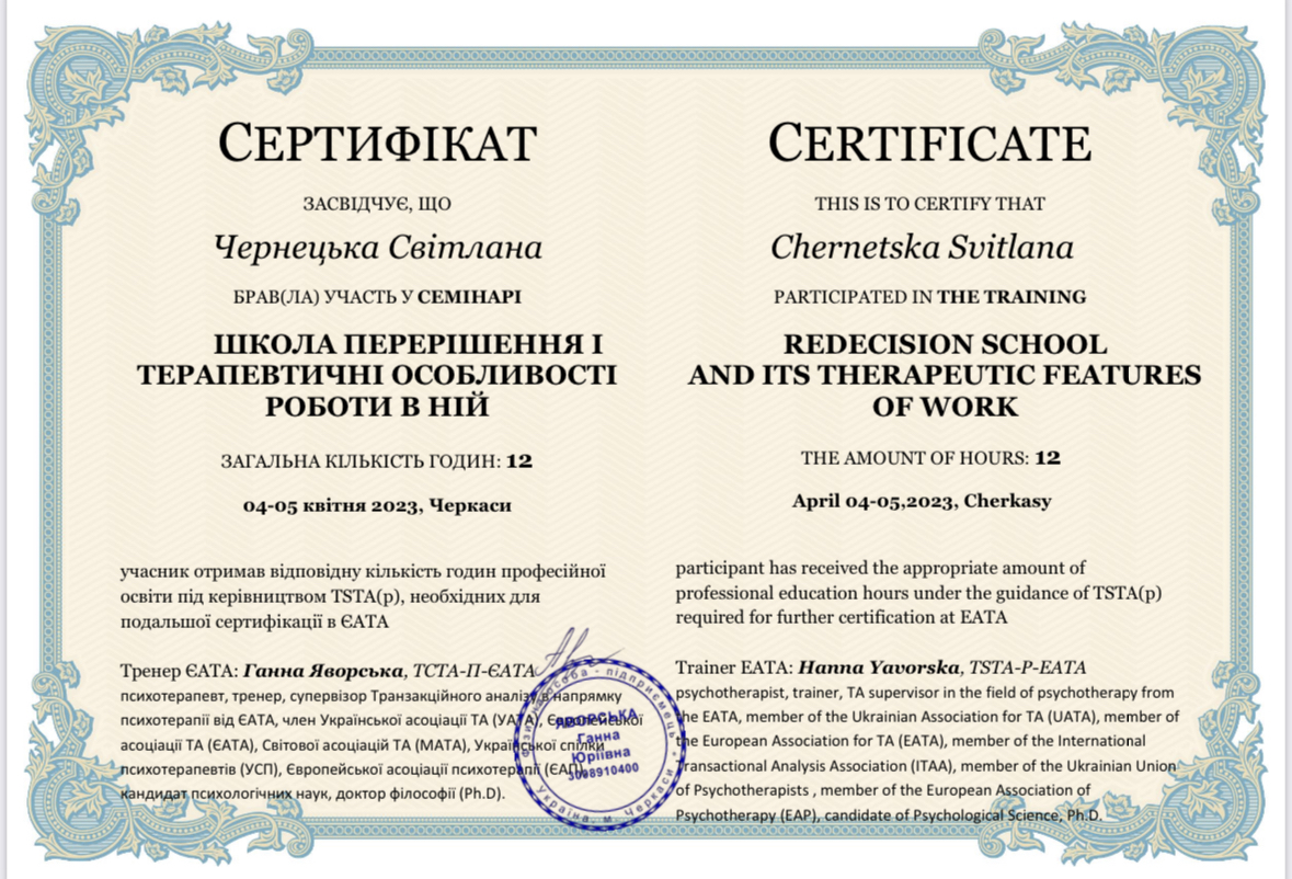 * Психолог-практик в психотерапевтическом методе транзакционного анализа. Профессиональное 4-летнее образование, член Европейской Ассоциации транзакционного анализа (EATA), член Украинской ассоциации транзакционного анализа (UATA), член Национальной психологической ассоциации (NPA).