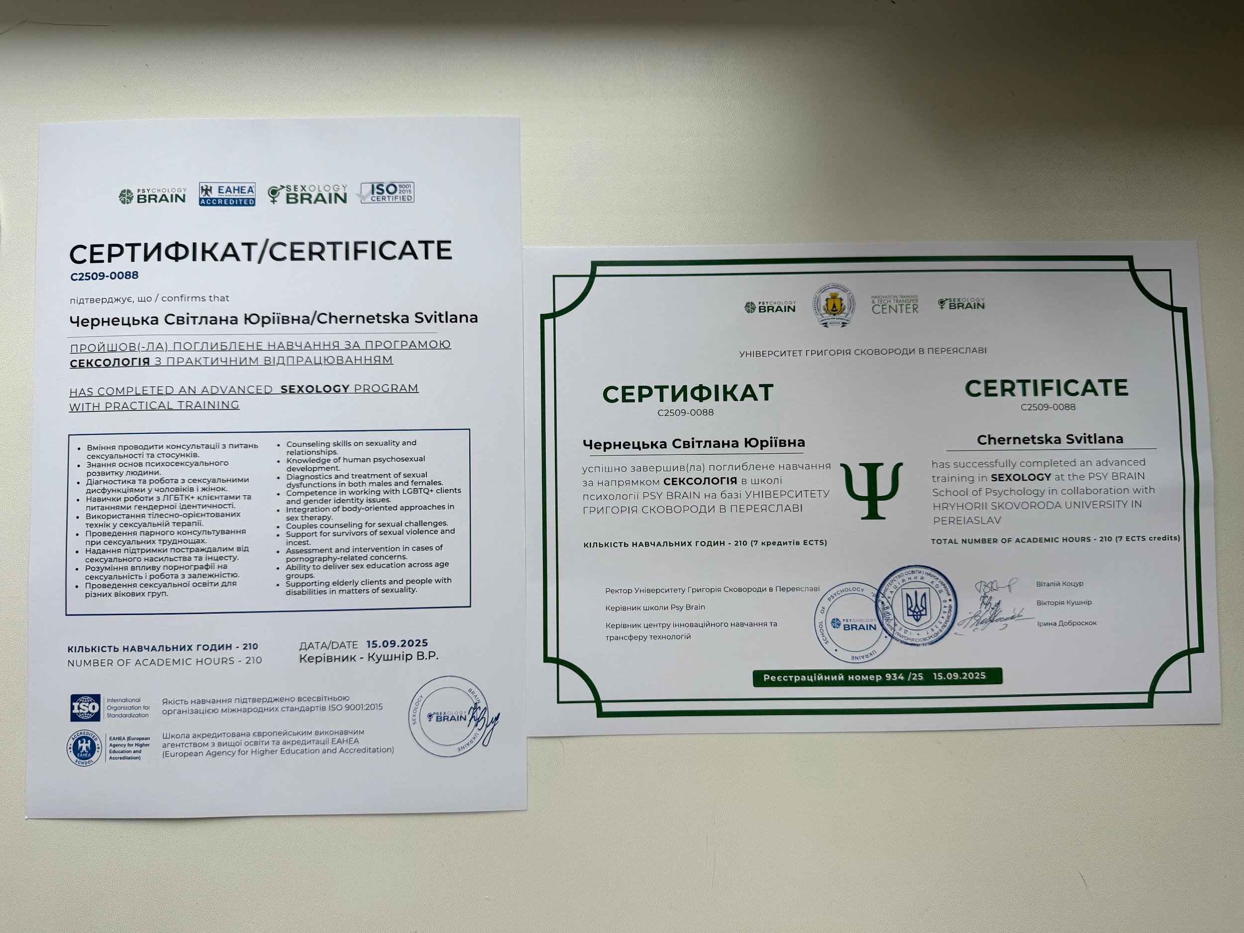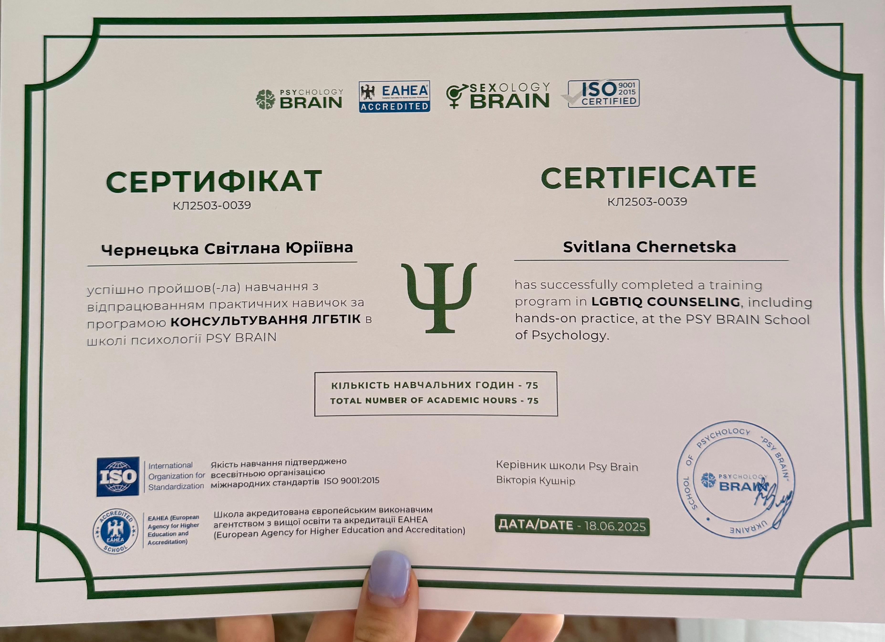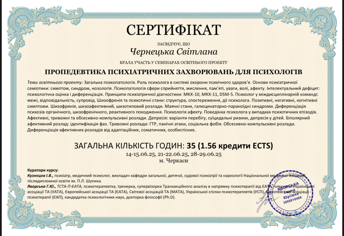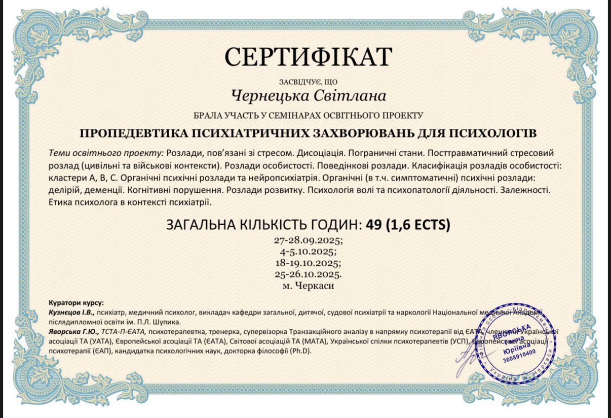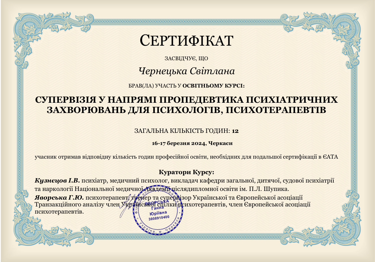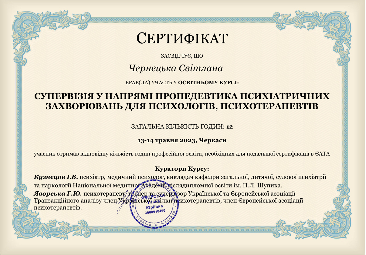 * Психолог-практик в психотерапевтическом методе транзакционного анализа. Профессиональное 4-летнее образование, член Европейской Ассоциации транзакционного анализа (EATA), член Украинской ассоциации транзакционного анализа (UATA), член Национальной психологической ассоциации (NPA).