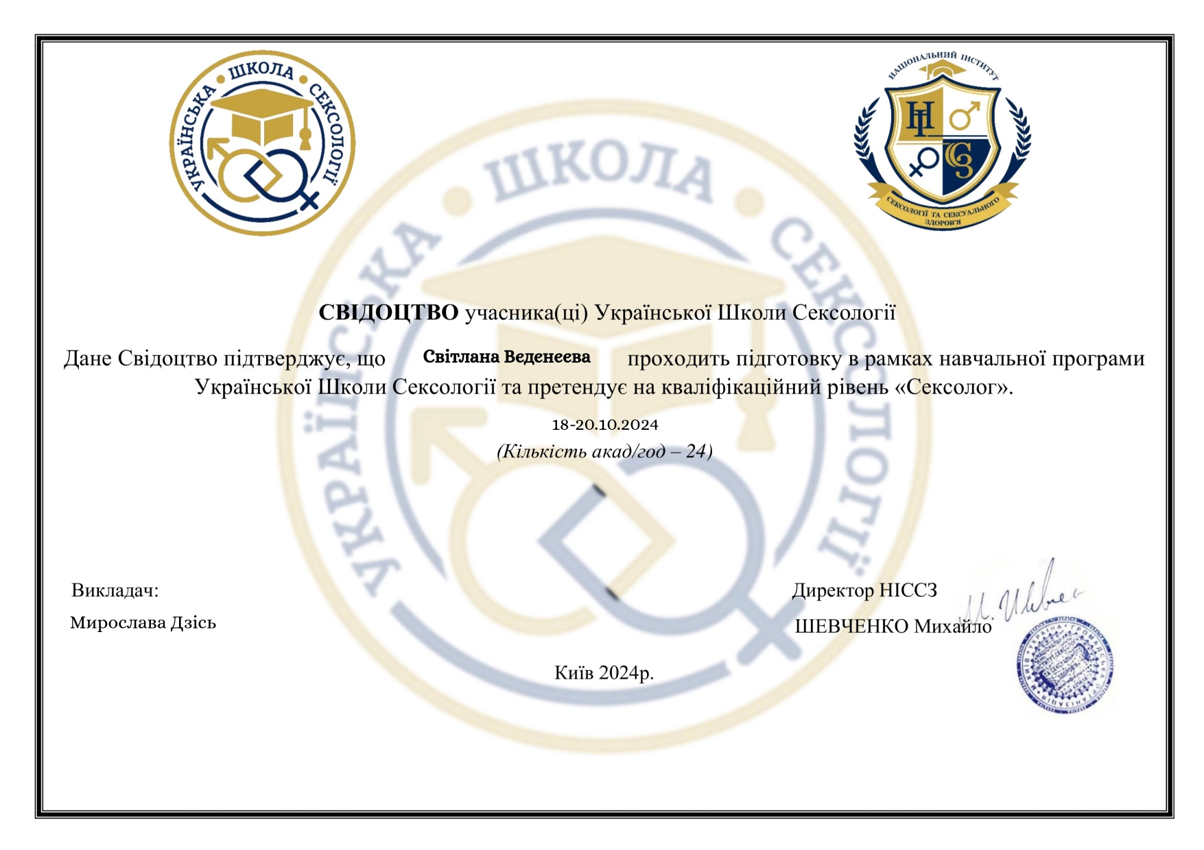 ◉ август 2024 - август 2026 - Украинская Школа Сексологии (Национальный институт сексологии и сексуального здоровья) (Консультант по сексологии)