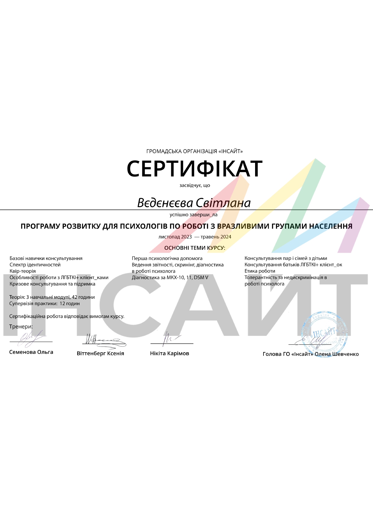 ◉ 2023-май 2024 – специализация по работе с ЛГБТКИ+сообществом (ОО «Инсайт»)