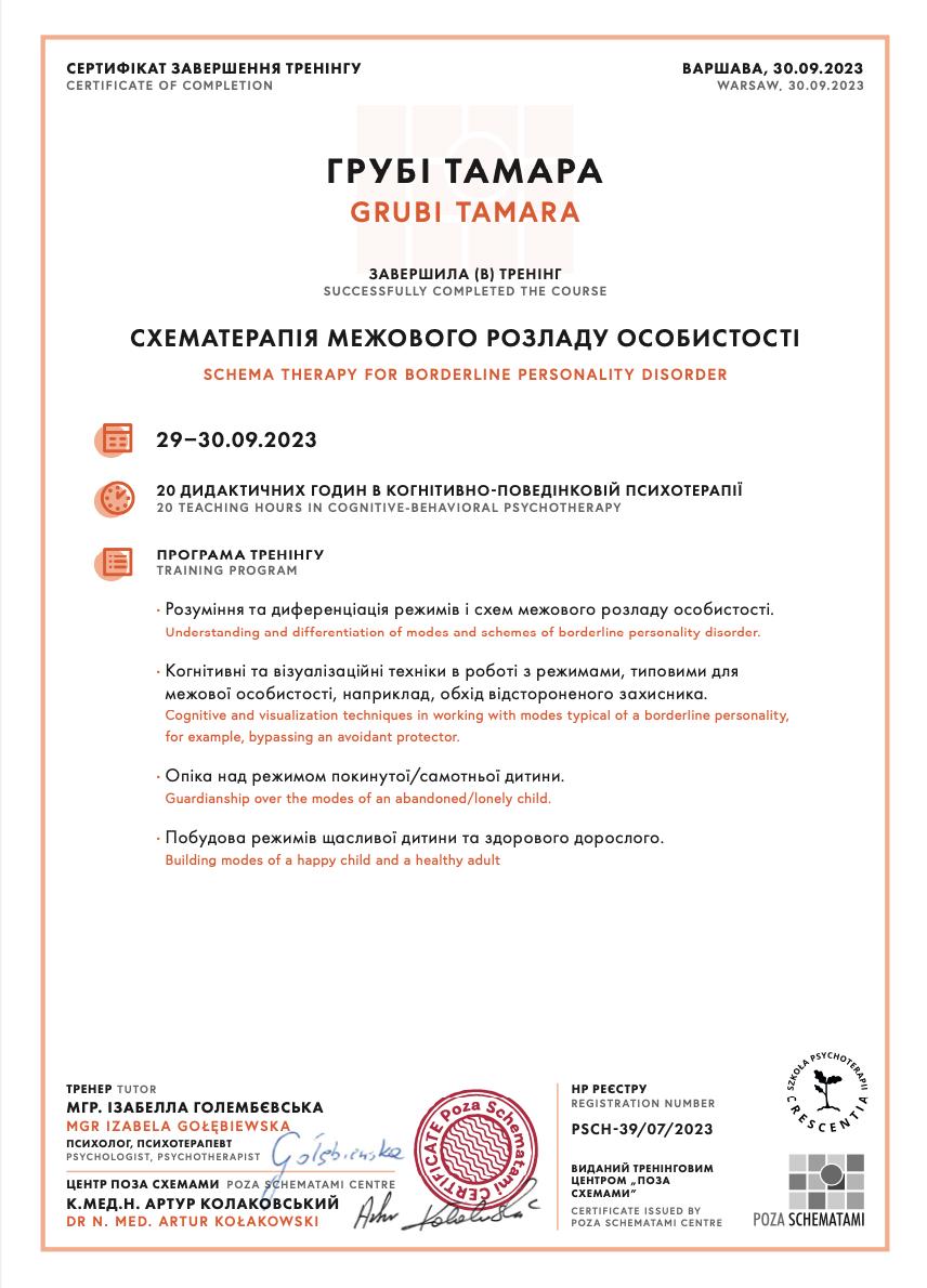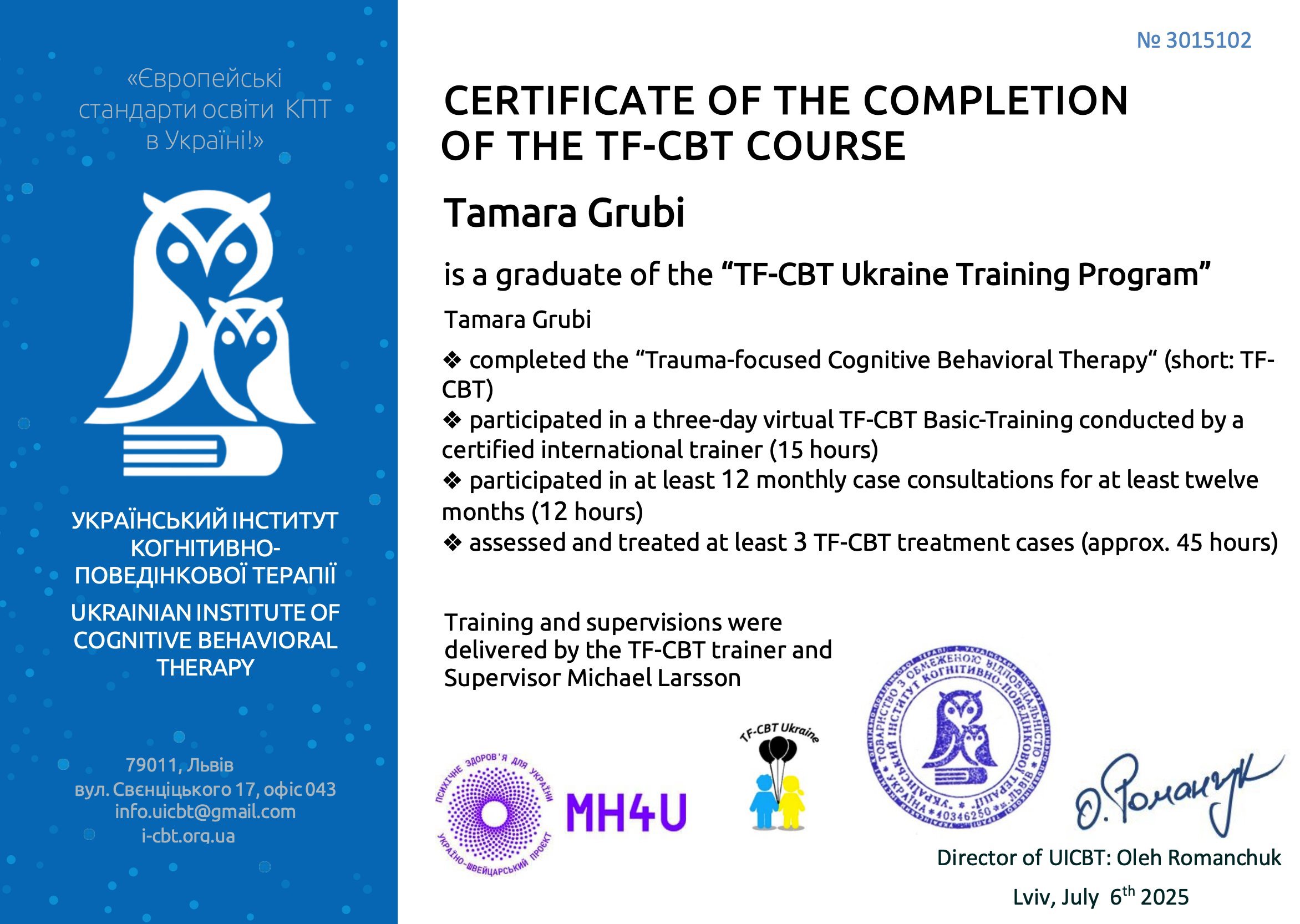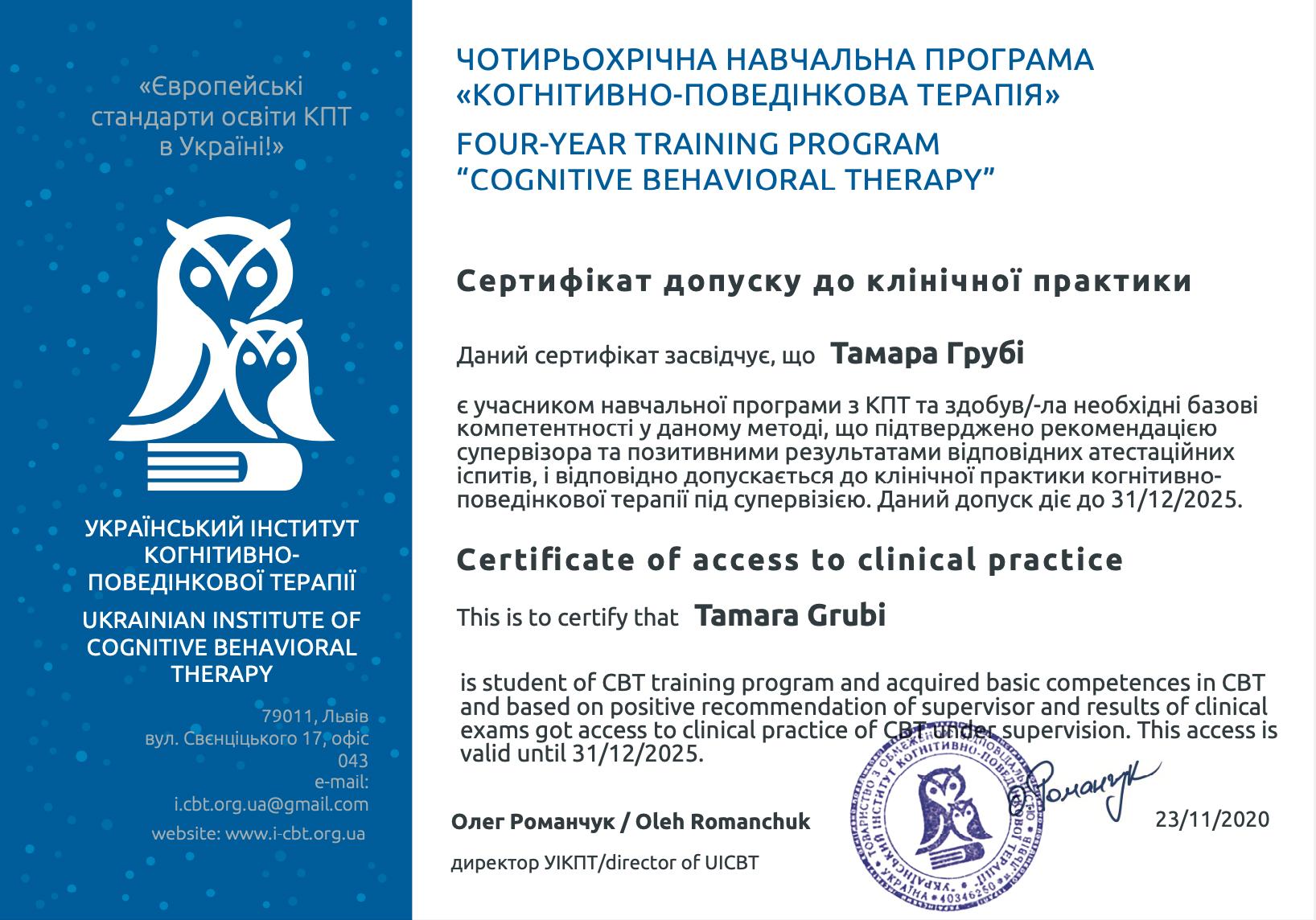 2019 – 2023 – Украинский Институт когнитивно-поведенческой психотерапии (600 академ. часов)