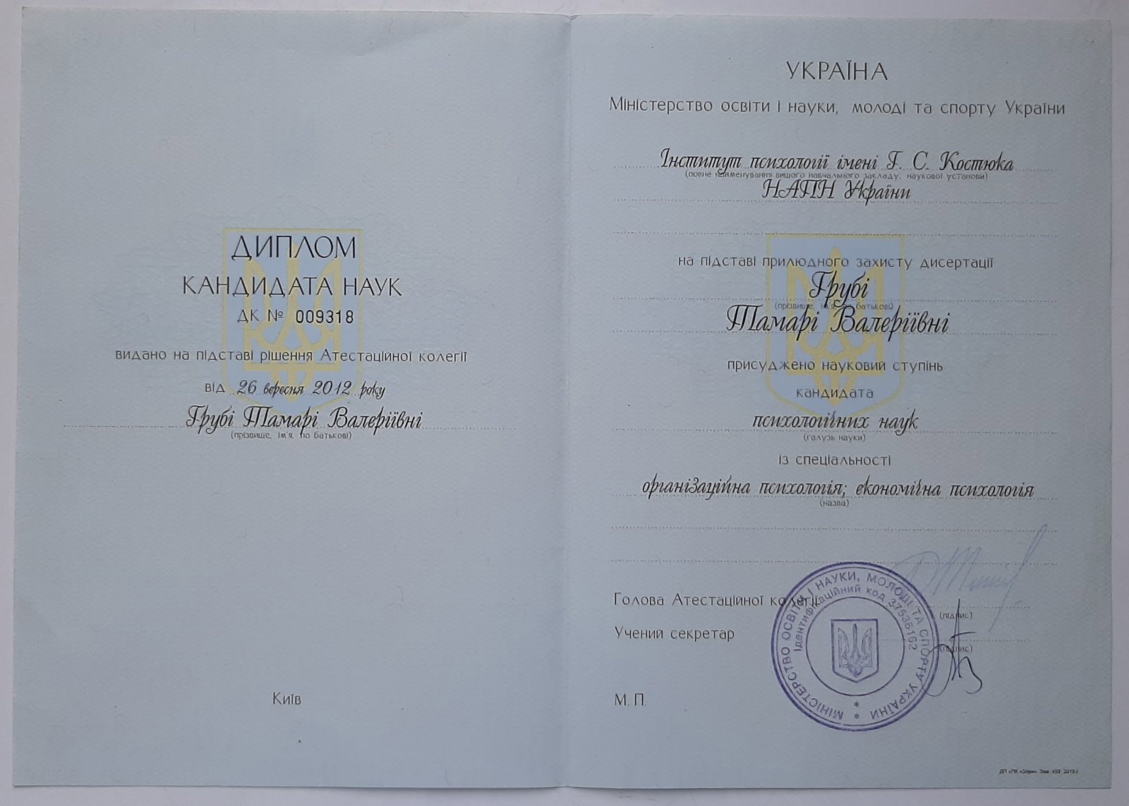 2012 – защита кандидатской диссертации на тему: «Психологические факторы профессионального выгорания работников государственной налоговой службы Украины».