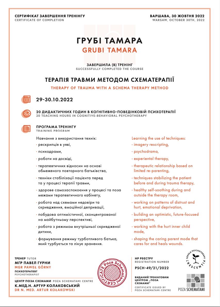5. Сертификат о повышении квалификации "Посттравматический стресс", 8-10 декабря 2017 г., г. Киев.