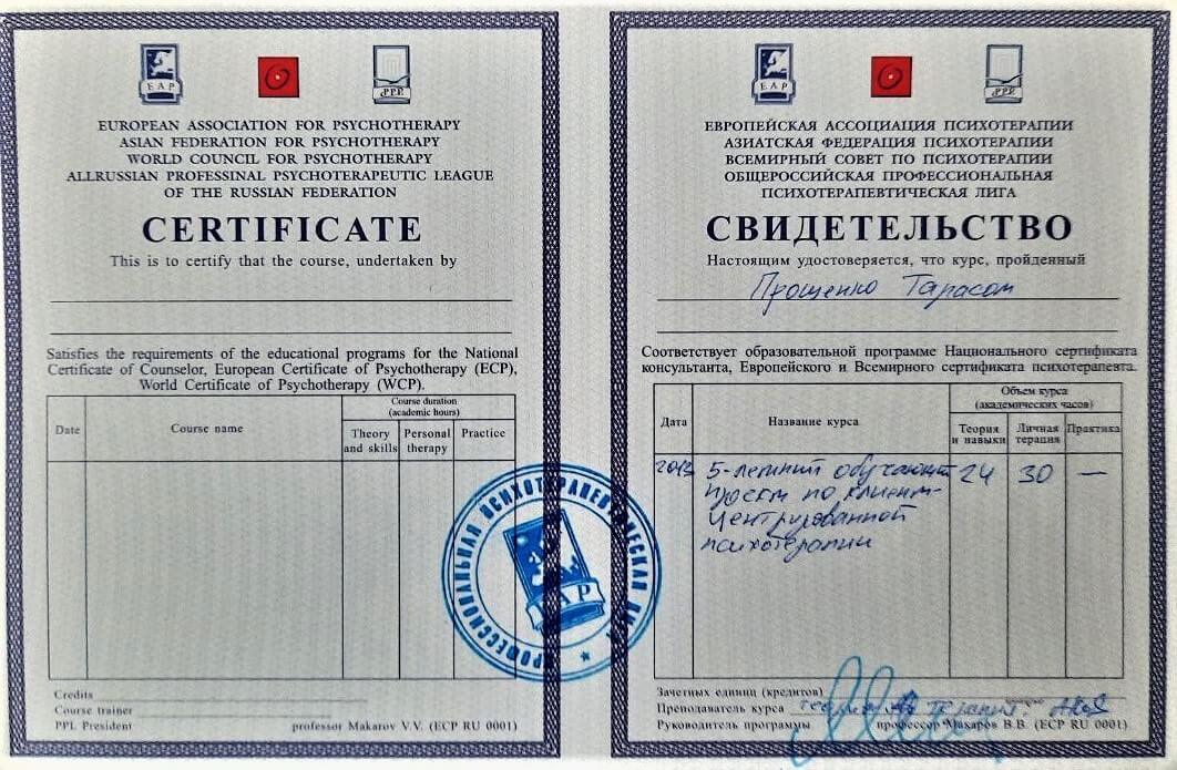 закончил базовую обучающую программу по психотерапии