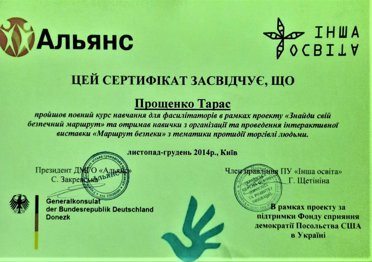 прошел полный курс обучения для фасилитаторов в рамках проекта "Найди свой безопасный маршрут" по тематике противодействия торговле людьми