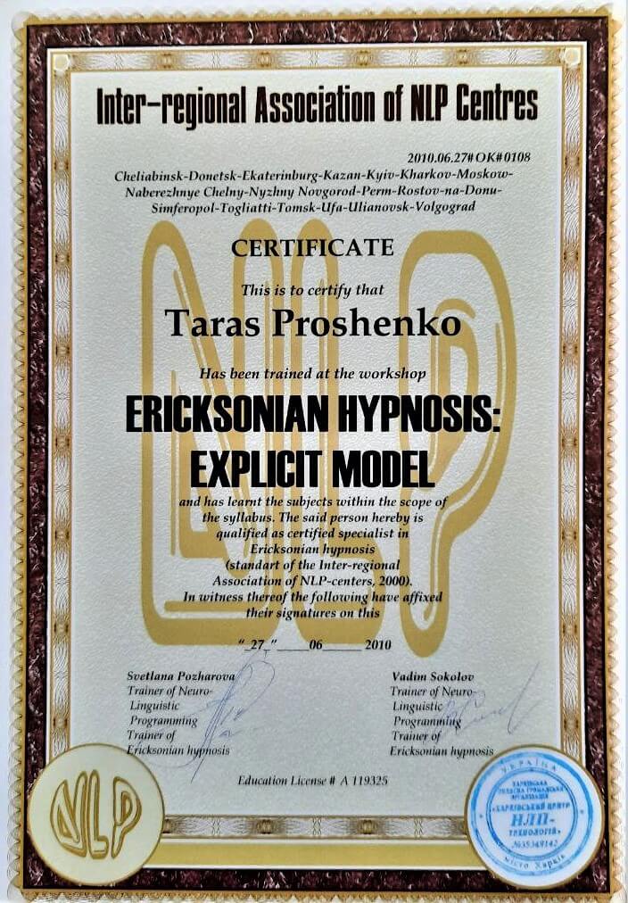 Has been trained на workshop ERICKSONIAN HYPNOSIS: EXPLICIT MODEL