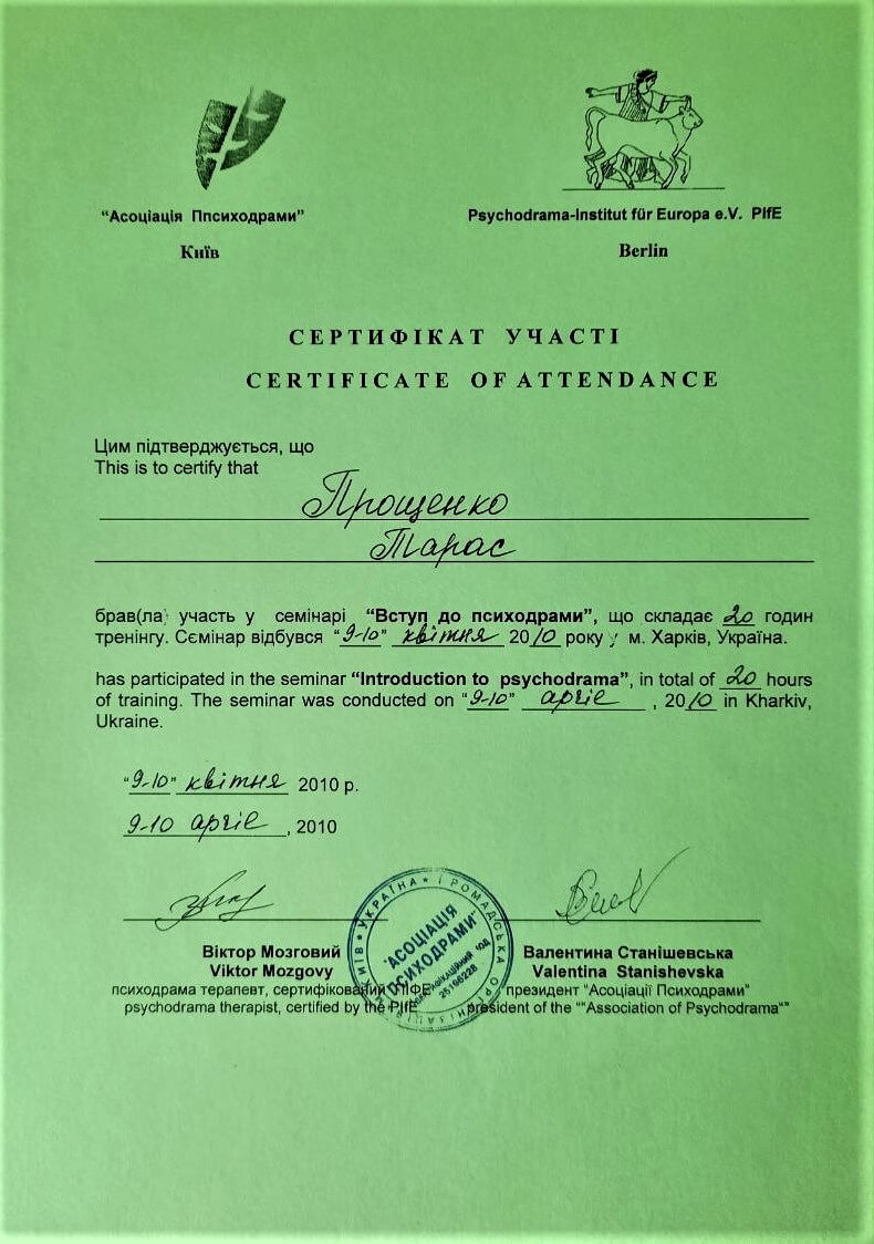 участвовал на учебном семинаре "Введение в психодраму"