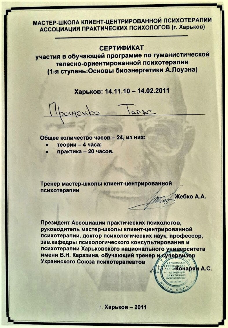 участие в учебной программе по гуманистической телесно-ориентированной психотерапии (Основы биоэнергетики А. Лоуэна)