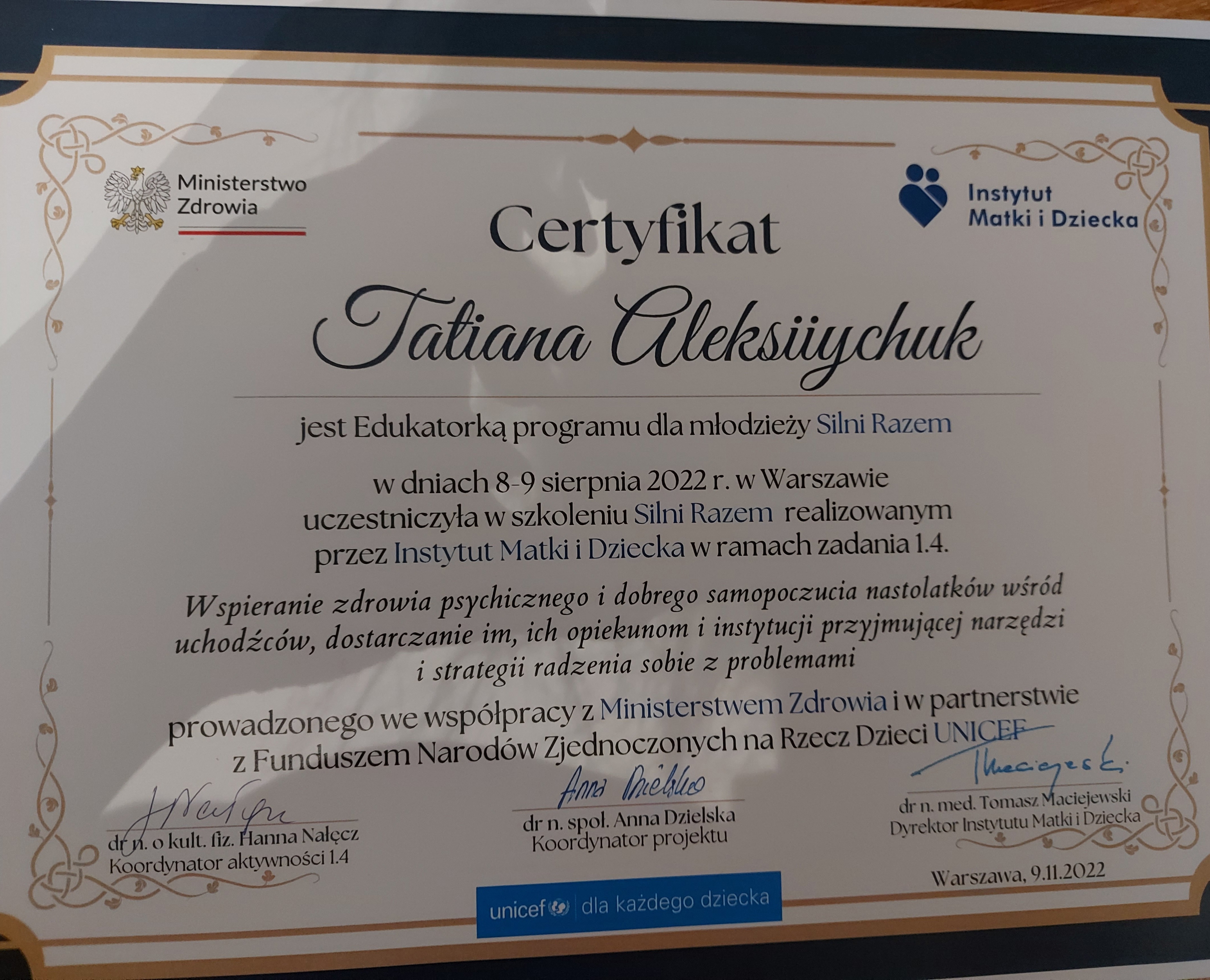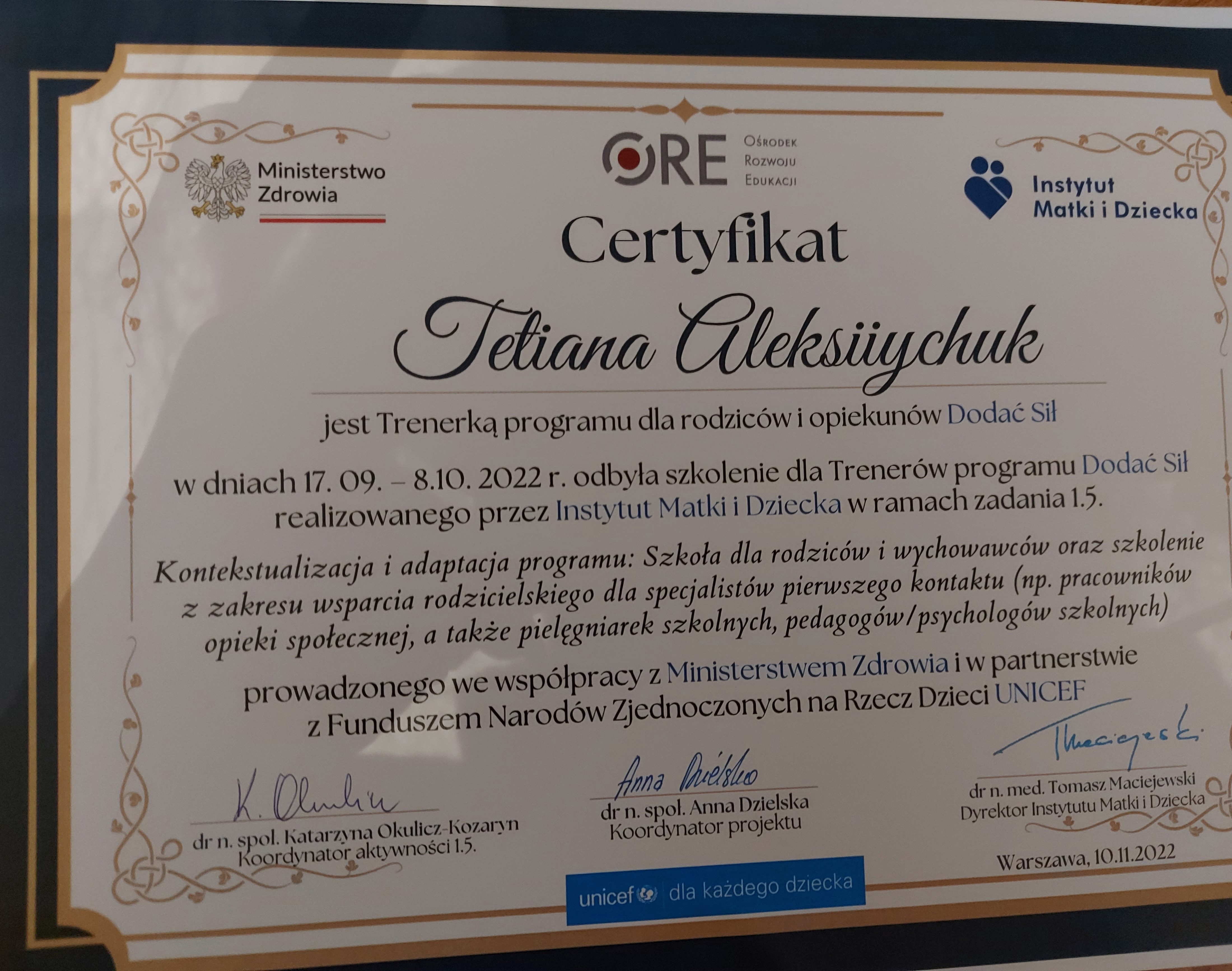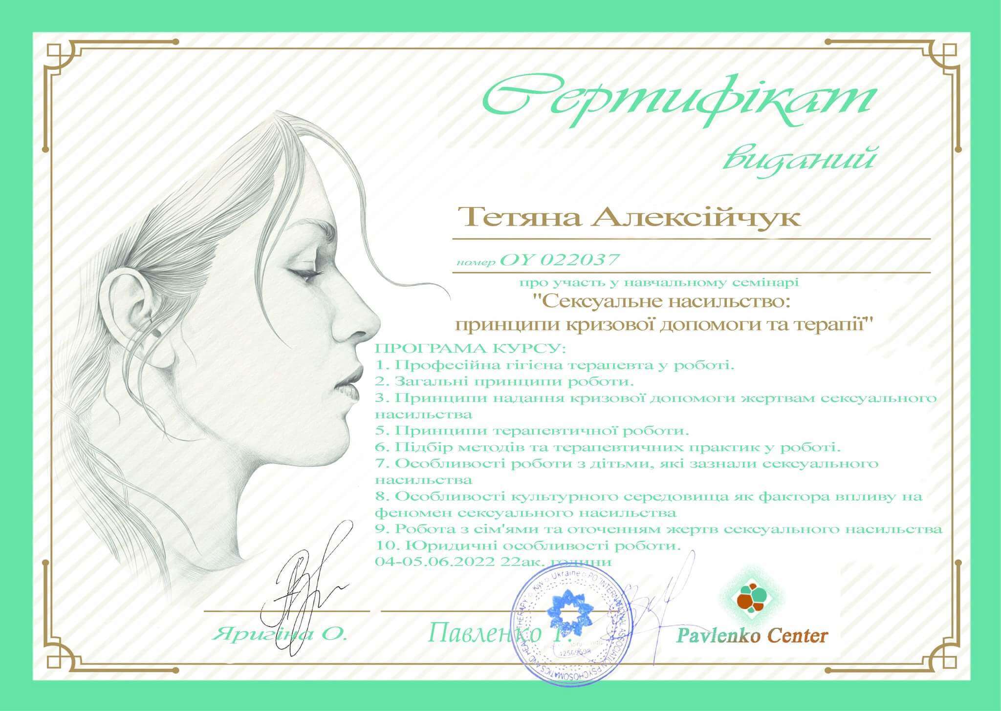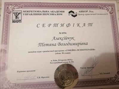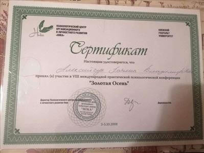 - Обучающая программа «Перинатальная психология и психотерапия» (Всеукраинский институт интегративной психологии и психотерапии, Зуева Е.А г.Москва, 2008-2009г.);