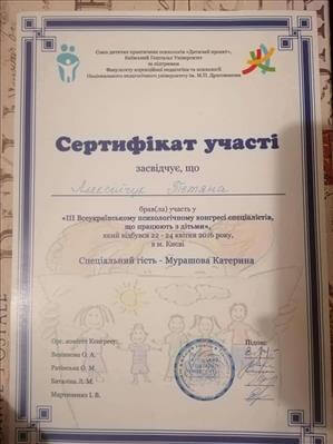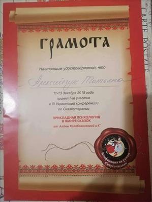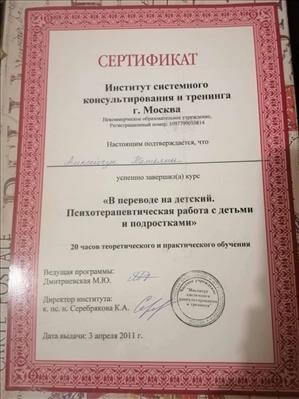 - практикум «Психотерапевтическая работа с детьми и подростками» (Институт системного консультирования и тренинга, Дмитриевская М., г.Москва, 2011г.);