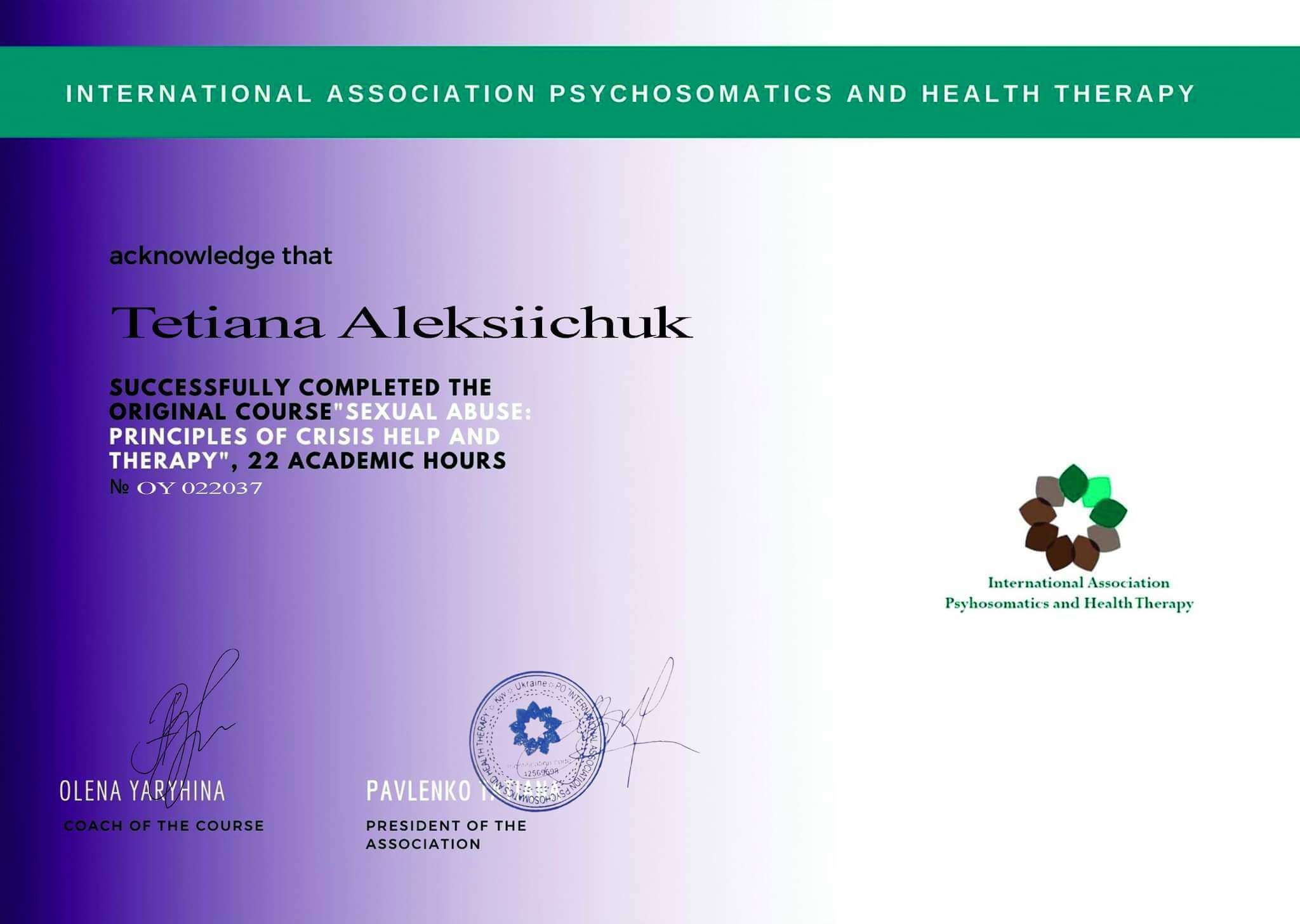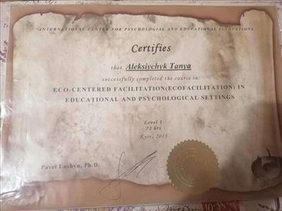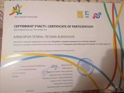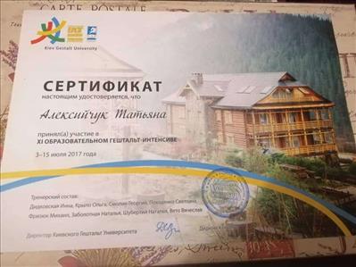 - Обучающая базовая программа по гештальт-терапии (Киевский Гештальт Университет, 1 ступень (2007-2008г),2-я ступень (2015-2020г.);