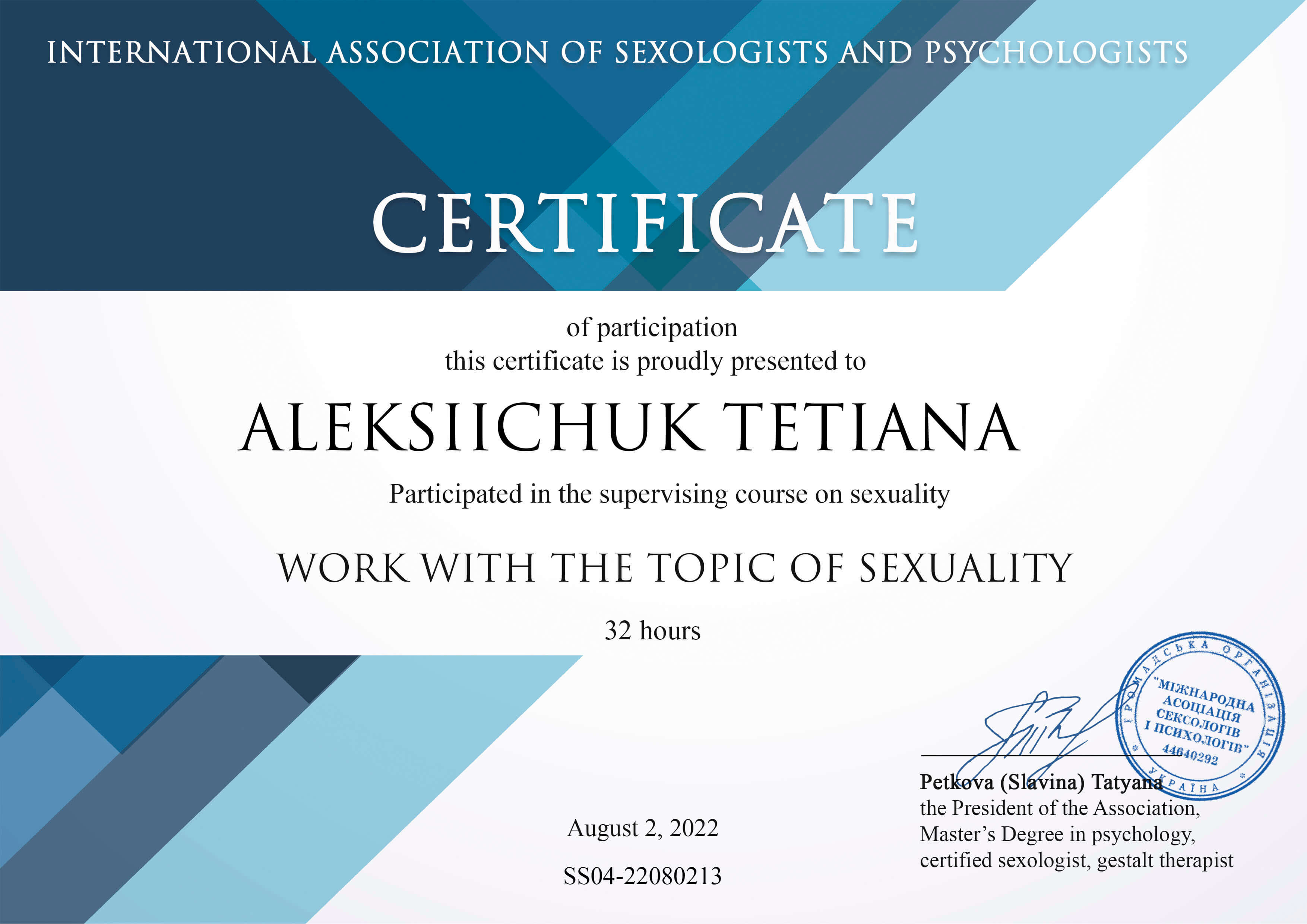 - Специализация по работе с темами сексуальности (КГУ, 2017-2019г)