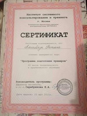 - Курс «Подготовки тренеров» (Институт системного консультирования и тренинга- (Серебрякова К., г. Москва,.2010г.);