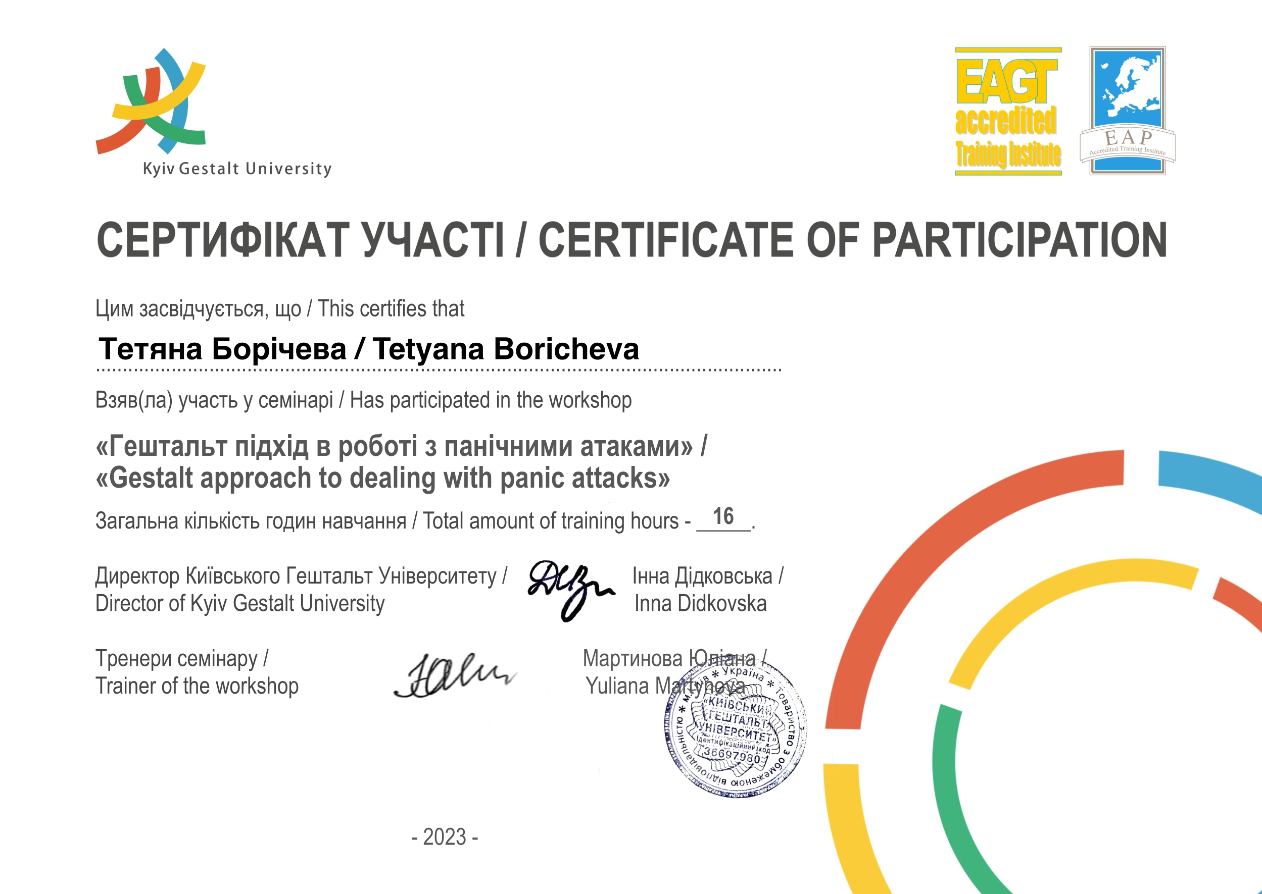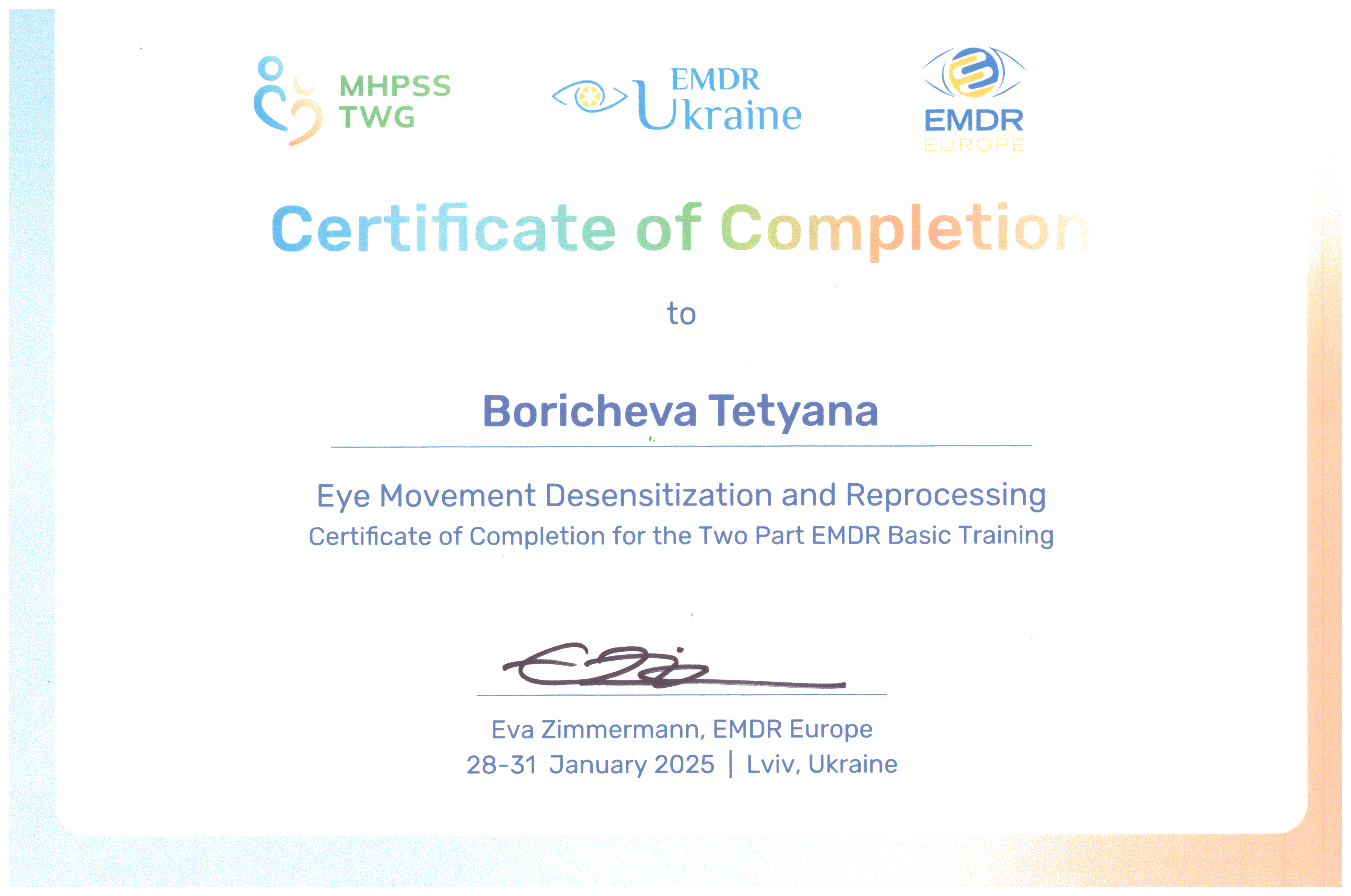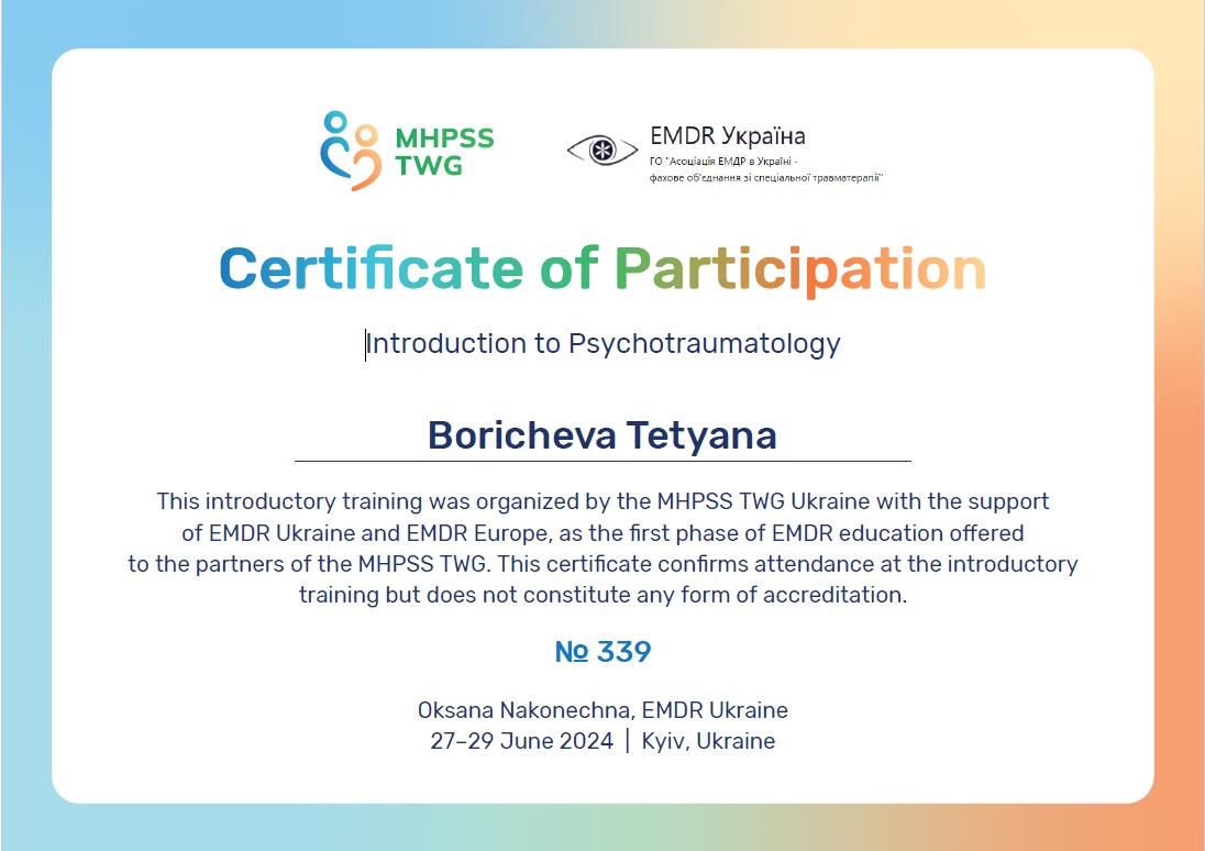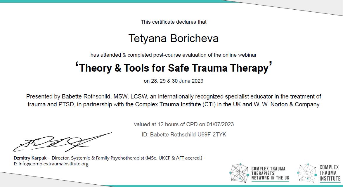 Соблюдаю Этический Кодекс Европейской Ассоциации Гештальт-терапии, EMDR-сообщества и Европейской Ассоциации Психотерапии, поскольку их активный участник.
