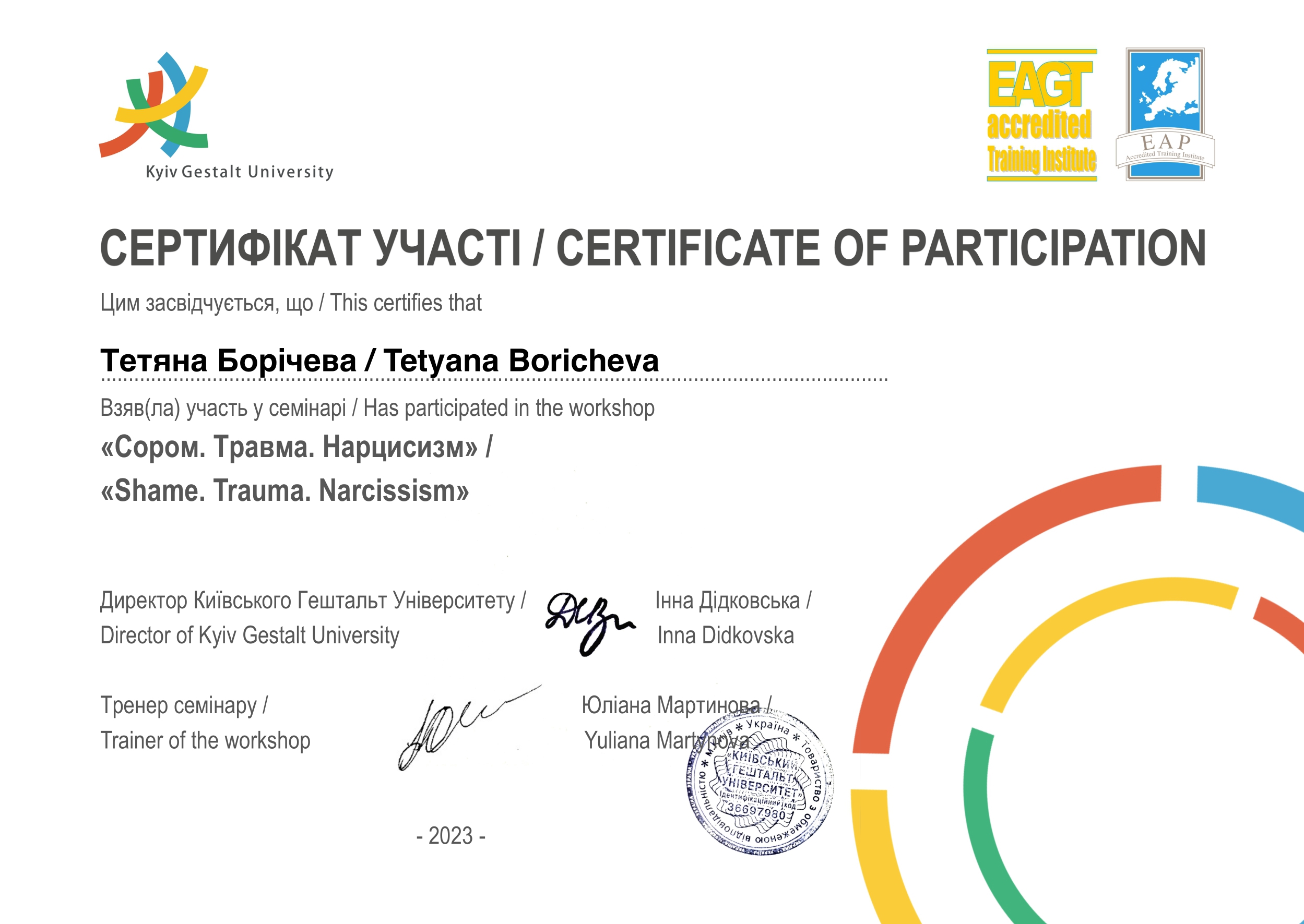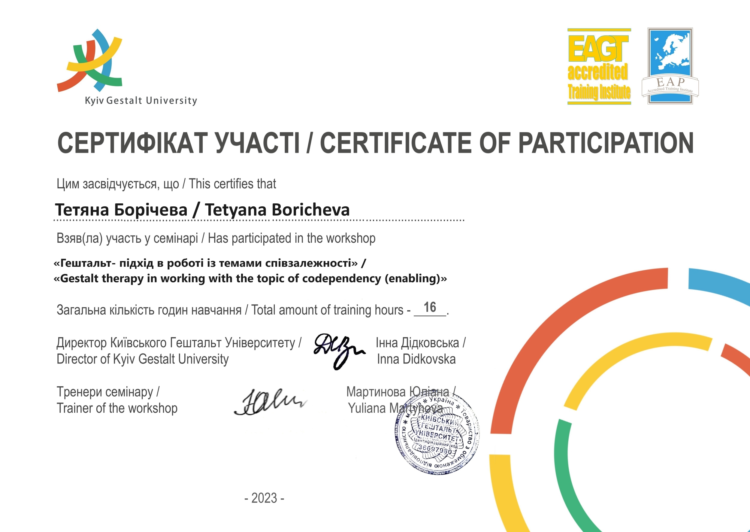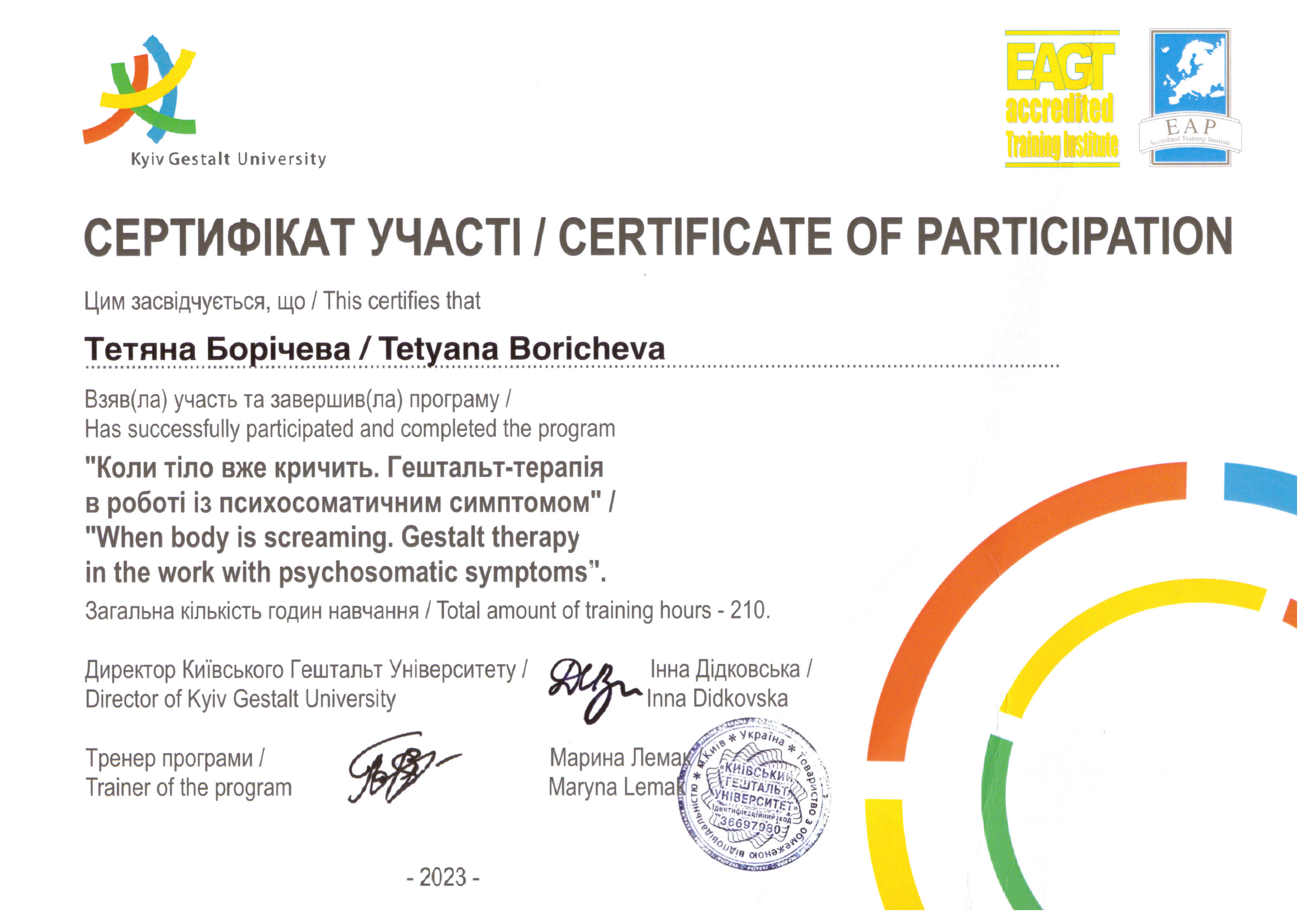 Соблюдаю Этический Кодекс Европейской Ассоциации Гештальт-терапии, EMDR-сообщества и Европейской Ассоциации Психотерапии, поскольку их активный участник.