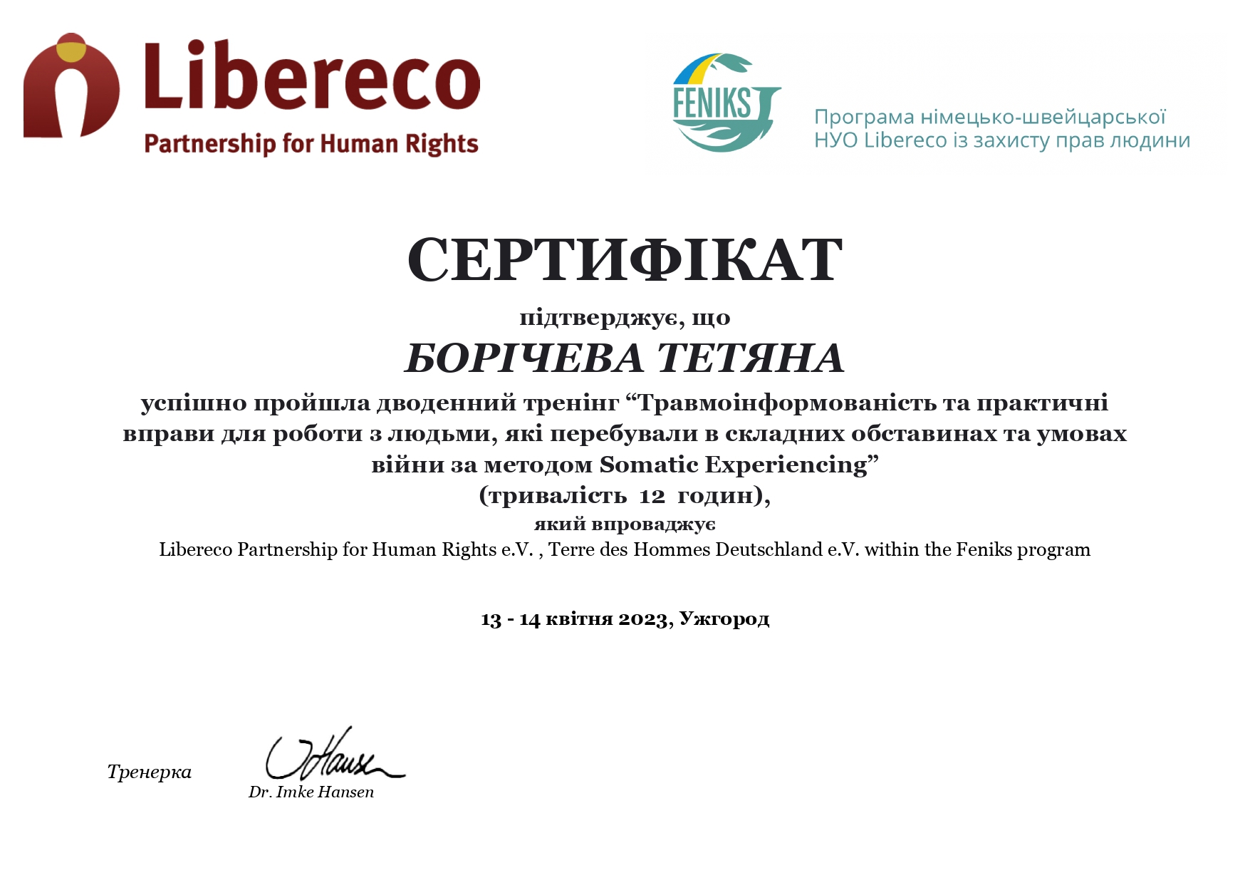 Программа немецко-швейцарской НПО Libereco по защите прав человека: