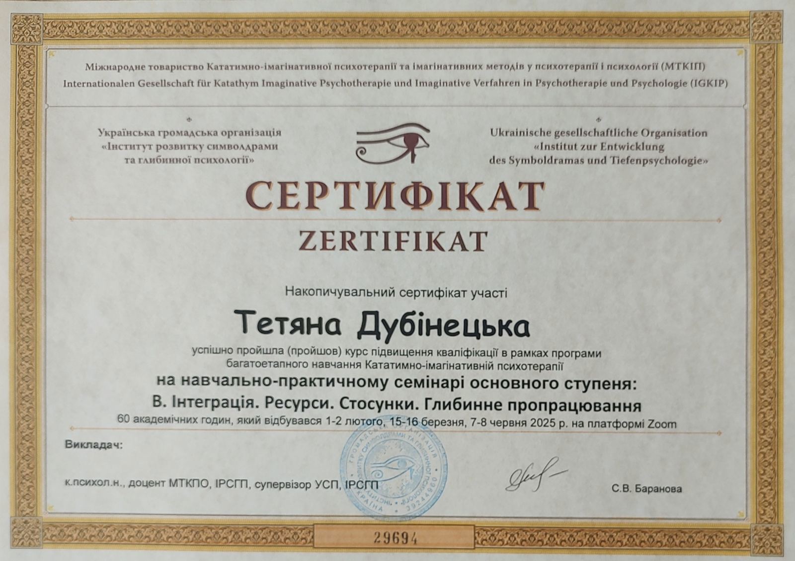 Рада приветствовать! Меня зовут Татьяна. В психологию пришла не сразу. Есть медицинское образование, я врач, а тайный мир психологии интересовал меня очень давно, поэтому я получила второе высшее образование по специальности "Кризисная психология". Постоянно повышаю квалификацию, обучаясь в Институте развития символдрамы и глубинной психологии, изучая метод символдрама, являющийся глубинным методом работы с воображением и помогающий безопасно проявлять и проживать бессознательные желания, травмы, конфликты. Считаю, что у каждого есть все необходимые инструменты для внутренних изменений, моя цель - помочь их найти.