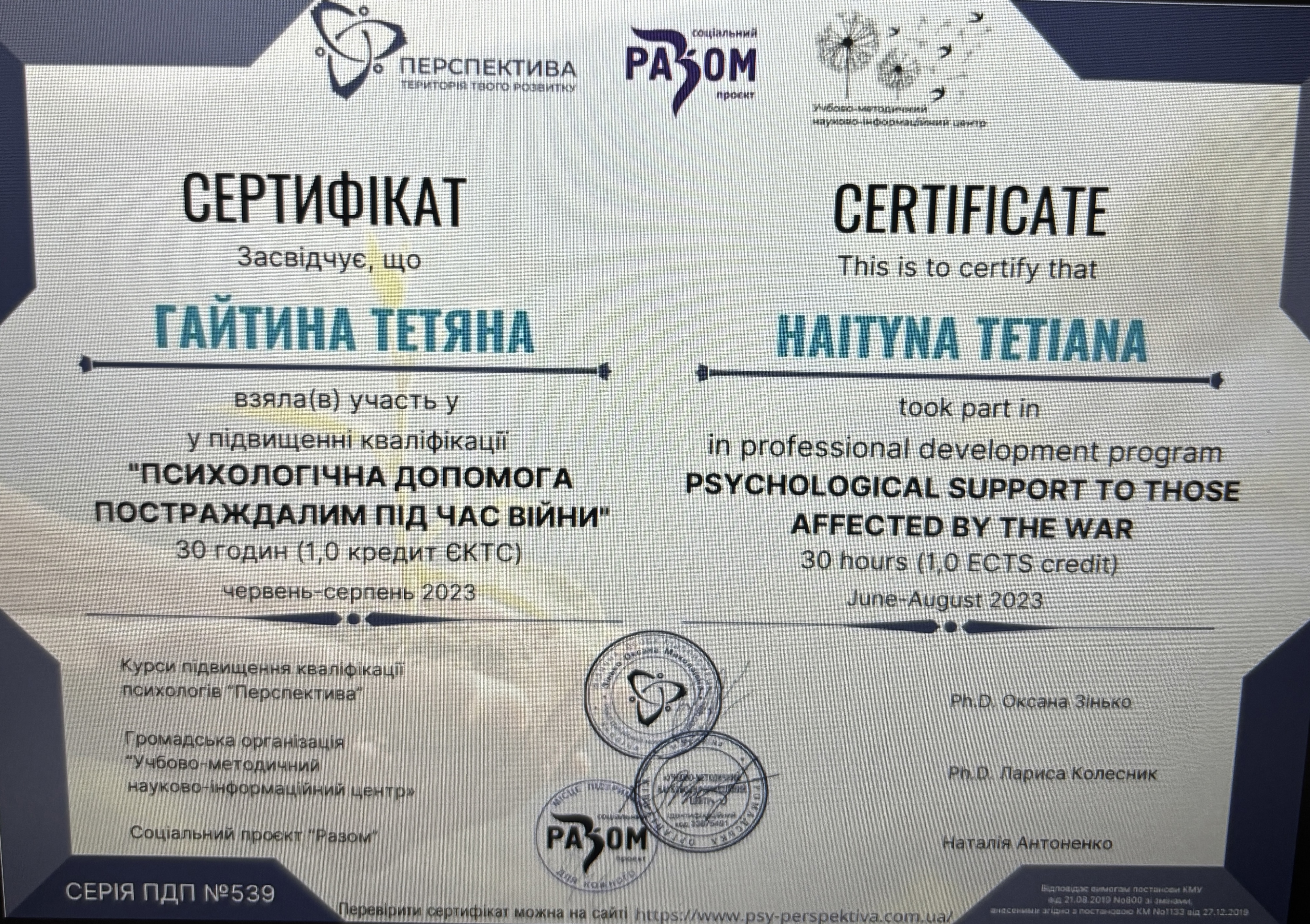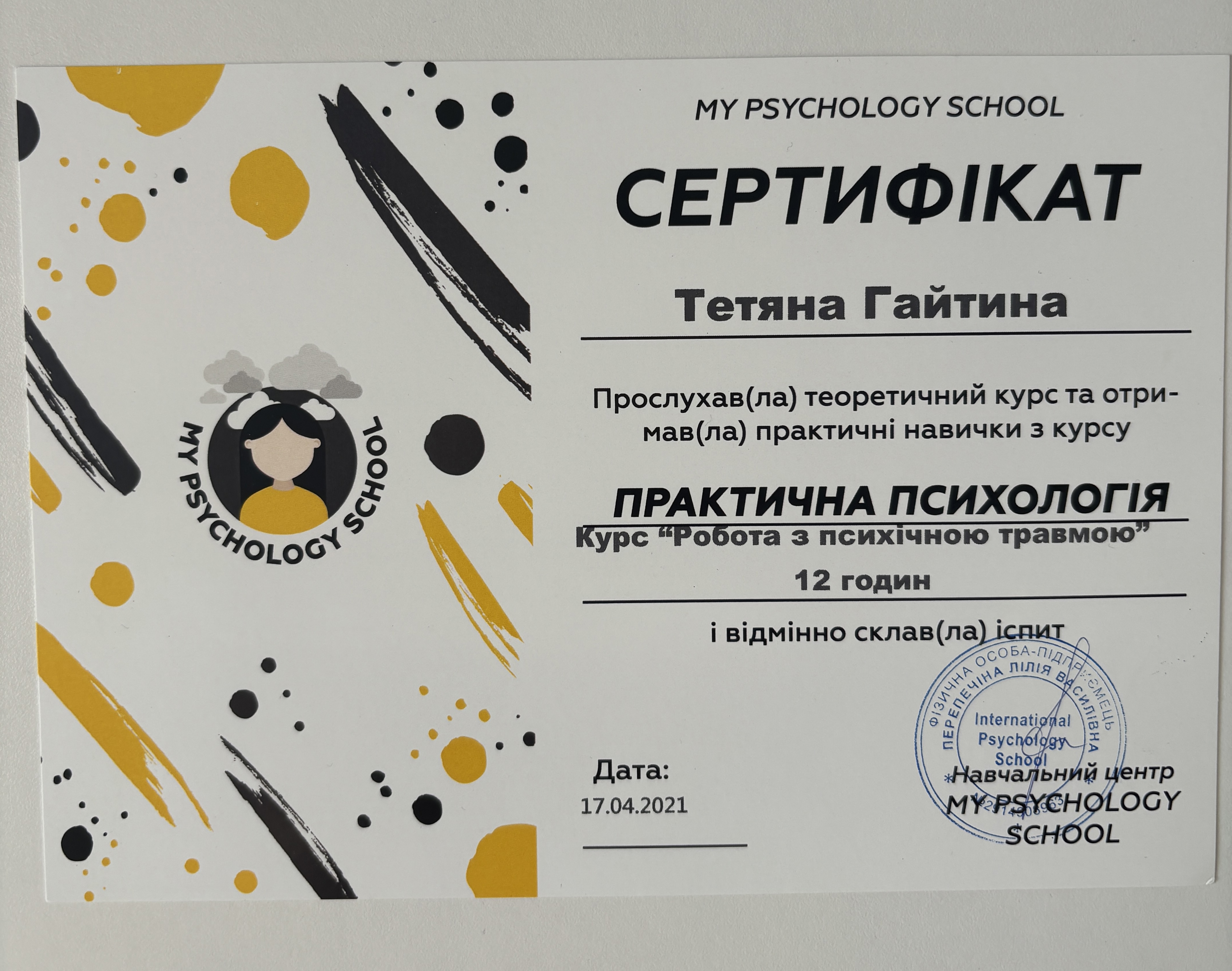 Постоянно повышаю квалификацию, так как считаю обучение ключом к профессионализму. Сейчас получаю последипломное образование на клинического психолога и травмотерапевта. свои истории.
