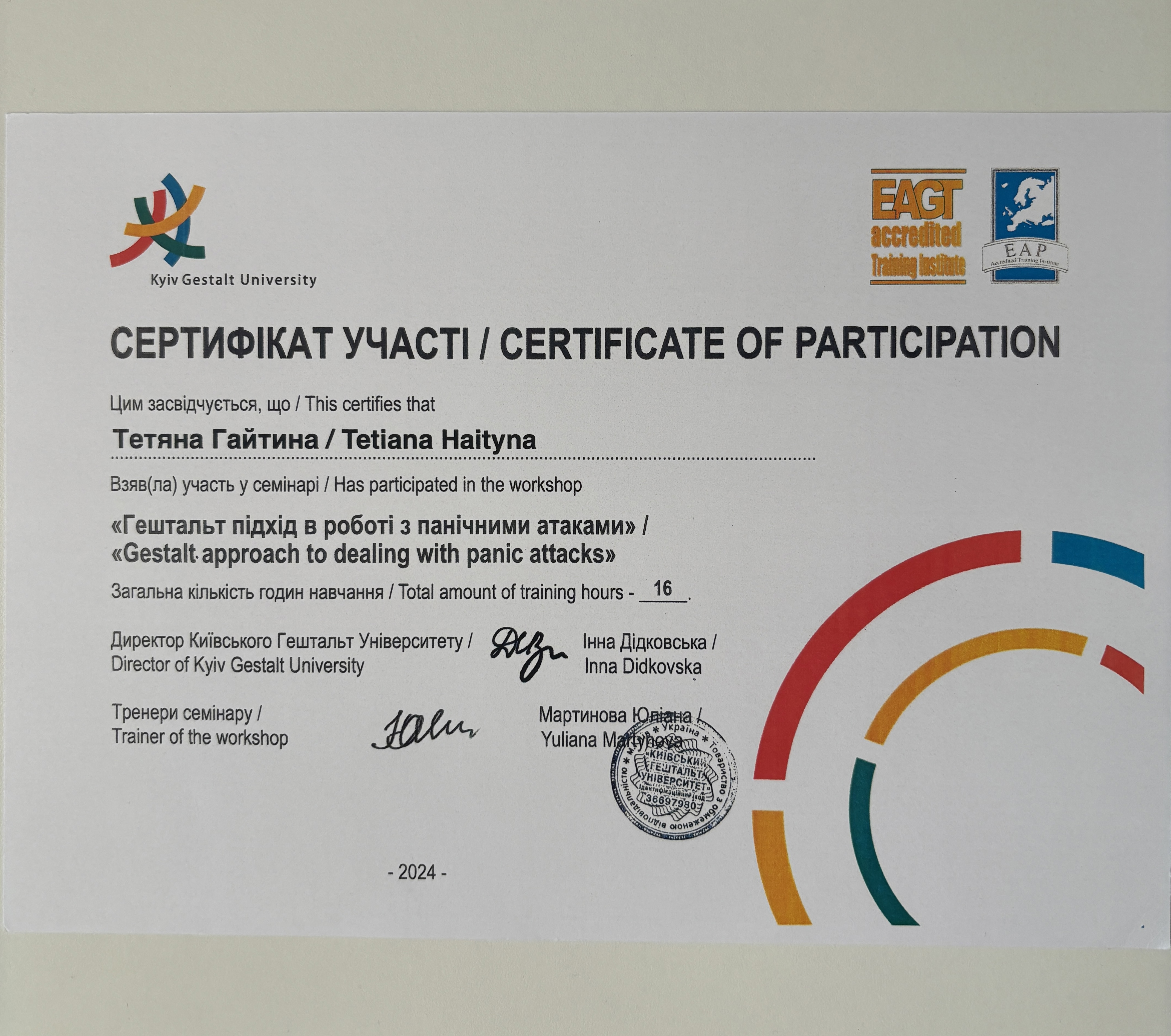 В мае 2025 года завершила 1 ступень гештальт терапии.