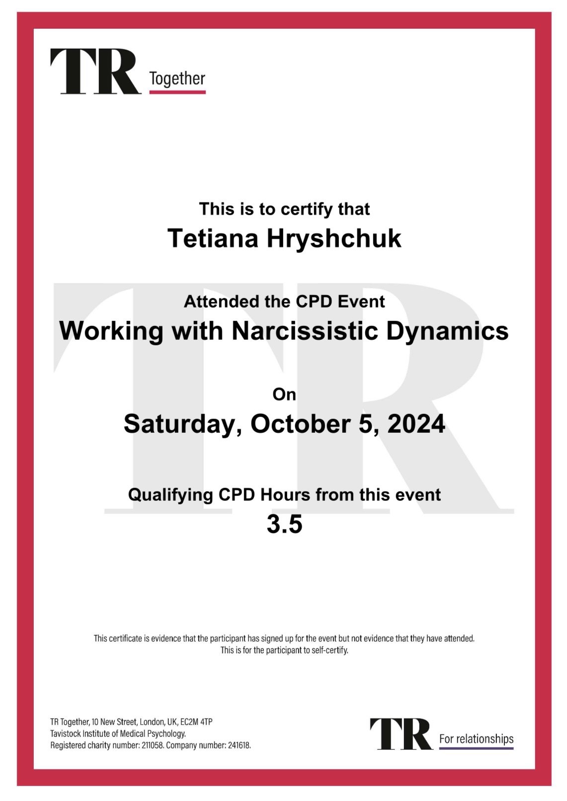 Кроме того, с 2024 года являюсь участником обучающих мероприятий, проходящих на платформе TRTogether, ведущей психологической общности Великобритании Tavistock Relationships, специализирующейся на терапии пар. , а также лекцию Мэри Морган «Психоаналитическое понимание отношений в паре».