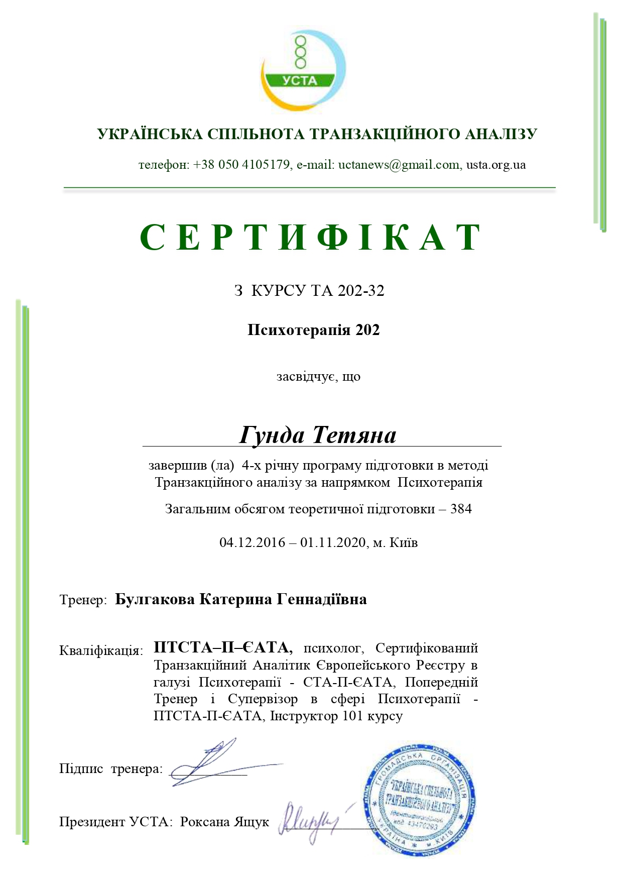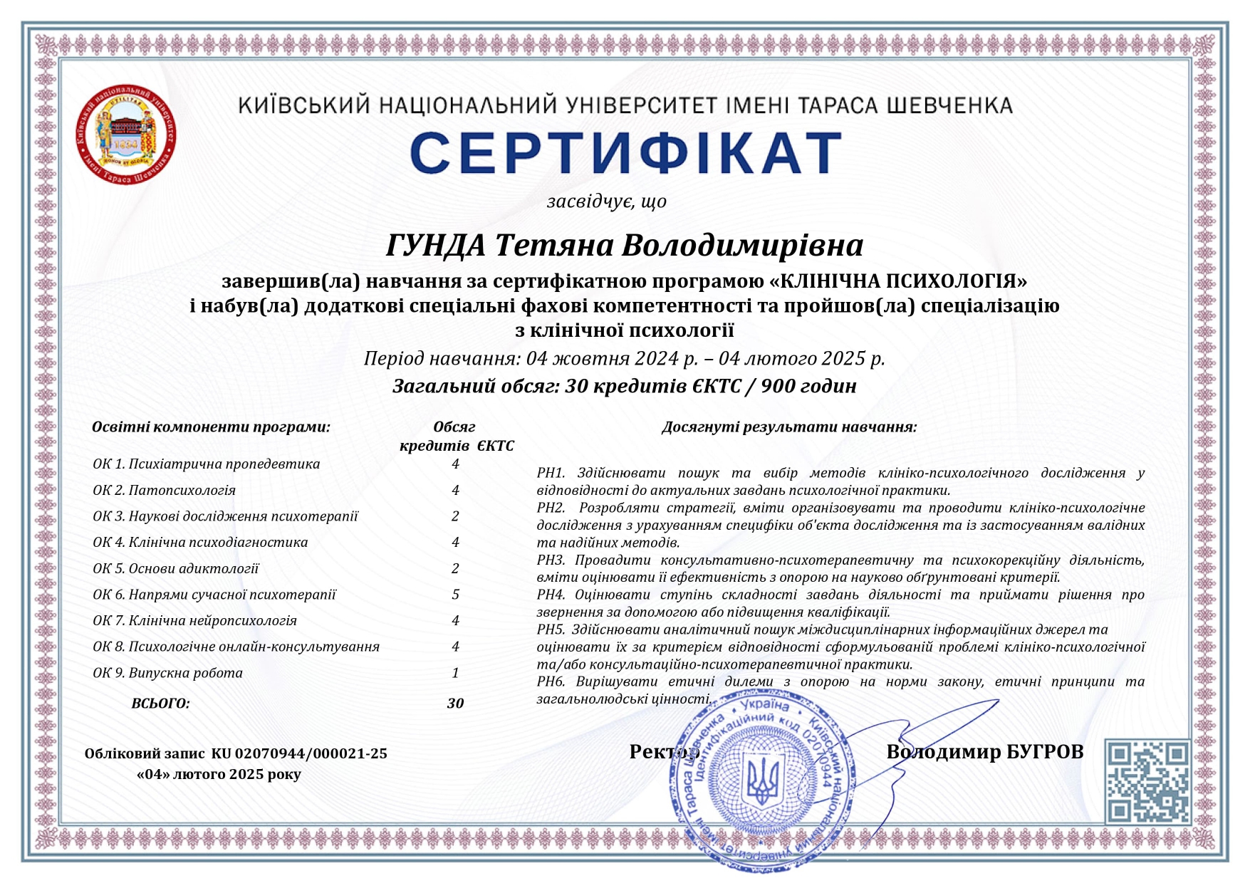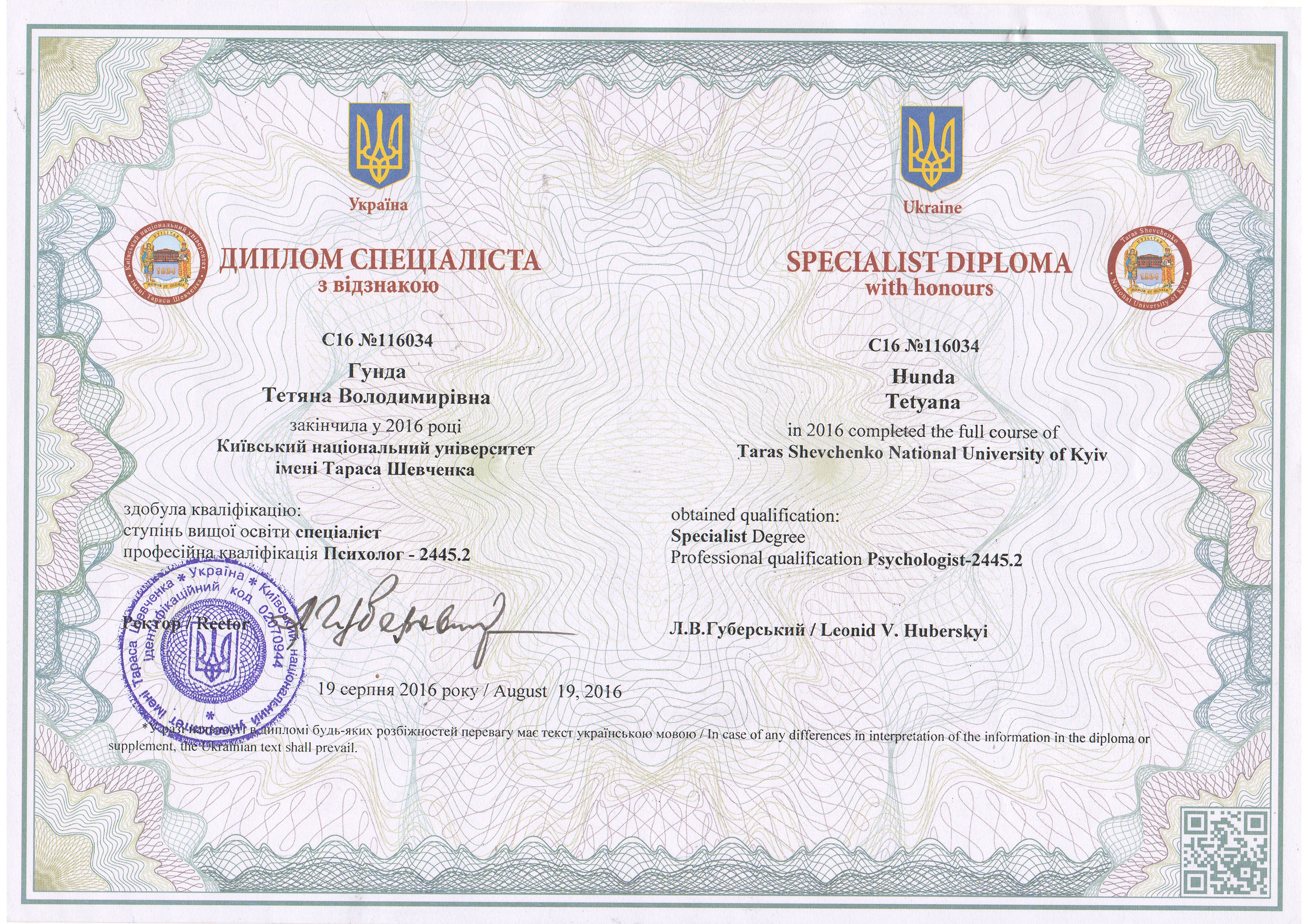 2016- Диплом с отличием КНУ им. Т.Шевченко , спец. Психолог 2445.2