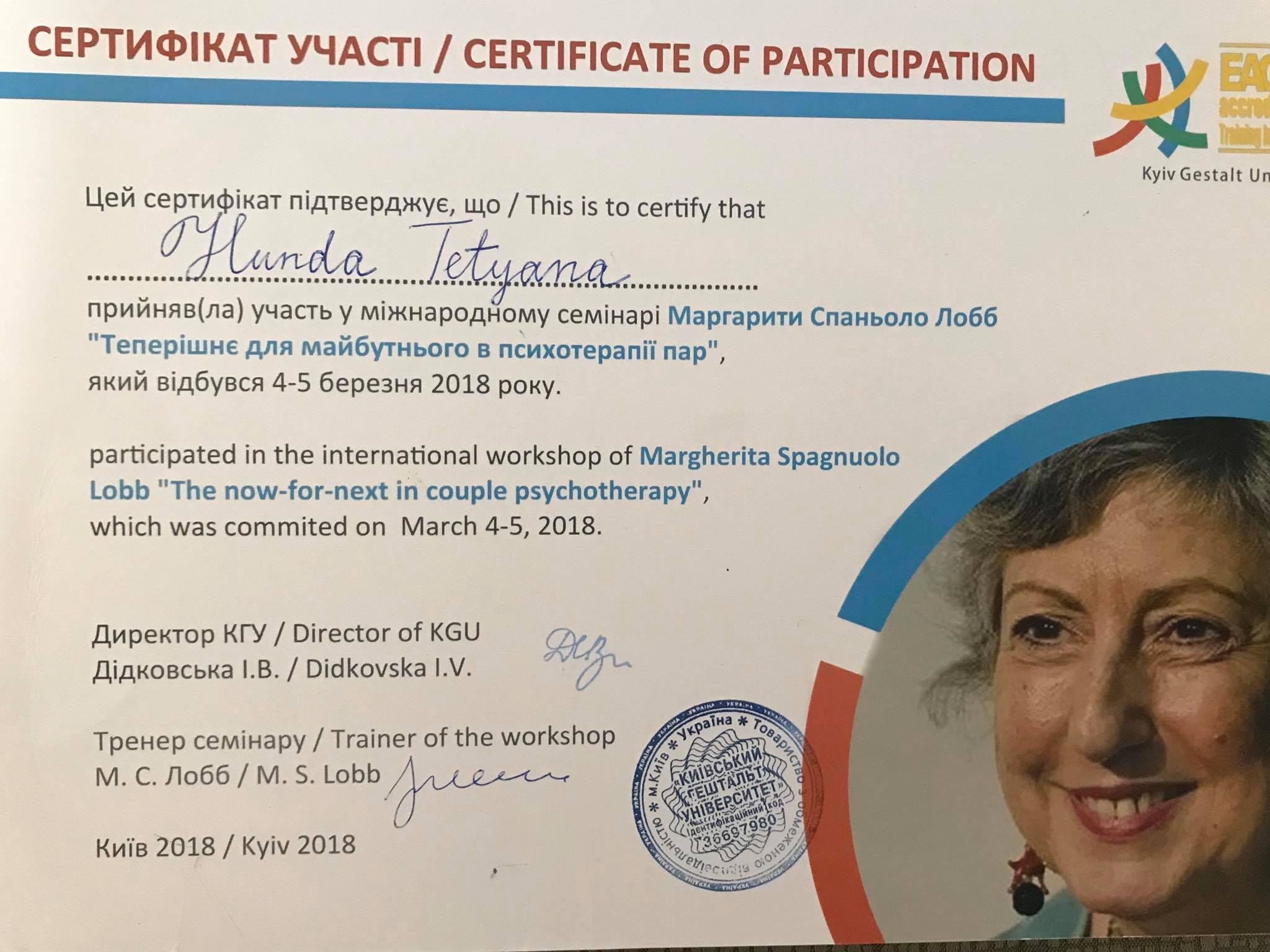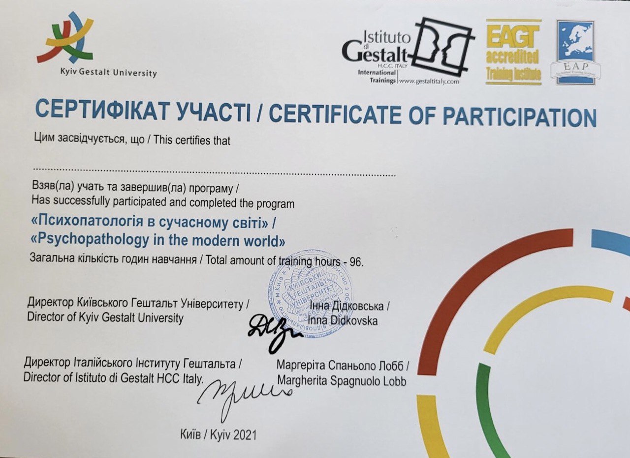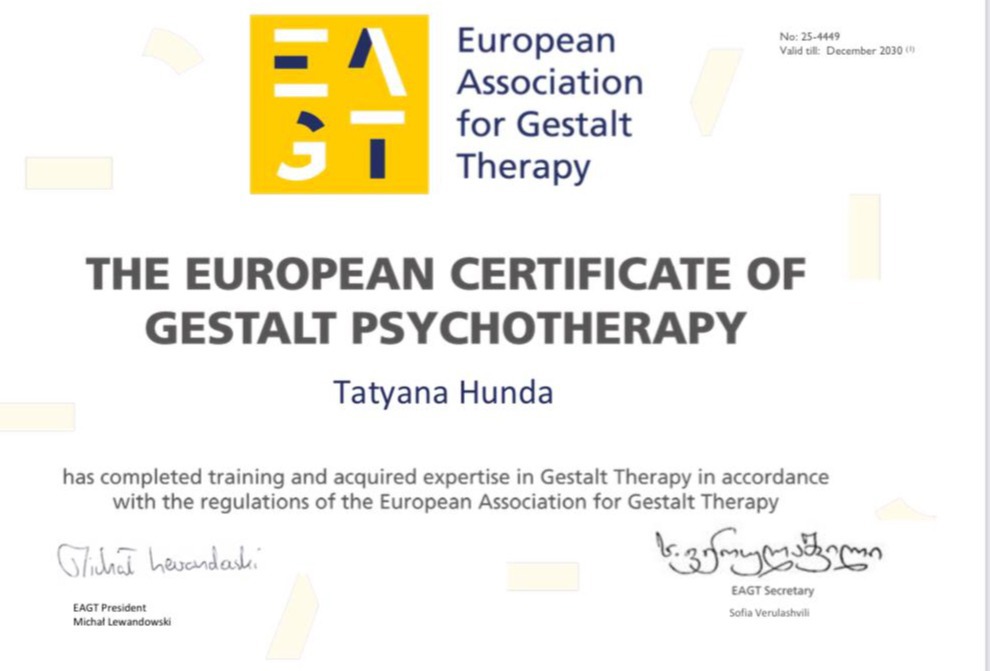 Меня зовут Татьяна и я сертифицированный Гештальт-терапевт, в обучении в программе 3-ступени (супервизор, тренер): ВОППГП и Французского института Гештальт терапии; Trainee for ;