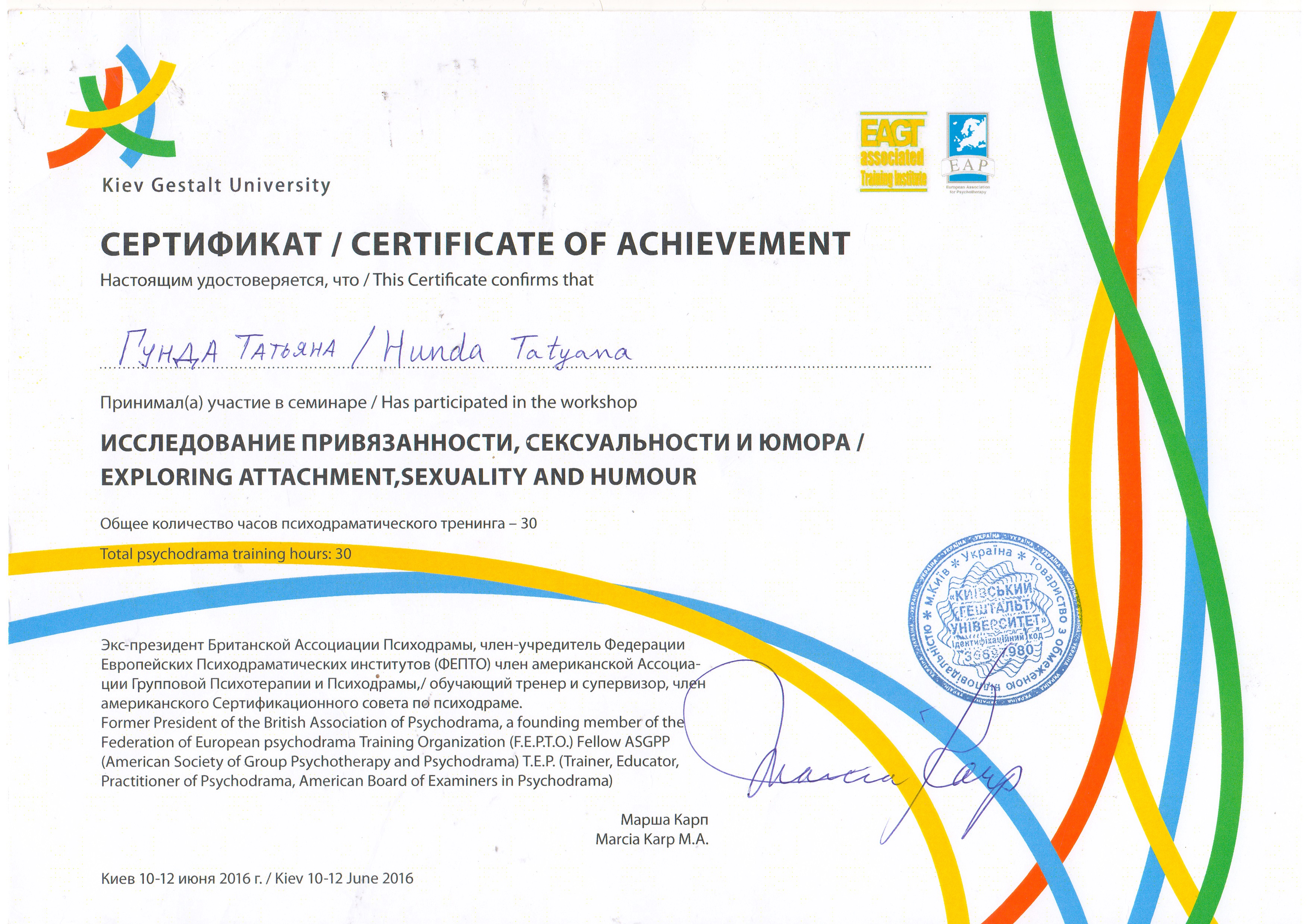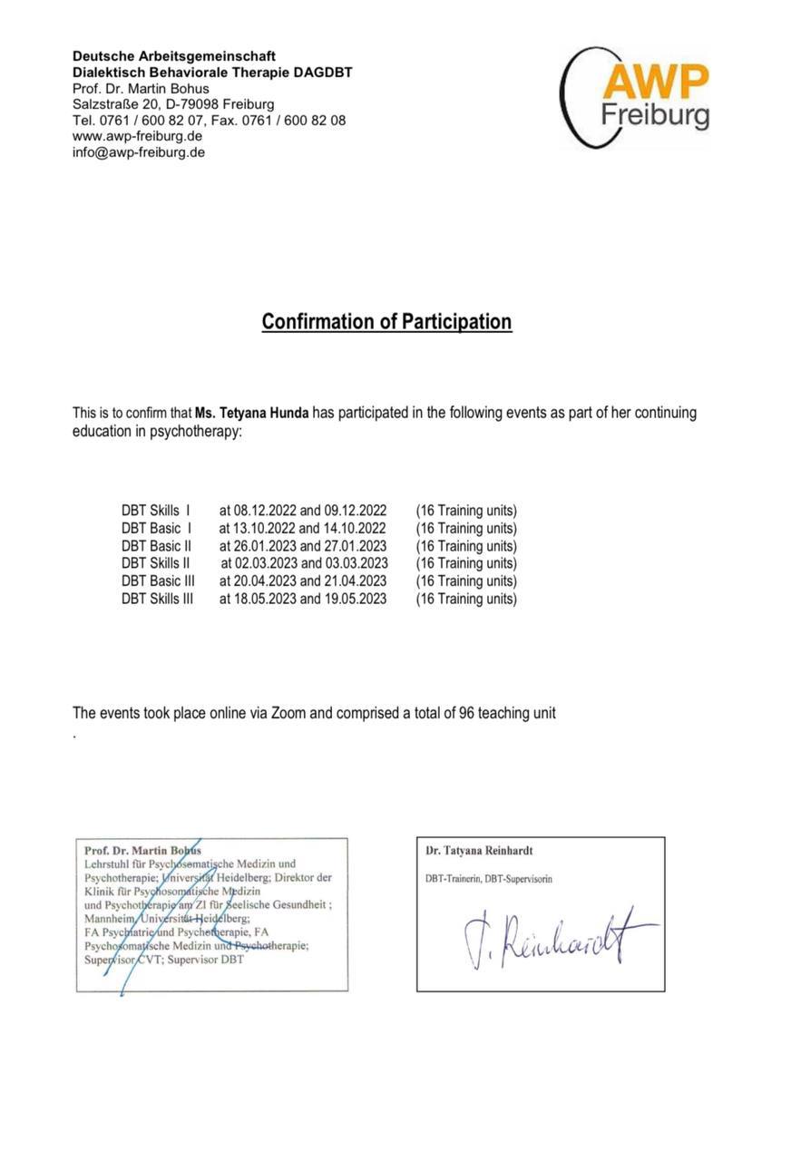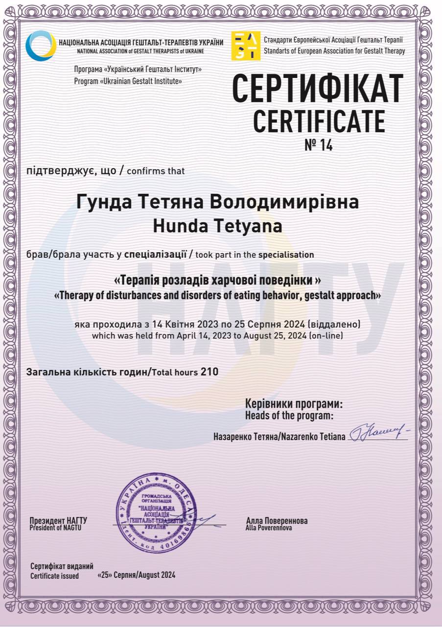 Меня зовут Татьяна и я сертифицированный Гештальт-терапевт, в обучении в программе 3-ступени (супервизор, тренер): ВОППГП и Французского института Гештальт терапии; Trainee for ;