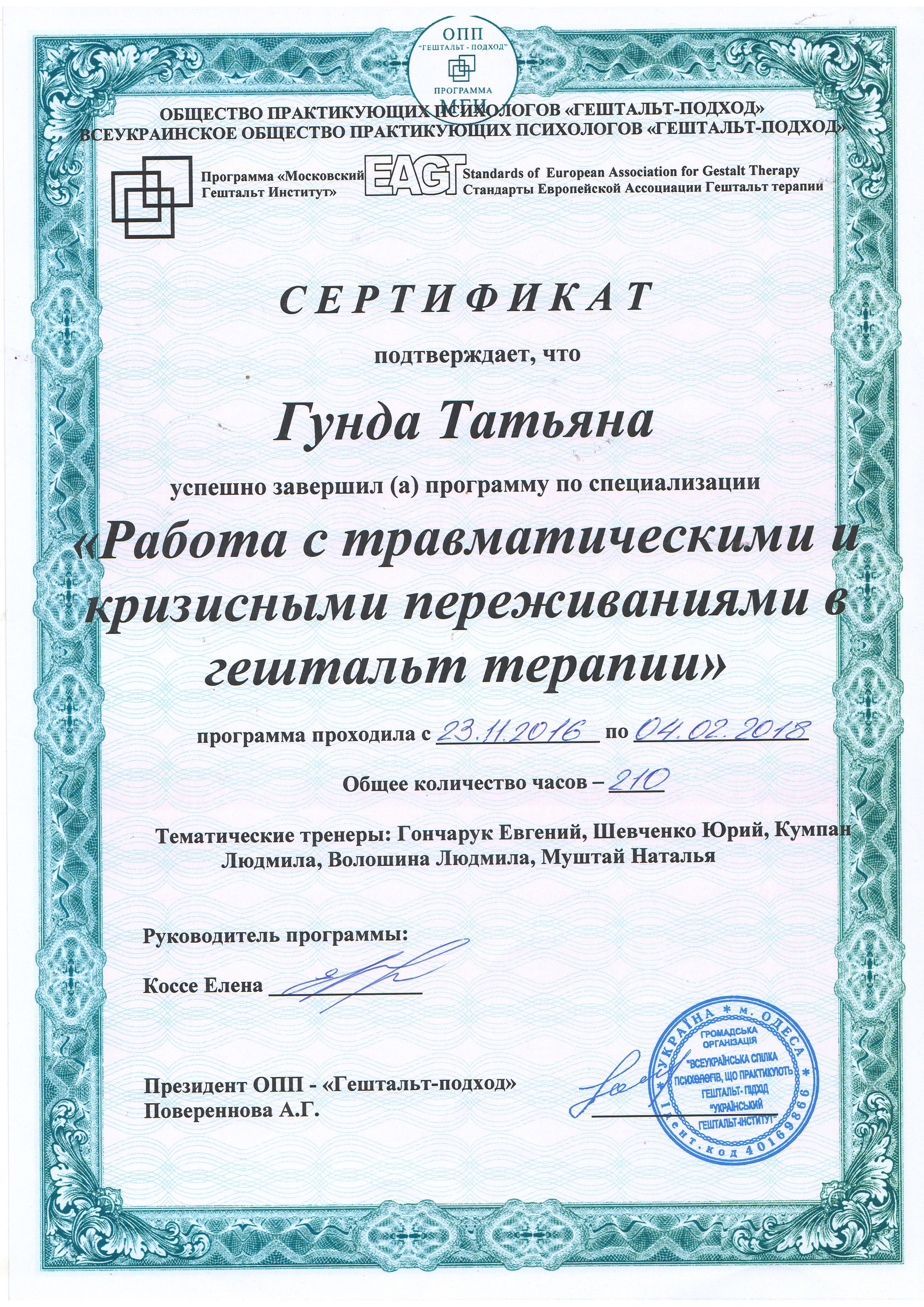 III ступень «Совершенствование в гештальт-терапии" МГИ (супервизор, ведущий групп, тренер)