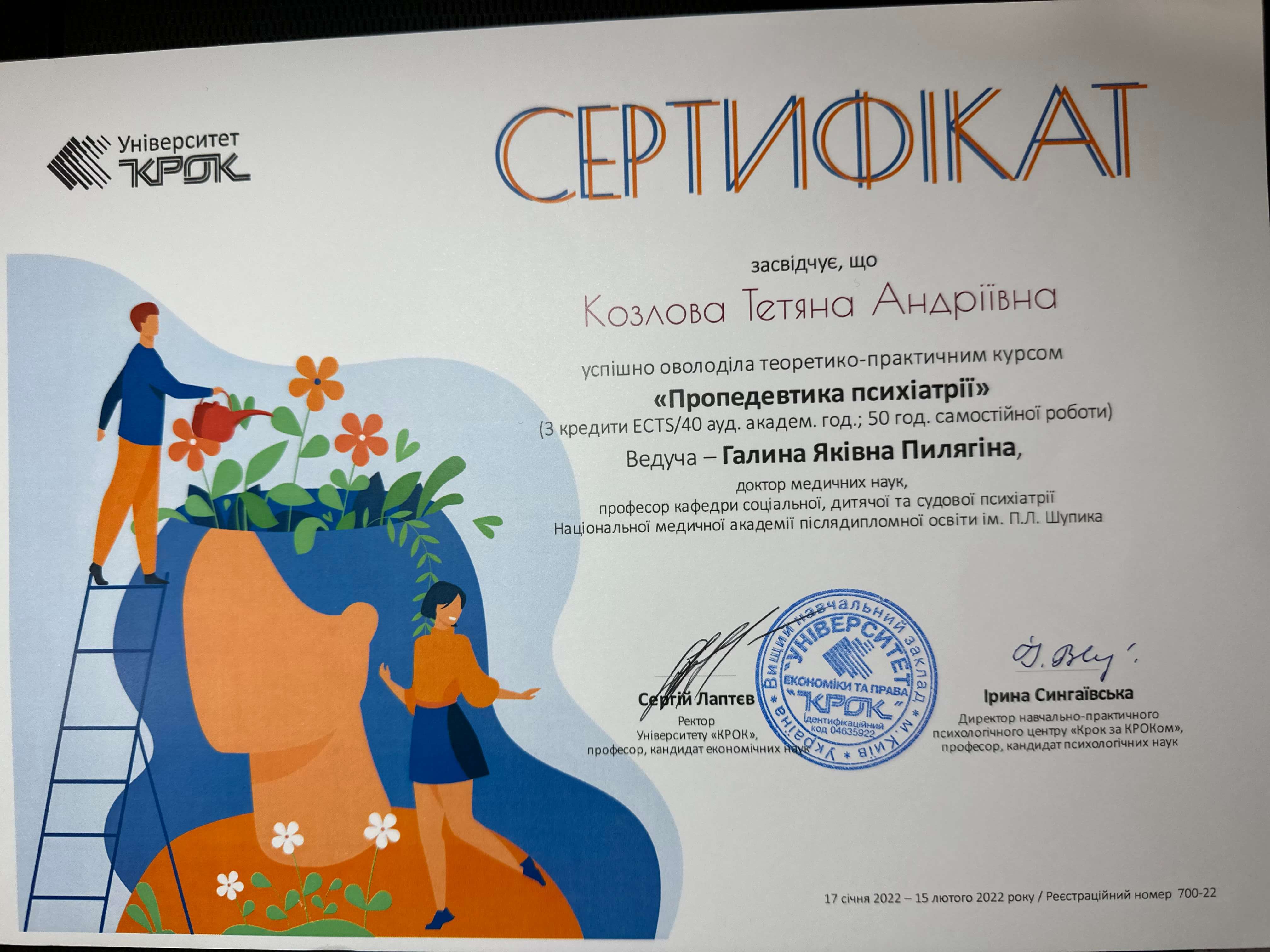 - Украинский союз Психотерапевтов (УСП) – пропедевтика психиатрии;