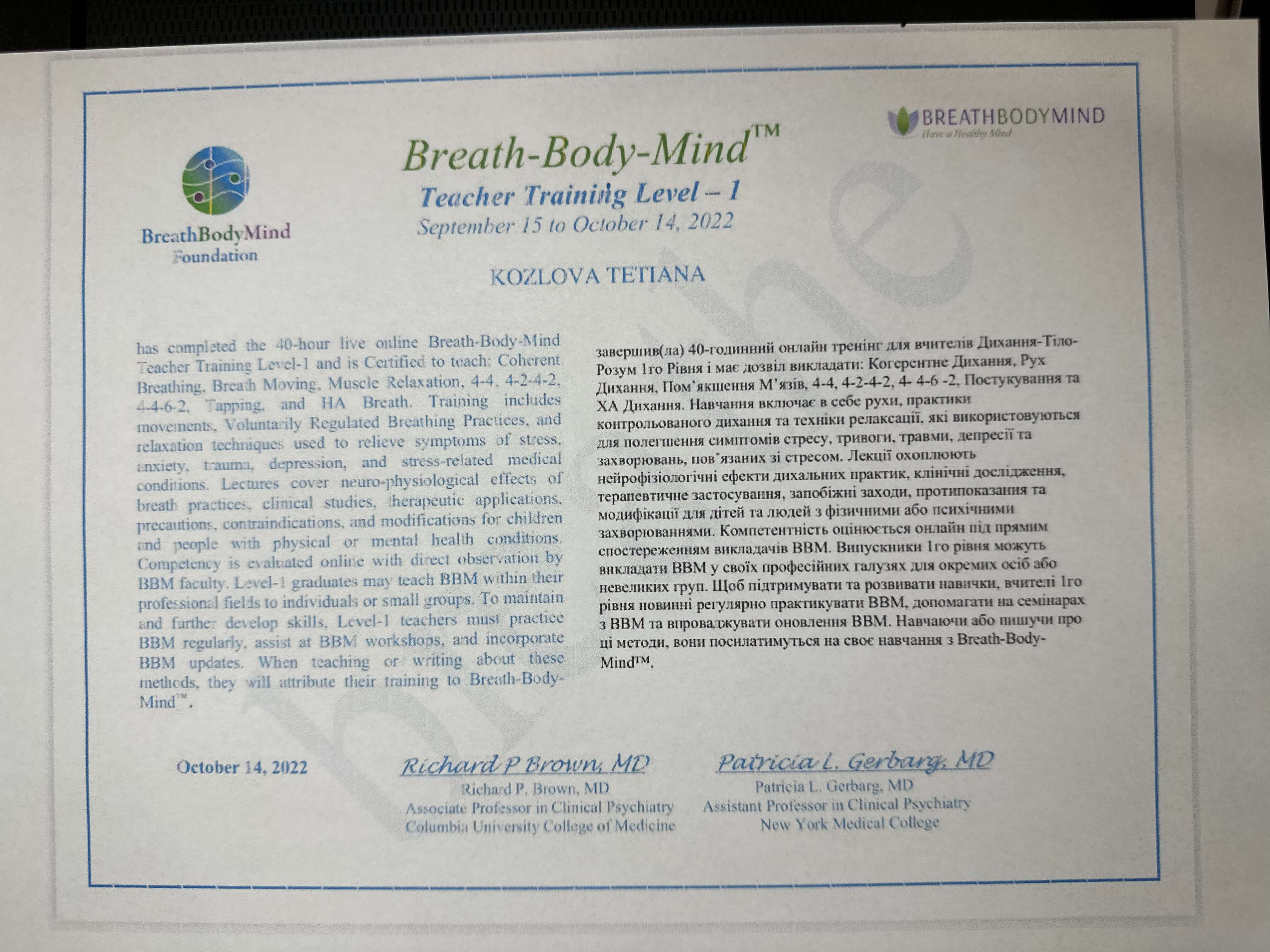 - Breath-Body-Mind – тренер 1-го уровня по когерентному дыханию;