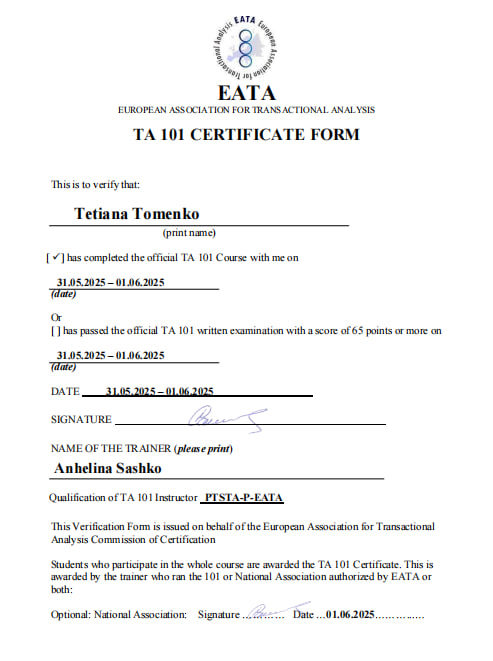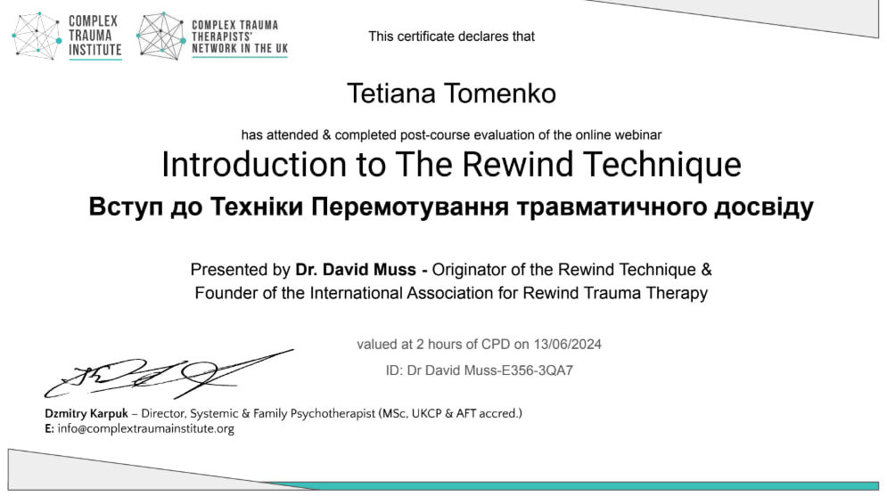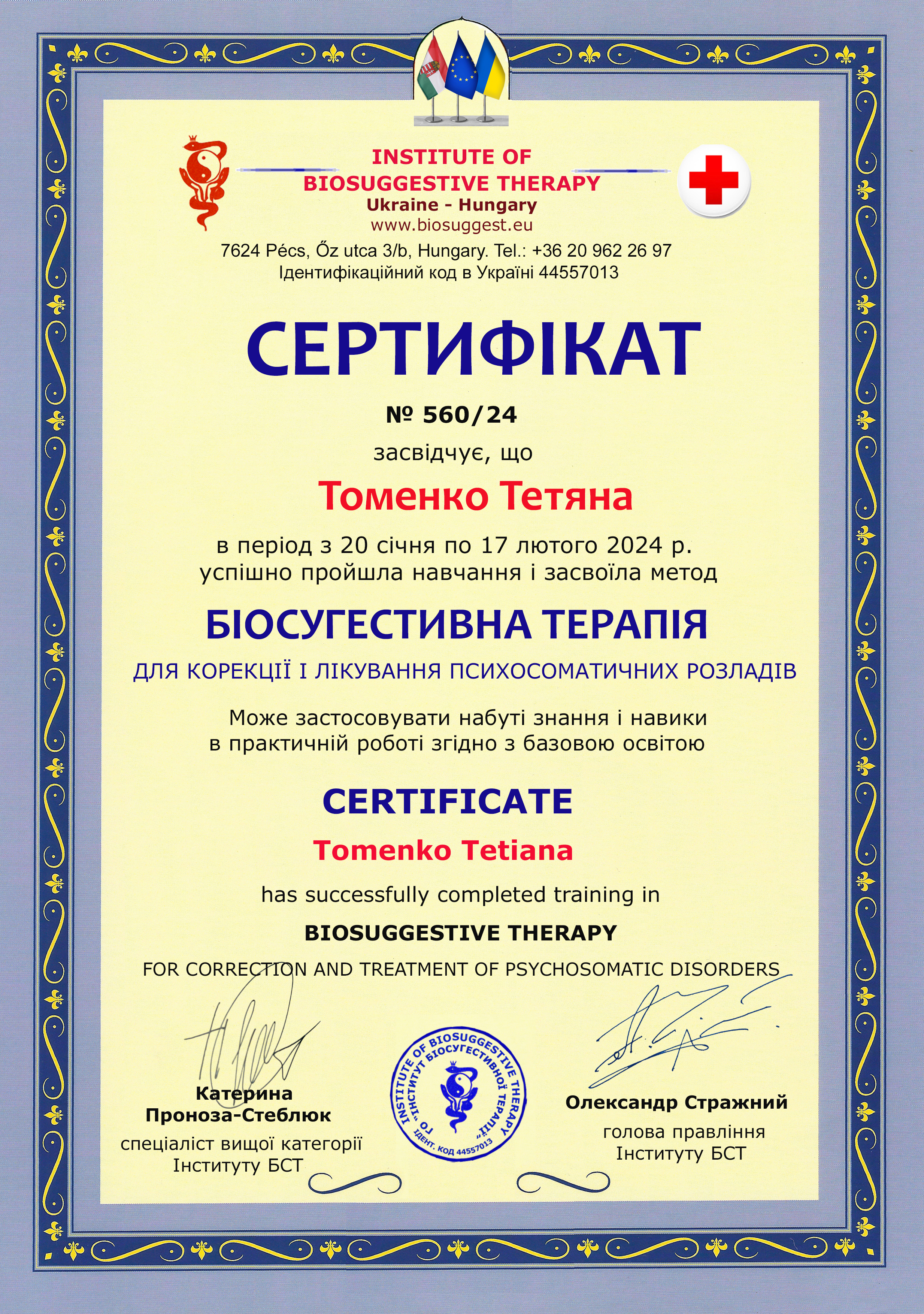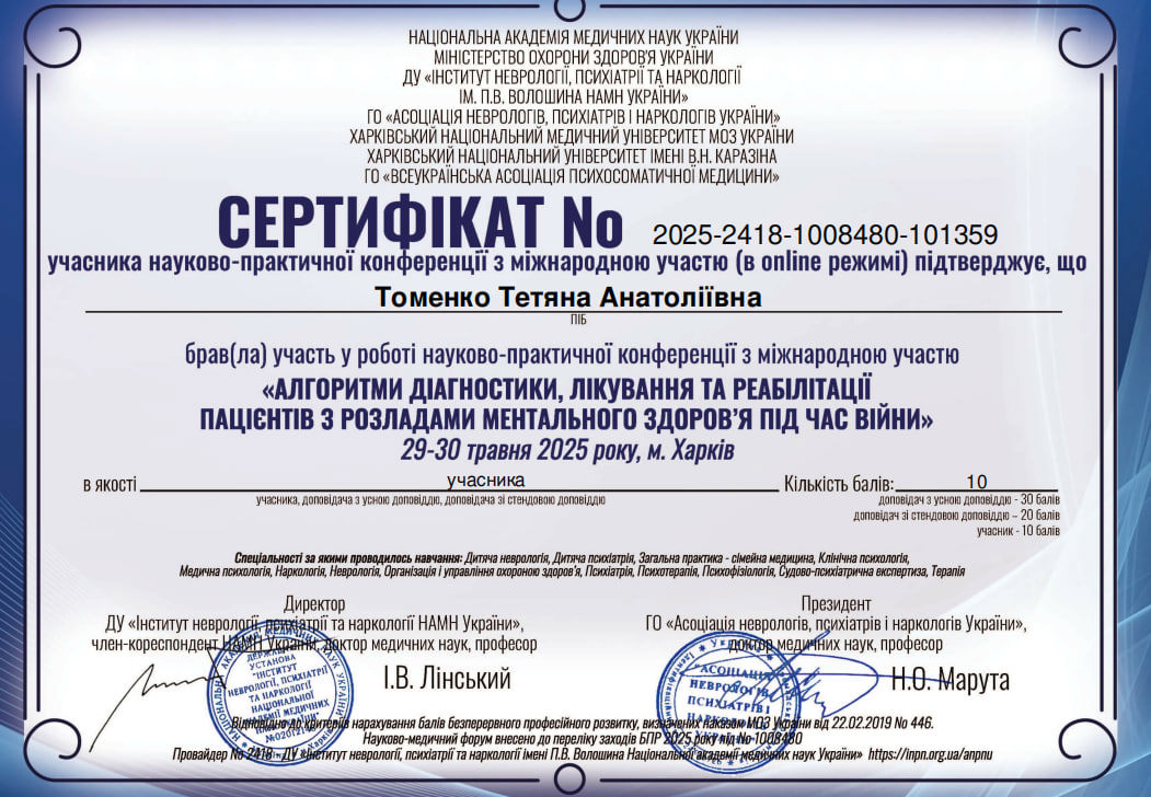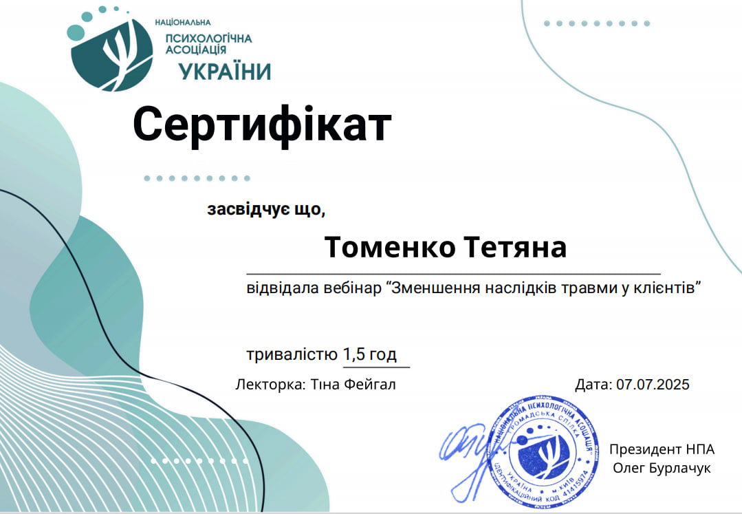Окончила в декабре 2024 года НТУ "ХПИ" по специальности 053 психология. В феврале 2024 года сертифицировалась в методе биосугестивной терапии. В сентябре 2025 года окончила циклы специализации "Клиническая психология" и пропедевтика психических заболеваний. Сейчас обучают на базовых курсах Логотерапии и Положительной психотерапии Пезешкиана, а также нейробиология травмы, ее диагностирование в международном институте изучения травмы. Прошла обучение в январе 2025 года по программе mhGAP и МКФ. Изучала телесно-ориентированные подходы Бабетт Ротщильд, TRE, метод Дэвида Мусса Ревайнд по переработке травматических воспоминаний, метод эмоционального освобождения EFT, КПТ, помощь в горении по 8-шаговой программе, онлайн программа Лиз Глиссон по вопросам потерь и горения здоровье от НПА, членом которой я являюсь.