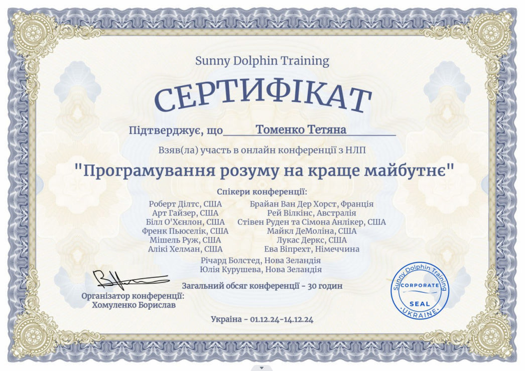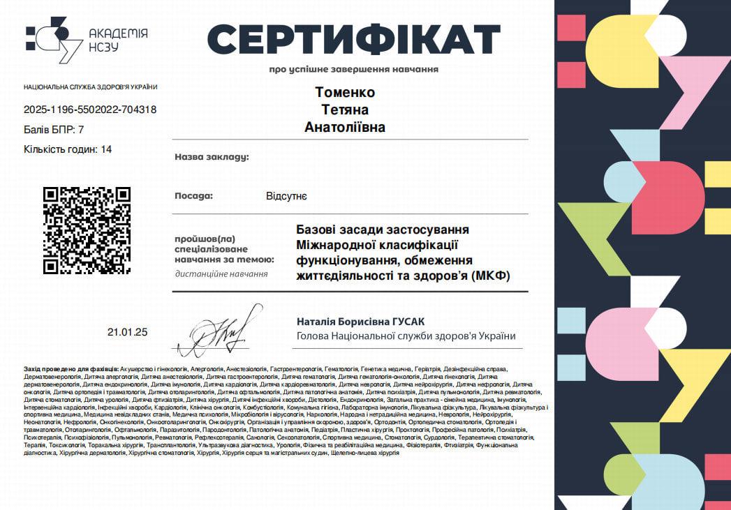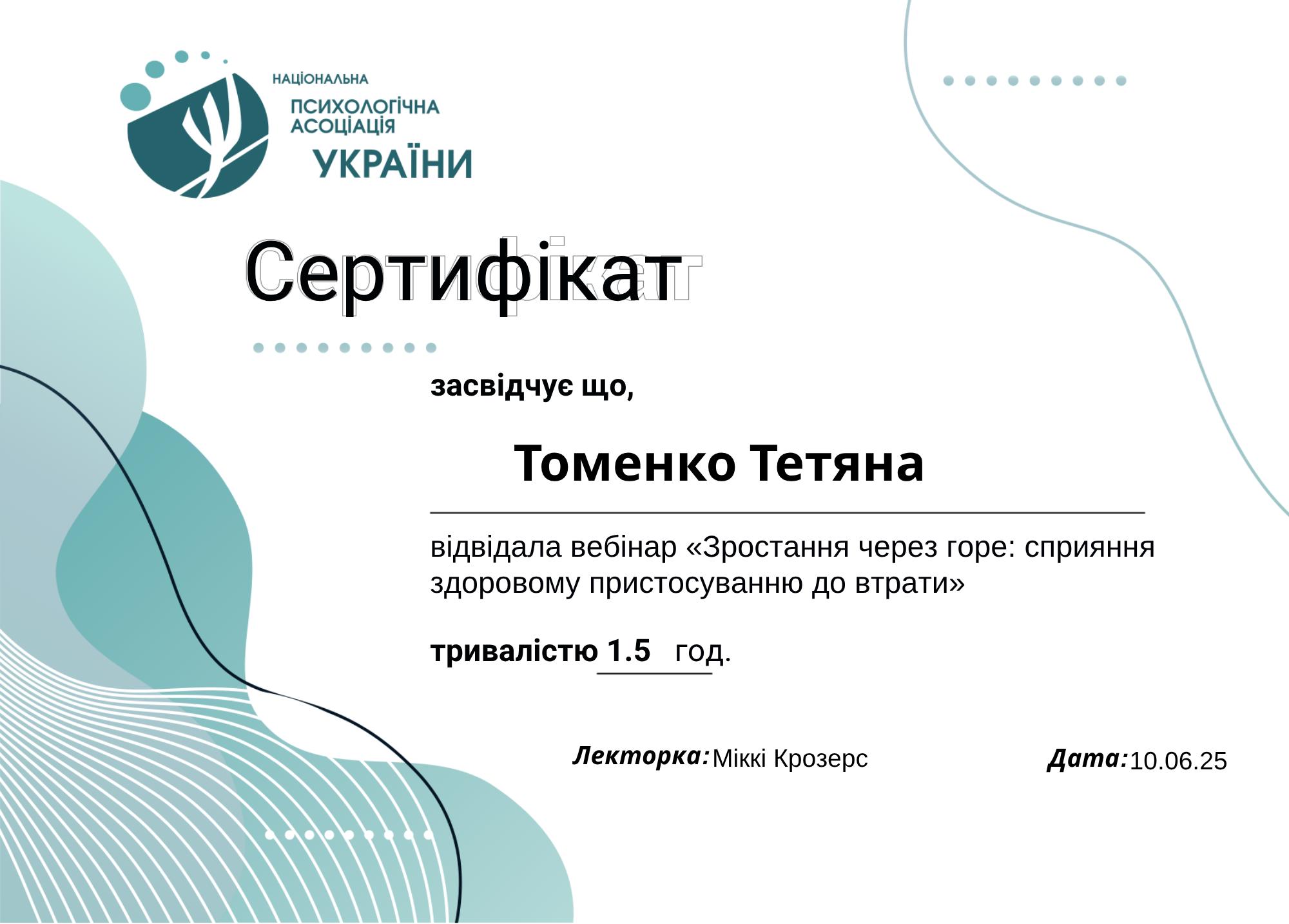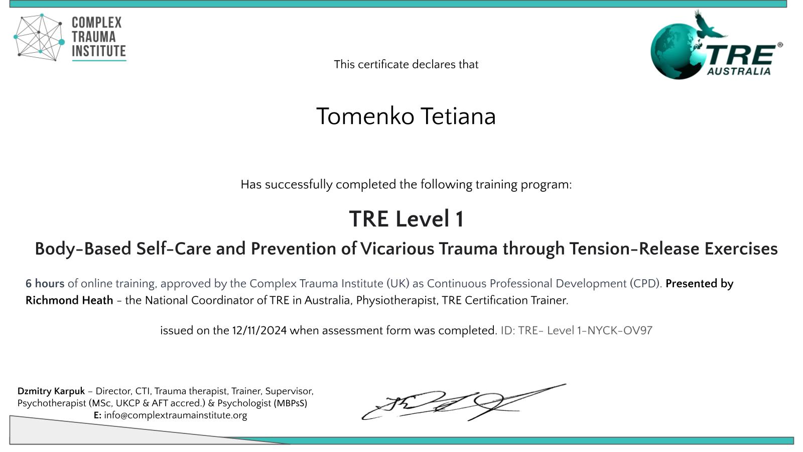 Окончила в декабре 2024 года НТУ "ХПИ" по специальности 053 психология. В феврале 2024 года сертифицировалась в методе биосугестивной терапии. В сентябре 2025 года окончила циклы специализации "Клиническая психология" и пропедевтика психических заболеваний. Сейчас обучают на базовых курсах Логотерапии и Положительной психотерапии Пезешкиана, а также нейробиология травмы, ее диагностирование в международном институте изучения травмы. Прошла обучение в январе 2025 года по программе mhGAP и МКФ. Изучала телесно-ориентированные подходы Бабетт Ротщильд, TRE, метод Дэвида Мусса Ревайнд по переработке травматических воспоминаний, метод эмоционального освобождения EFT, КПТ, помощь в горении по 8-шаговой программе, онлайн программа Лиз Глиссон по вопросам потерь и горения здоровье от НПА, членом которой я являюсь.