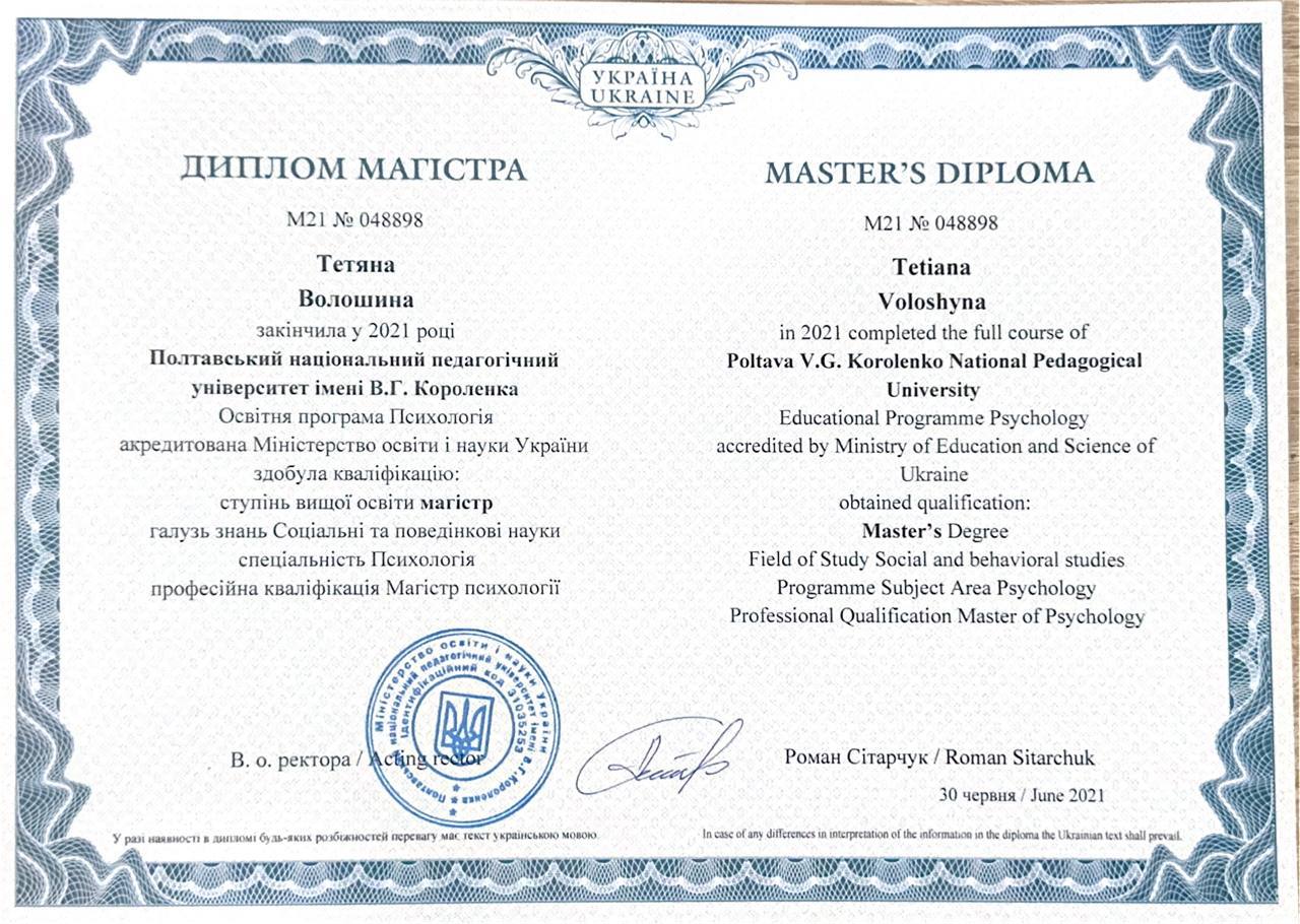 Полтавский Национальный педагогический университет им. В.Г. Короленко, специальность – психология, квалификация – магистр по психологии, консультанта в методе Позитивной транскультуральной психотерапии по Н. Пезешкиану, базовом курсе в «Украинском институте имени Виктора Франкла» на окончание его в июне 2025 года, и получение сертификата Логоконсультанта • Курс от Международного образования Эмоционально-образная терапия (ЭВТ), • Курс «Работа с ПТСР и травмирующим опытом в методе See Far CBT» Израильского института профилактики стресса, • Курсы «Теория и практика работы с МАК» и «Особенности работы с беженцами и переселенцами» Международной тренинговой компании «Os». Станорм в настоящее время учусь в методе Символдрамы и Травмофукосованной терапии