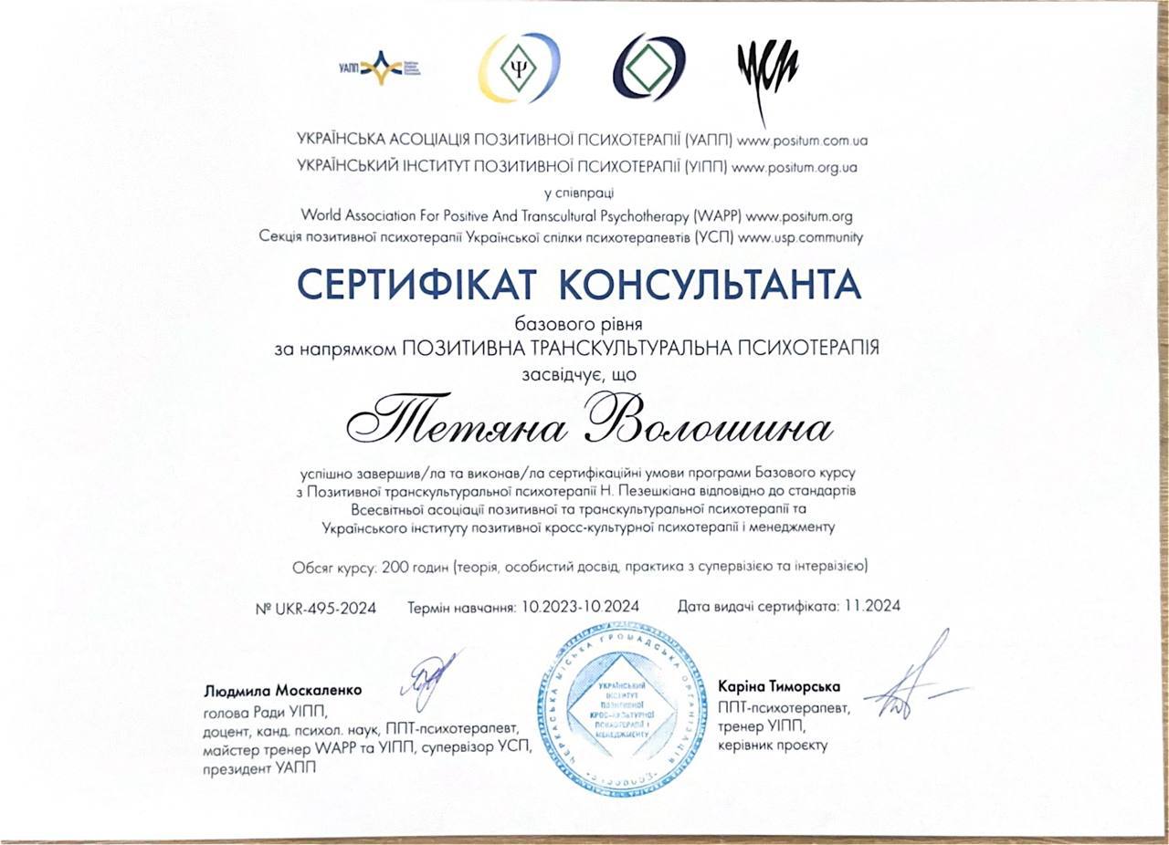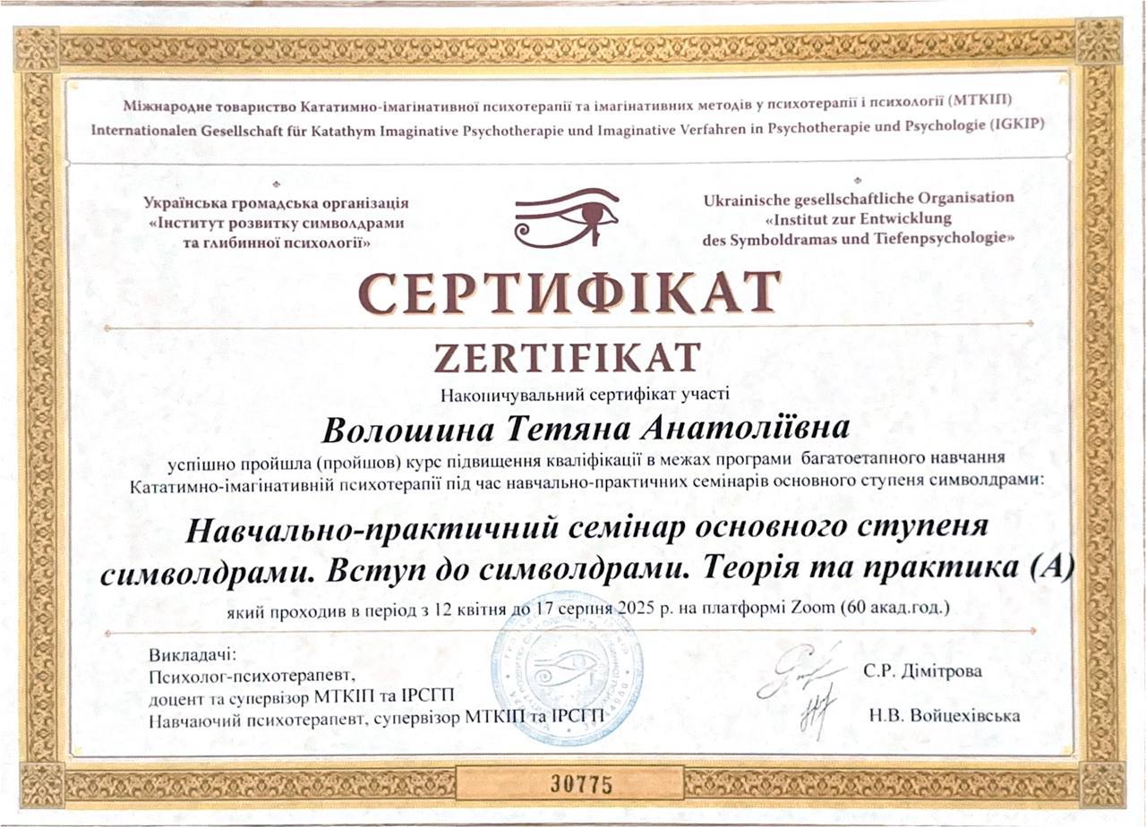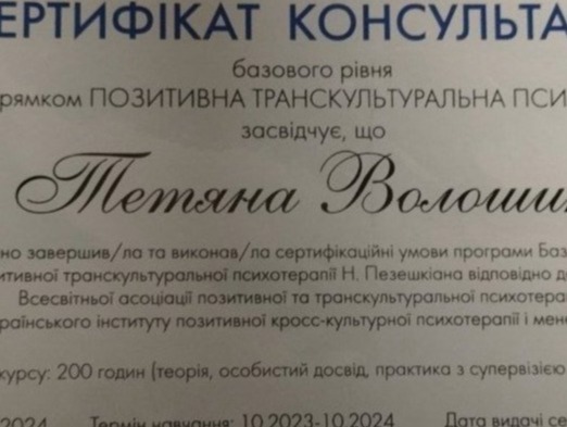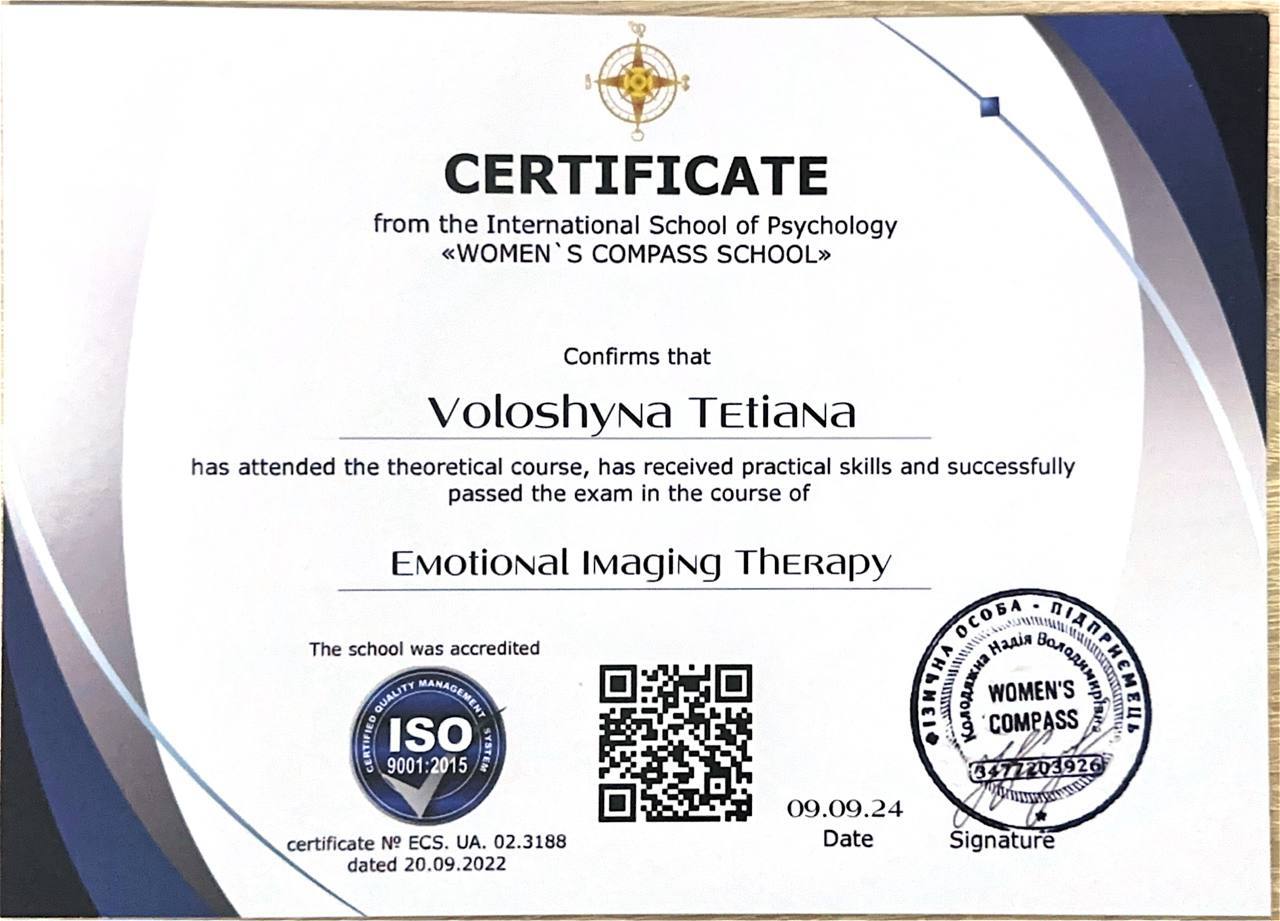 Я, практикующий психолог, арттерапевт имеет более 800 часов индивидуальных консультаций и более 160 времен групповых занятий включая работу с внутриперемещенными лицами, и лицами находящимися в сложных жизненных ситуациях. В проведении индивидуальных консультаций применяю знания по положительной психотерапии, работа с ПТСР в методе See Far CBT, технике ресурс-ориентированной терапии и эмоционально-образной терапии.