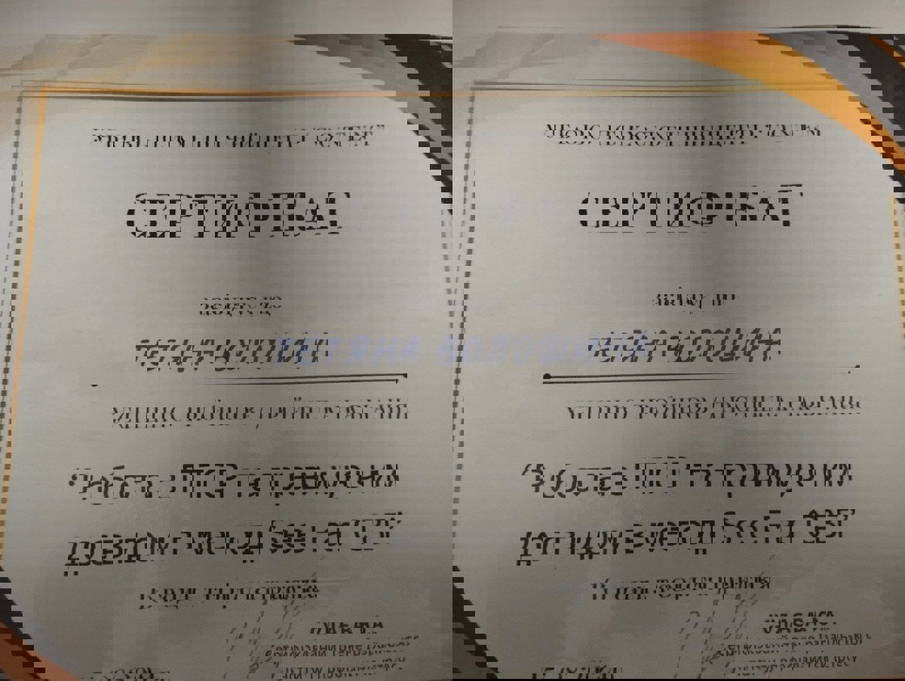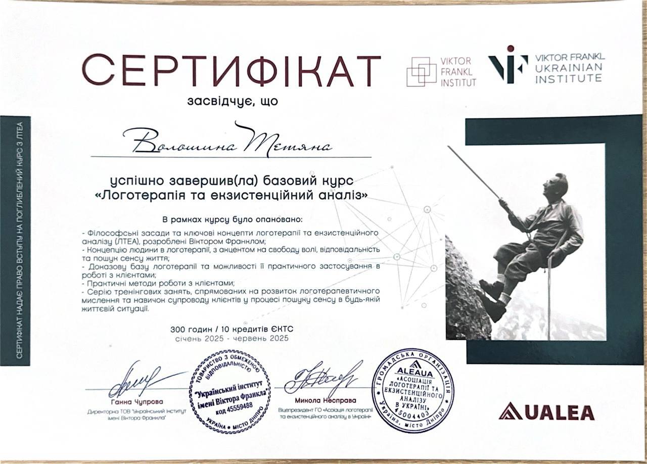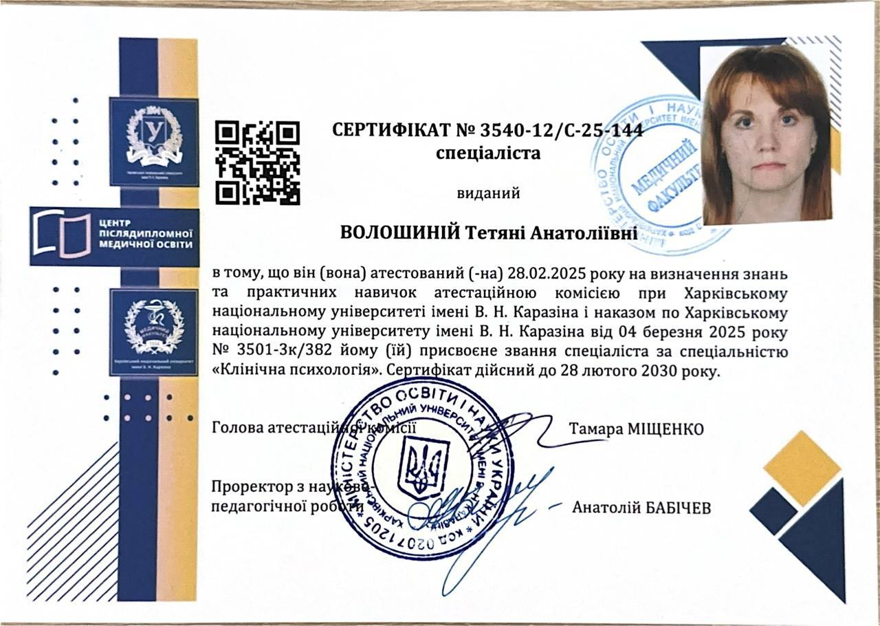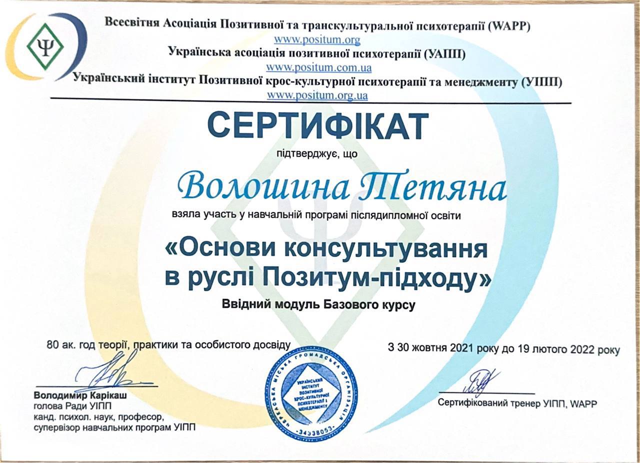 Я, практикующий психолог, арттерапевт имеет более 800 часов индивидуальных консультаций и более 160 времен групповых занятий включая работу с внутриперемещенными лицами, и лицами находящимися в сложных жизненных ситуациях. В проведении индивидуальных консультаций применяю знания по положительной психотерапии, работа с ПТСР в методе See Far CBT, технике ресурс-ориентированной терапии и эмоционально-образной терапии.