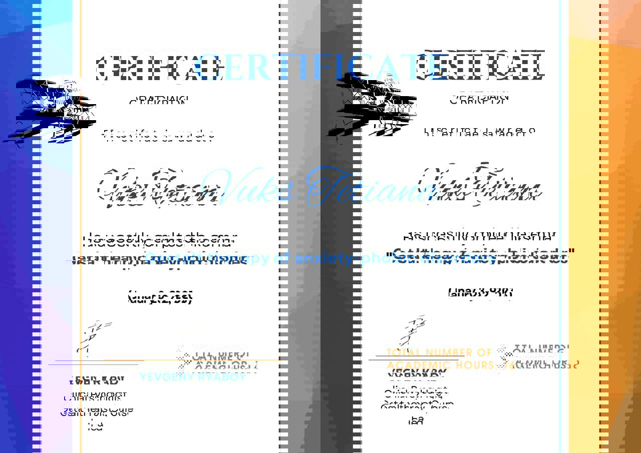 Киевский Институт рационально-интуитивной психотерапии "Я", "Когнитивно-поведенческая модель в психологическом консультировании" (2020г., курс 60 часов), сертификат