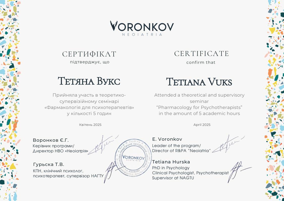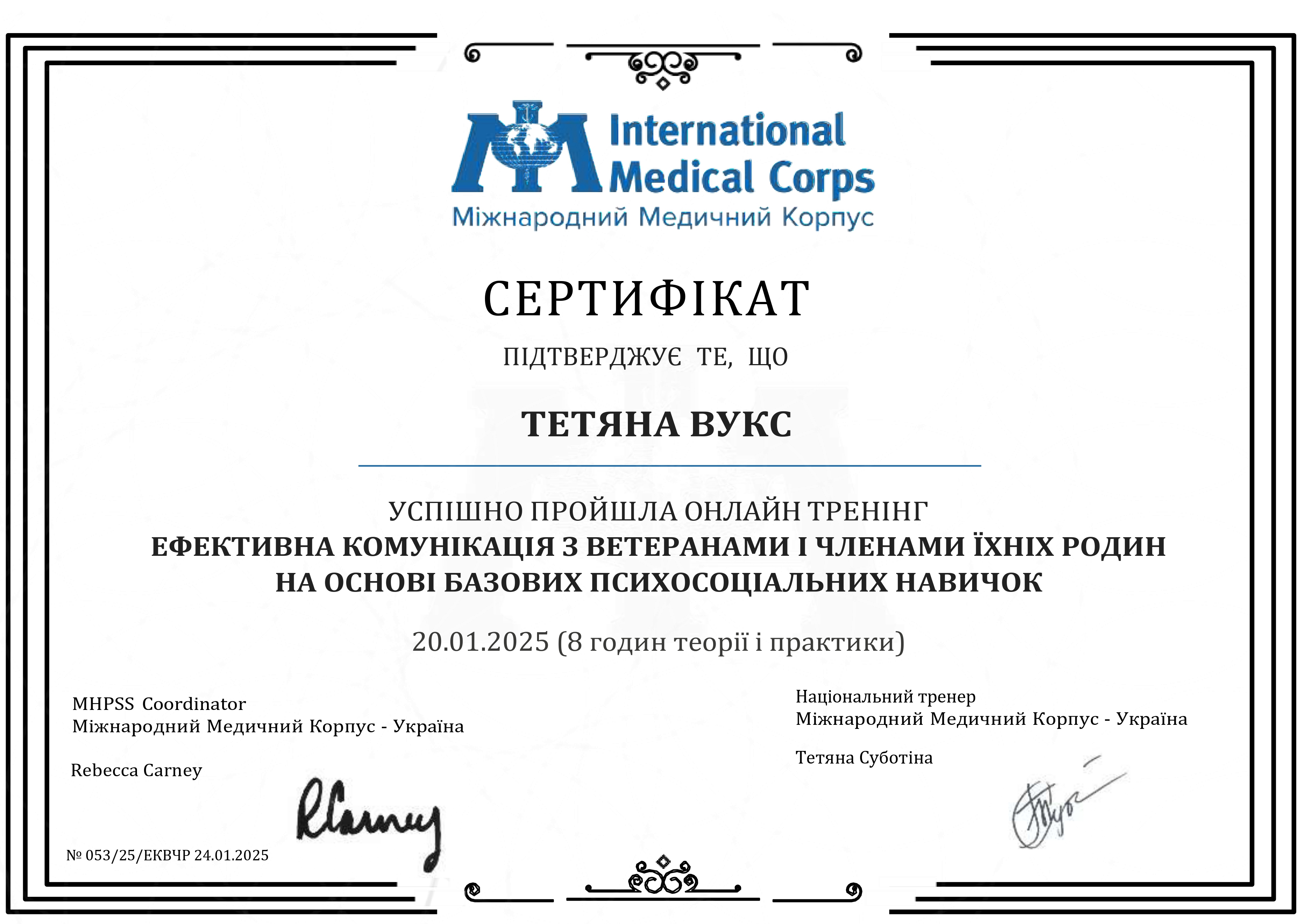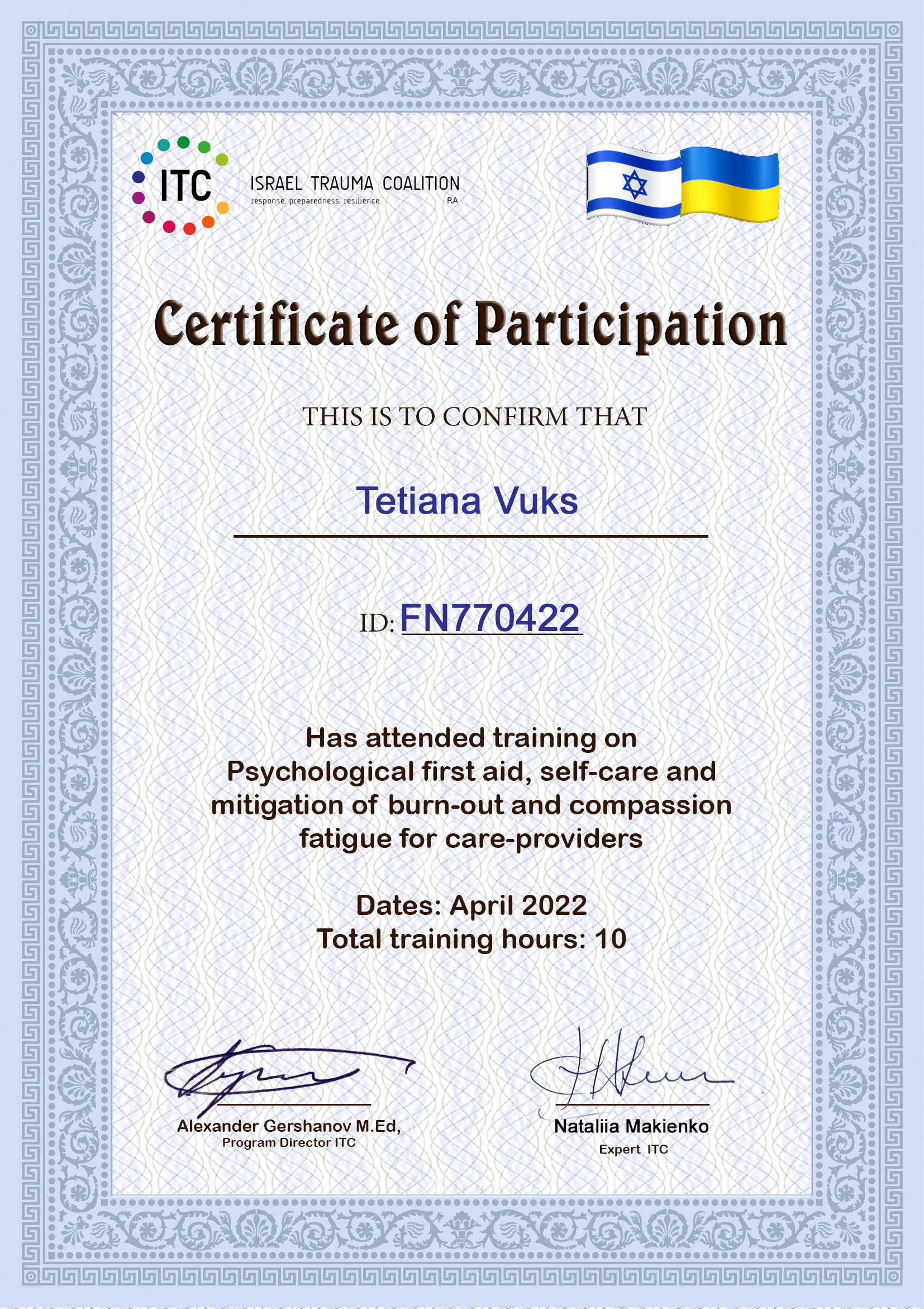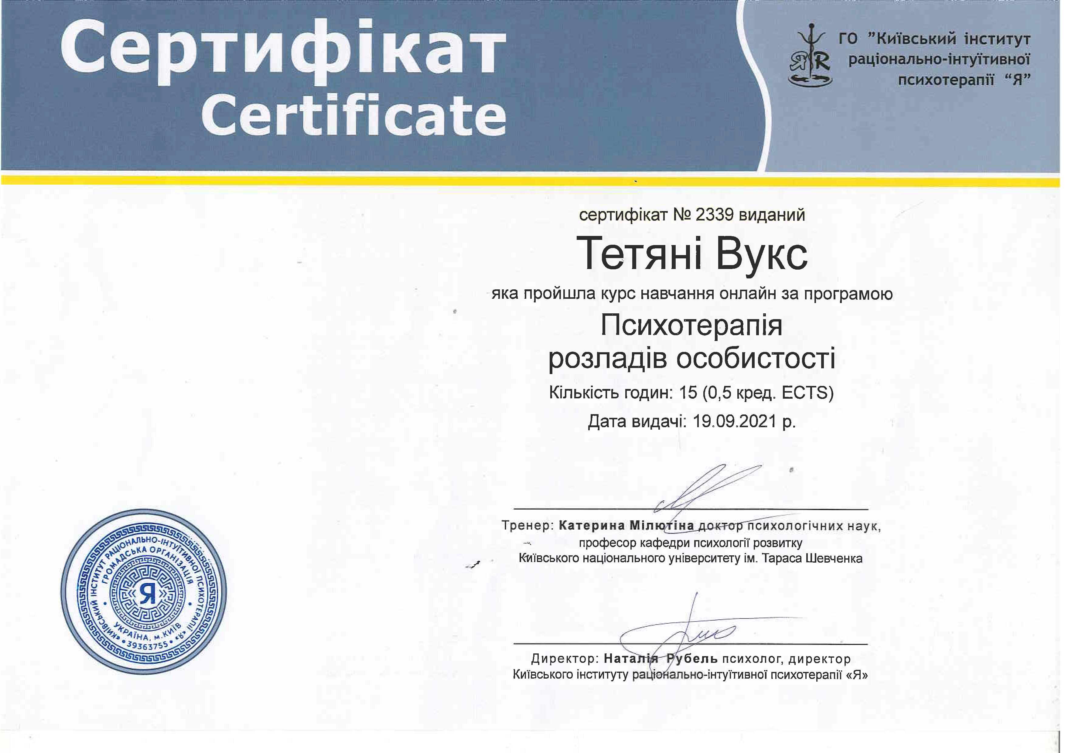 Киевский Институт рационально-интуитивной психотерапии "Я", "Основы психологического консультирования взрослых" (2020г., курс 60 часов), сертификат