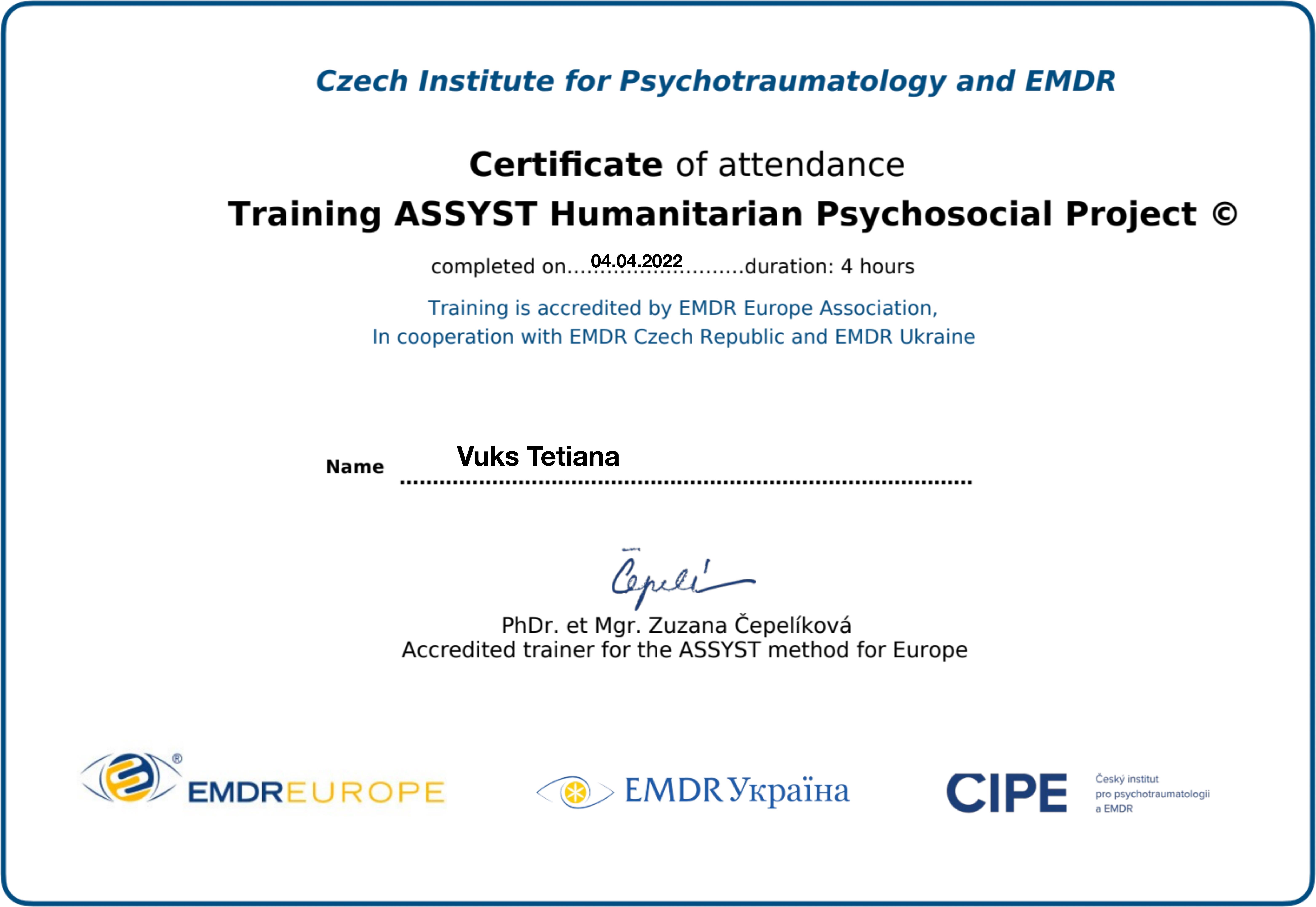 Тренировка ASSYST Humanitarian Psychosocial Project - Учреждение является утвержденным EMDR Europe Association.In cooperation with EMDR Czech Republic and EMDR Ukraine(April, 2022)