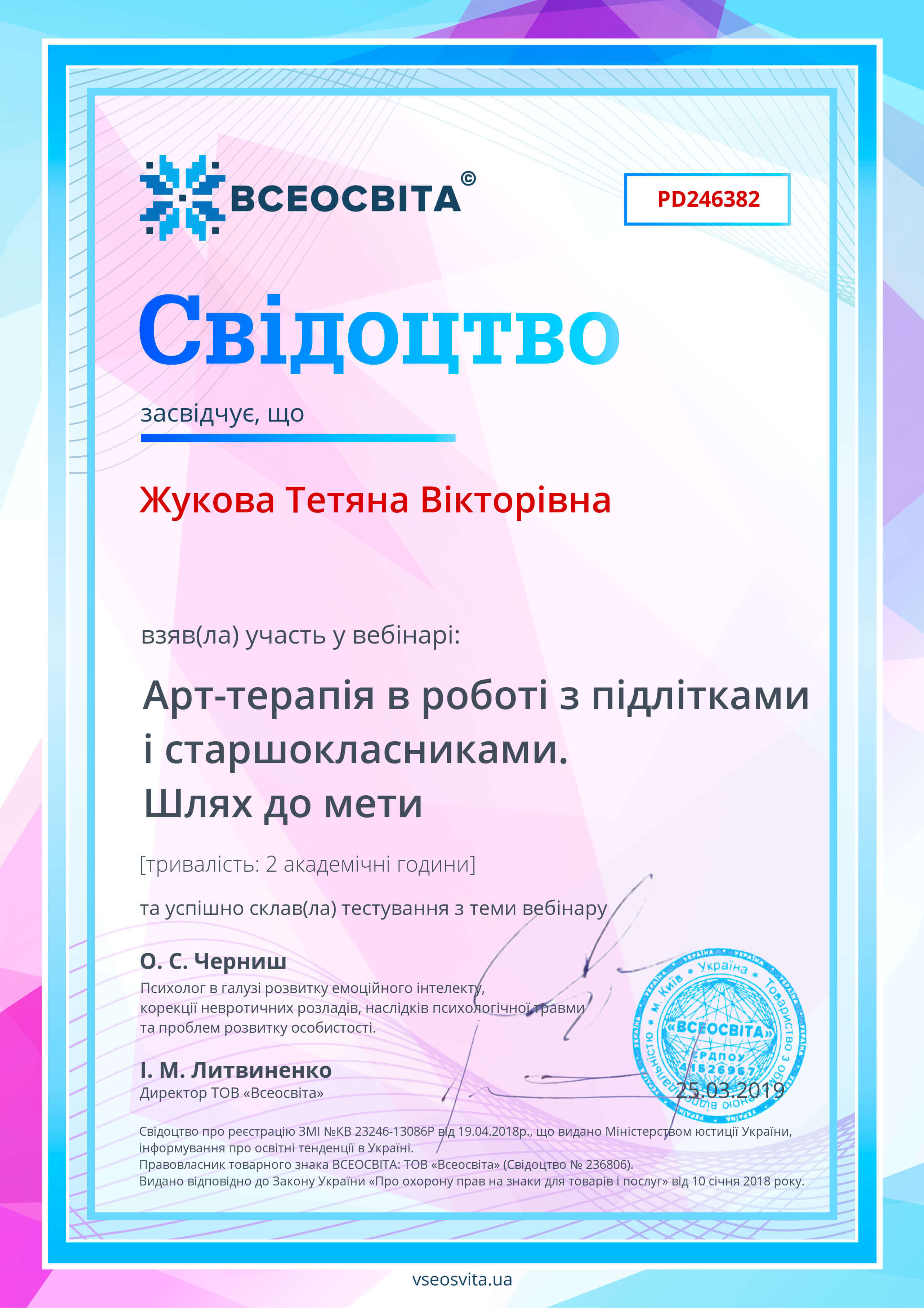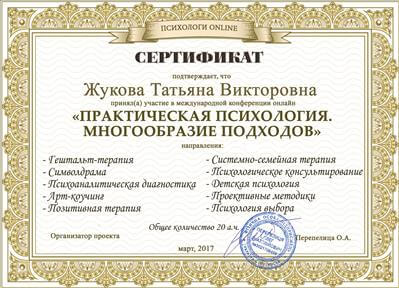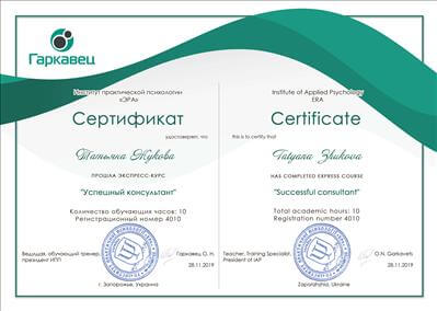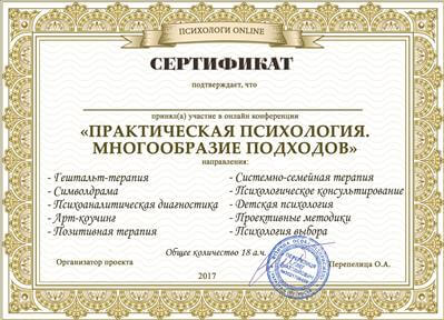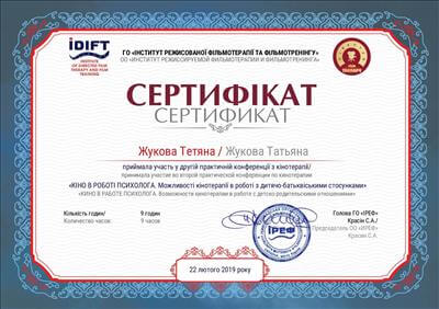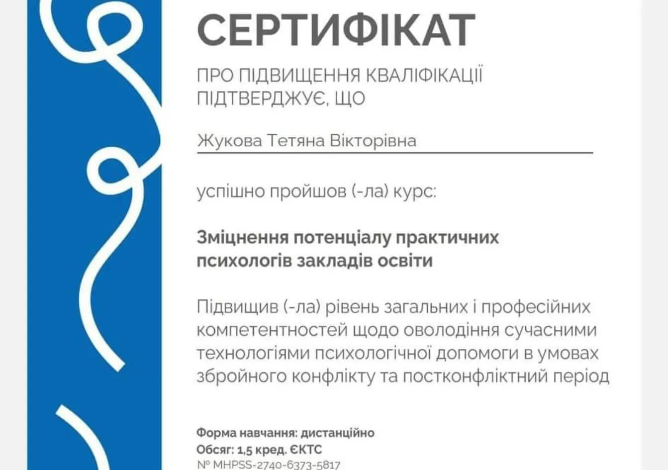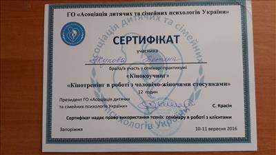 Образование: ВУЗ: МГПУ, практический психолог - диплом; МОН КЗ ЗОР, свидетельство о повышении квалификации,108ч; МИГИС, сертификат по арт-терапии, 90ч. (годичный курс); Сертификат по МАК, 72ч; Сертификаты: Навыки кризисного консультирования и развития психосоциальной стойкости к стрессу, 25ч; Практическая психология. Многообразие подходов, 20ч; Кинокоучинг. Кинотренинг в работе с женско-мужскими отношениями., 12 ч; Техники режиссированого мульттренинга в работе с детьми и родителями., 8 ч; Кино в работе психолога. Практические аспекты., 6 ч; Кино в работе психолога. Возможности кинотерапии в работе с детско-родительскими отношениями., 9 ч; Успешный консультант., 10 ч; МАК Эксперт. Семья. Дети., 20 ч. и др.