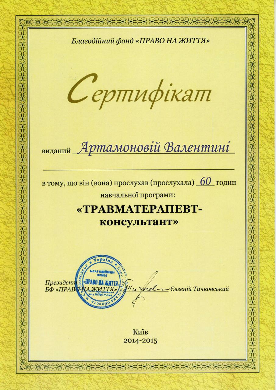 Затем прошла обучение травмотерапевта в 2014–2015 гг. (БФ «Право на жизнь»).