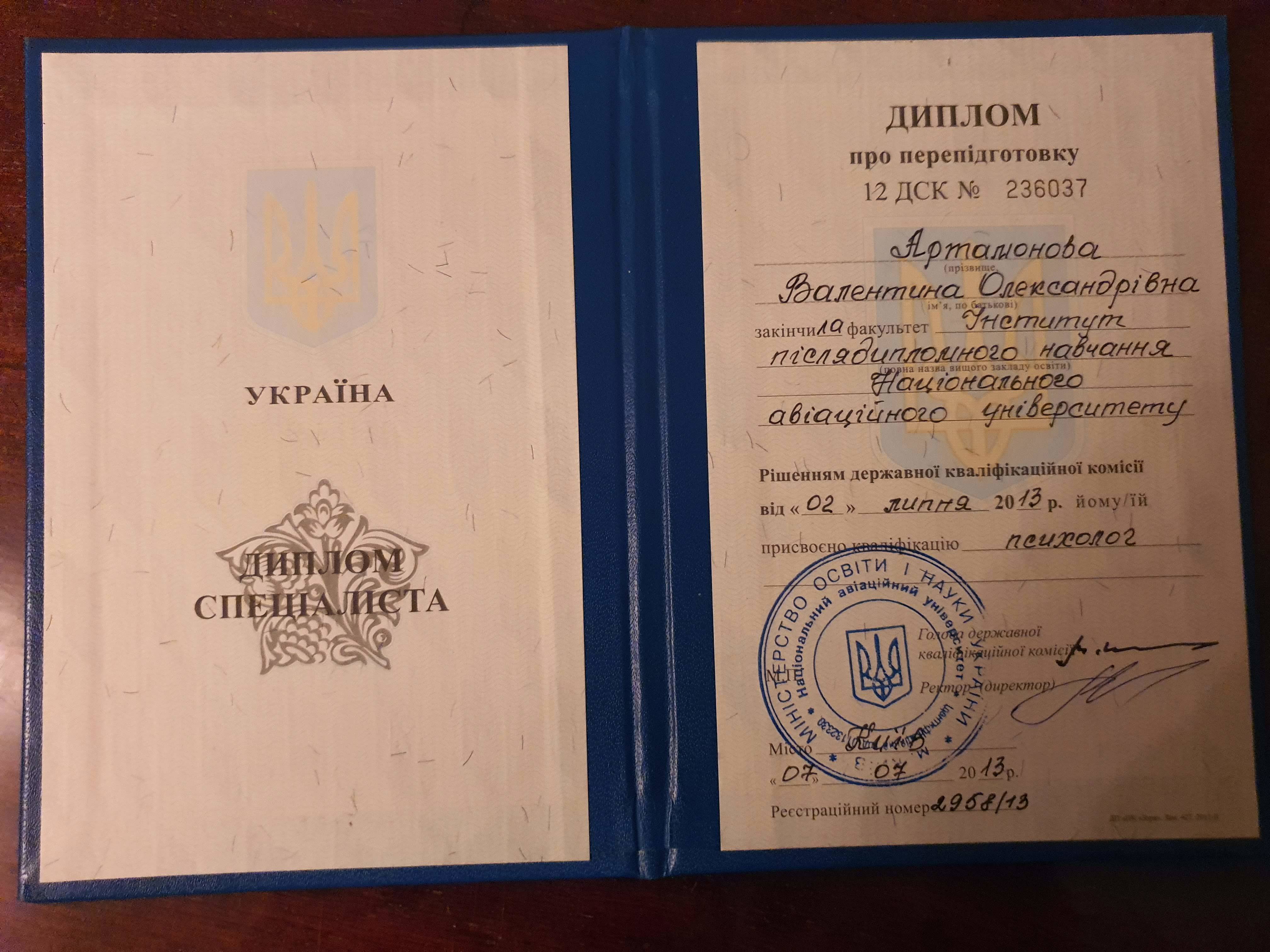 Высшее психологическое образование получила диплом в 2013 году в НАУ.