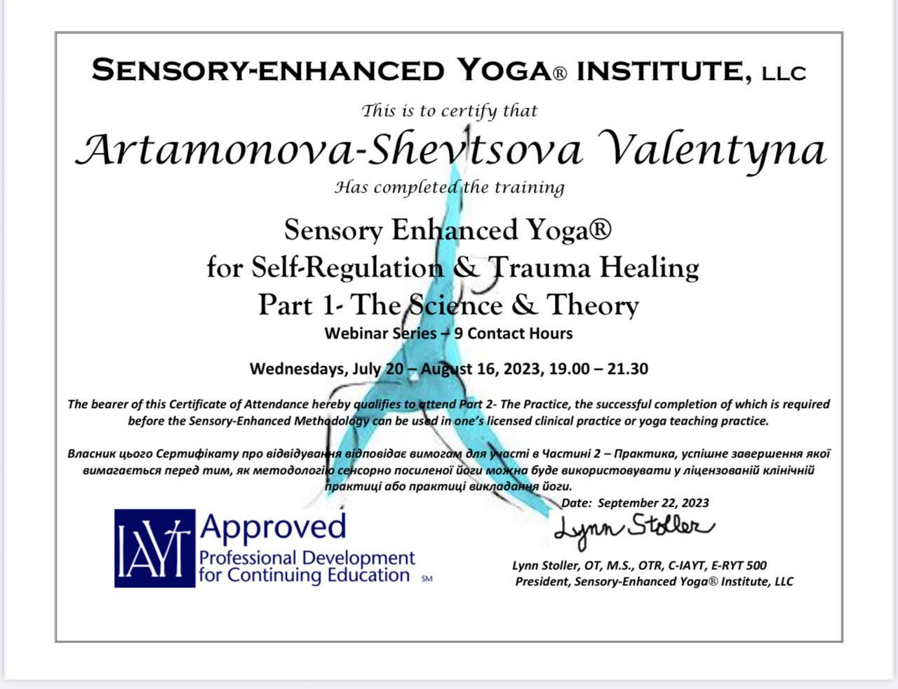 2023 г. - Сенсорно-усиленная йога для саморегуляции и лечения травм (Sensory-Enhanced Yoga Institute).