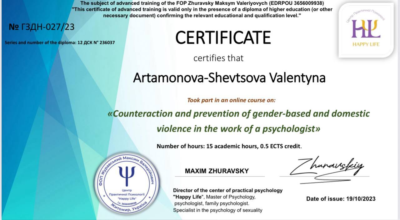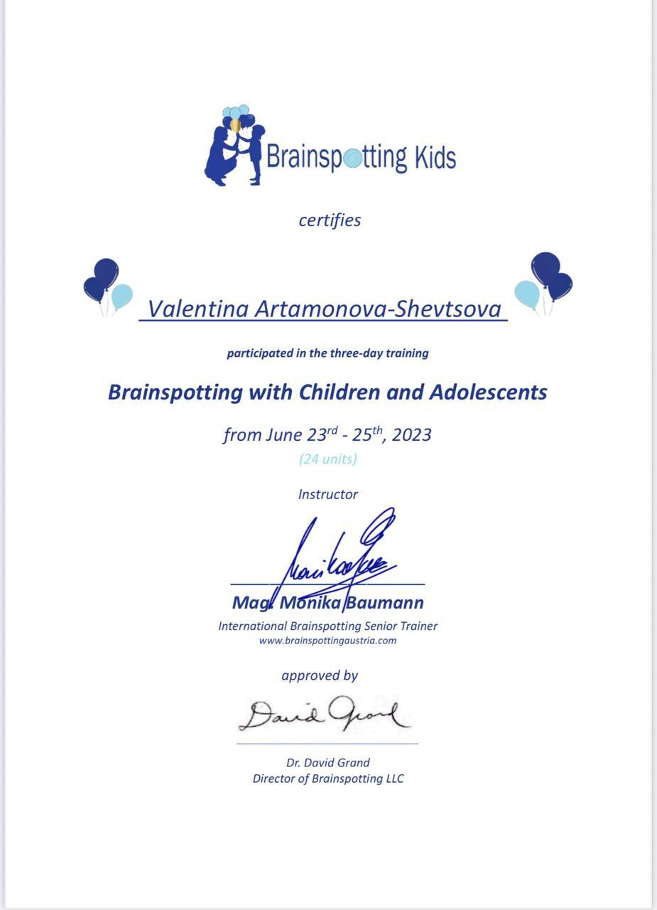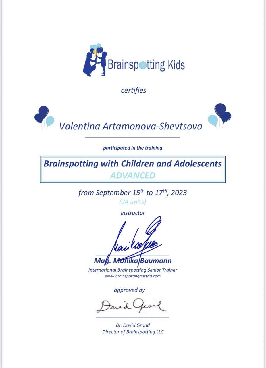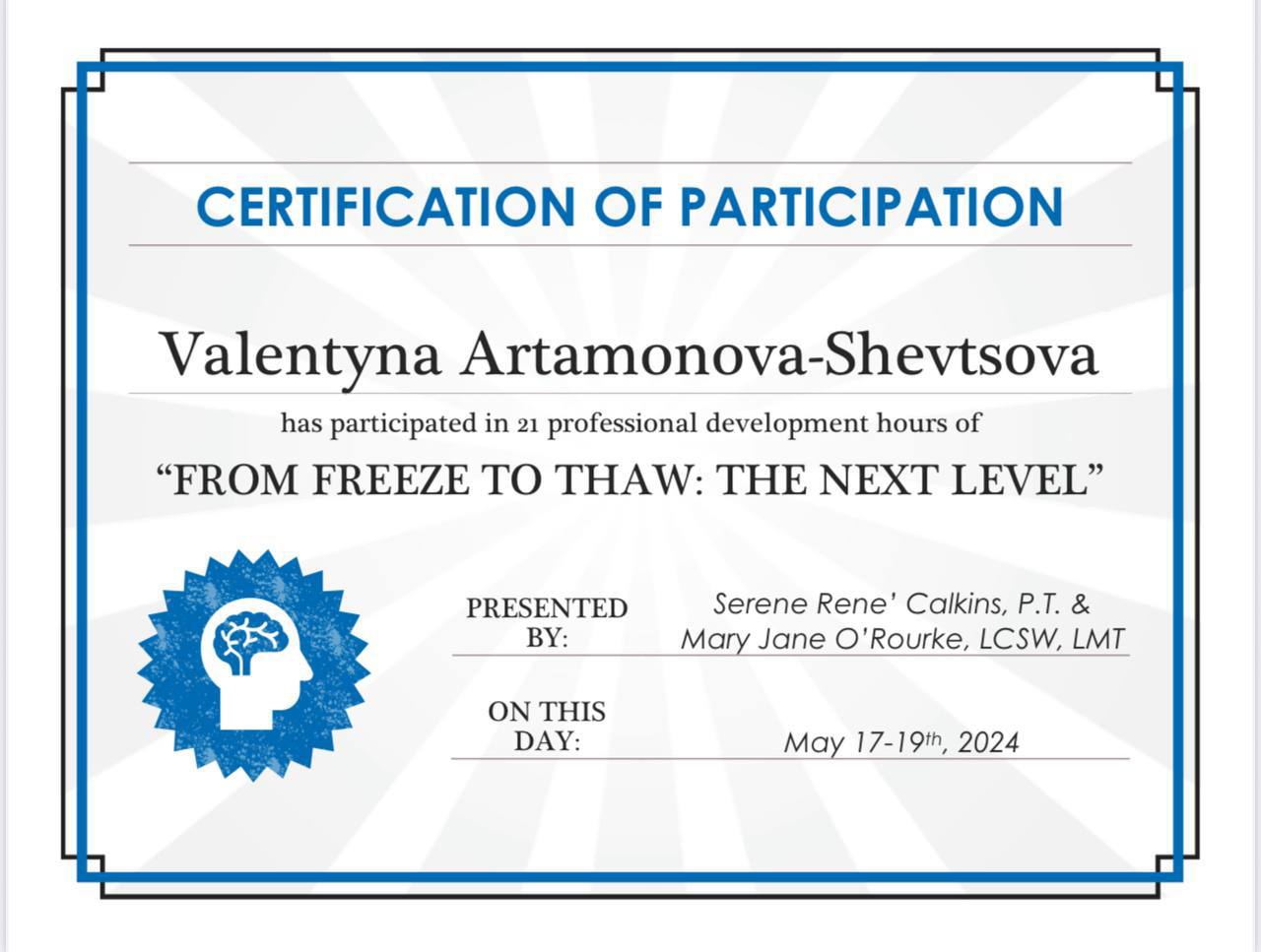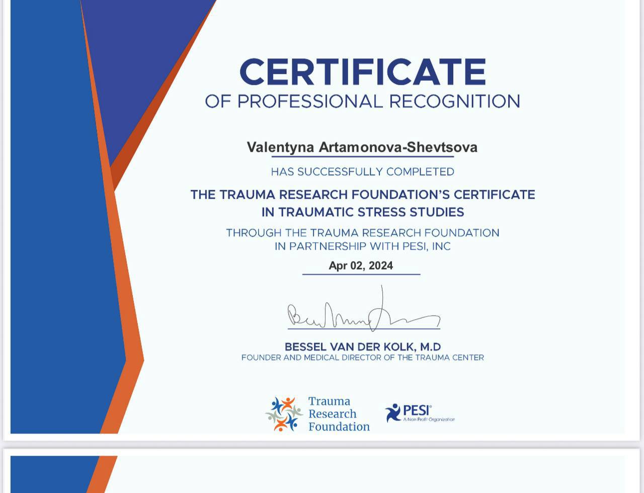 2023–2024 гг. – обучение по работе с травматичностью стресса (Trauma Research Foundation, PESI).