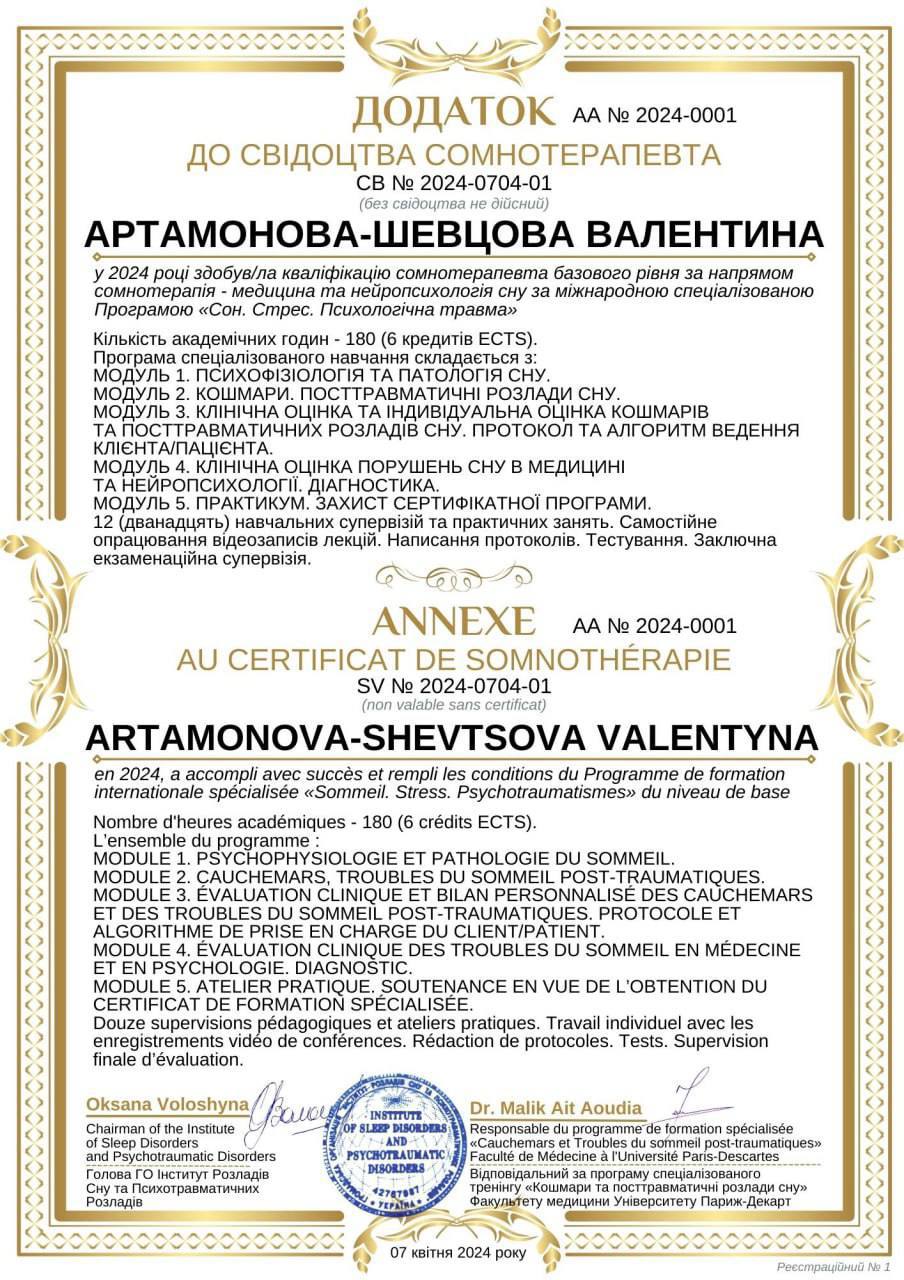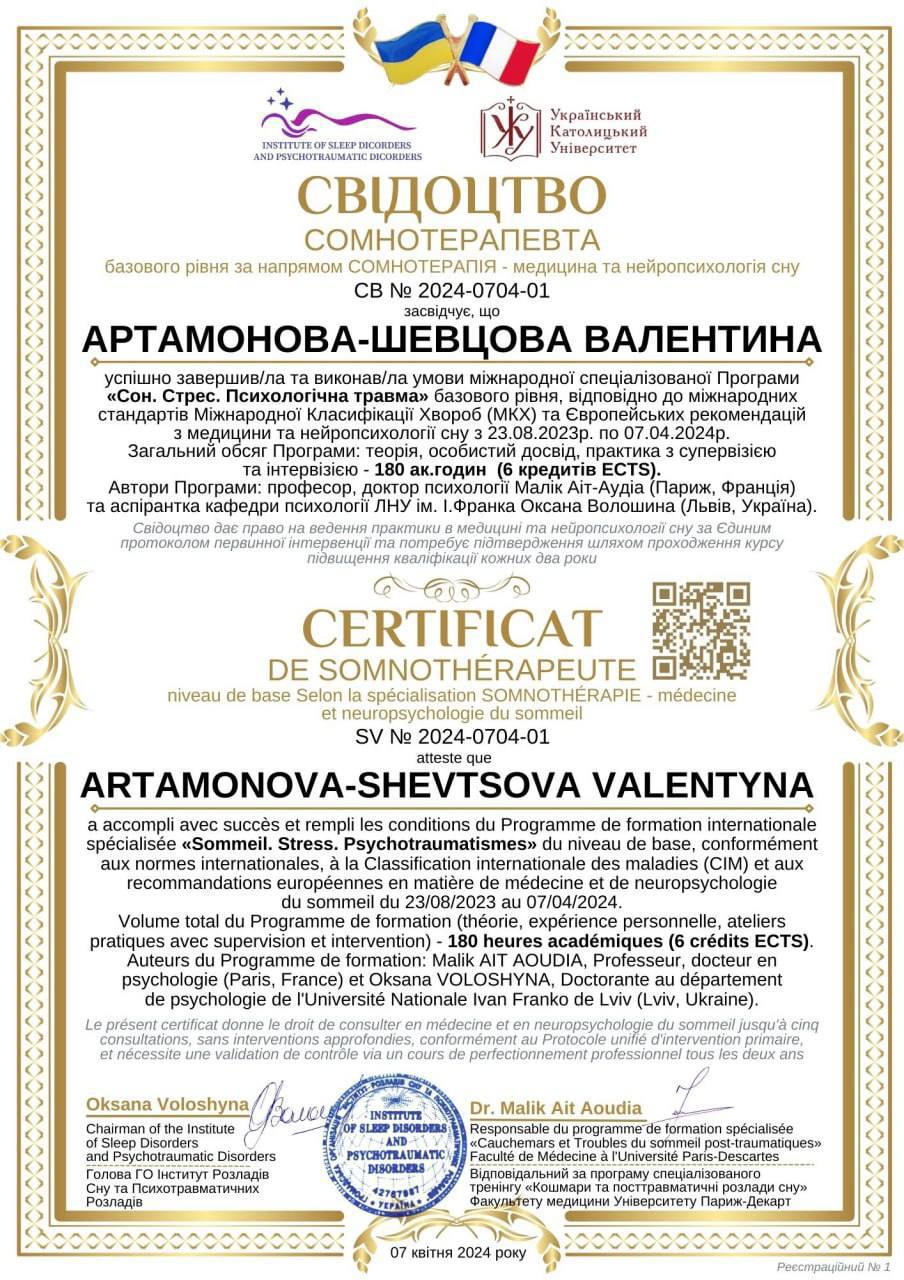 2023-2024 гг. - прошла обучение на сомнотерапевта (работа с восстановлением комфортного, здорового сна) (Институт расстройств сна и психотравматических расстройств).