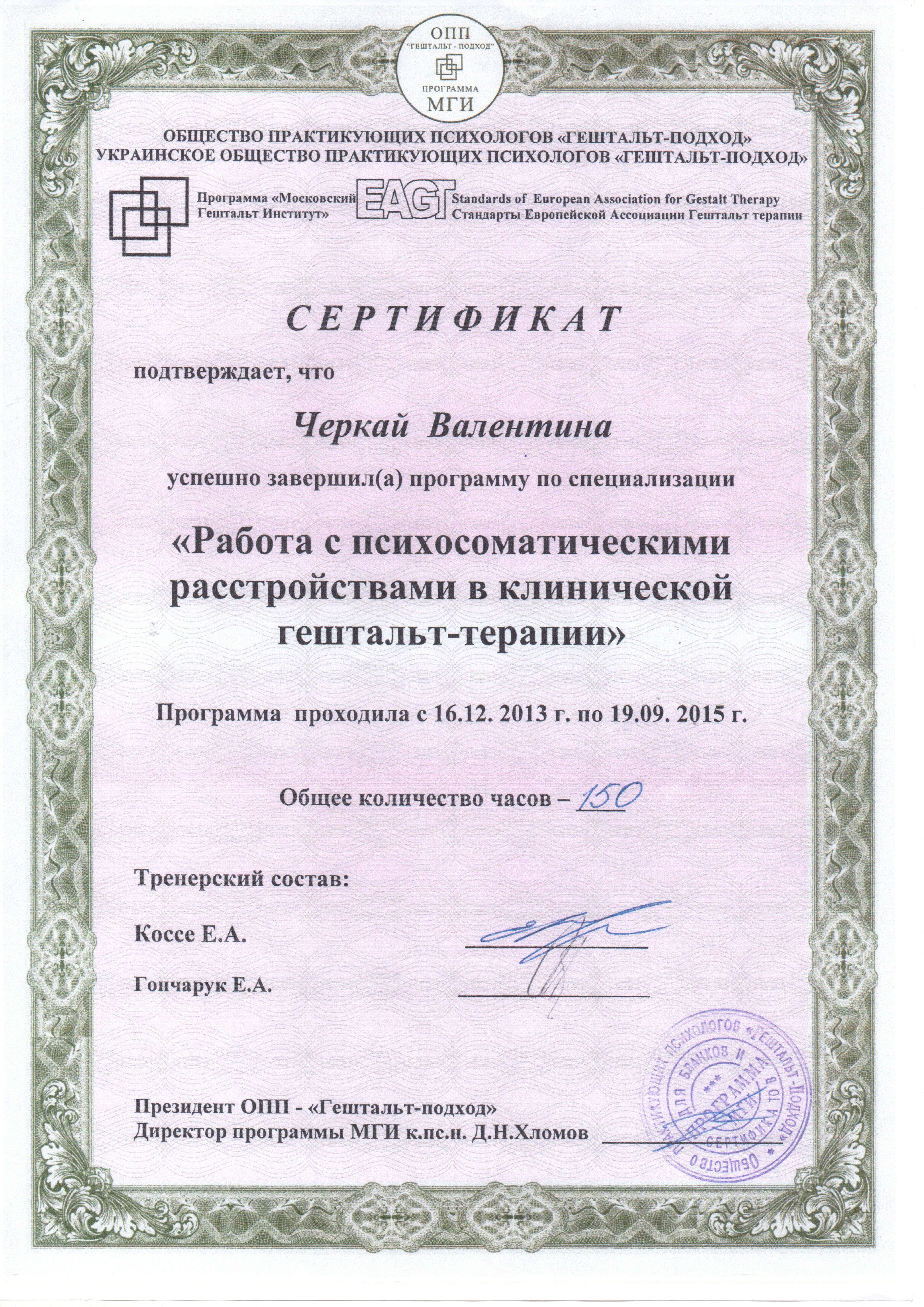 Институт психоанализа,специализация клиническая психология.5лет.диплом гос.образца г.Москва Медико-стоматологический универ.-проф.переподготовка по клинической пихологии г.Москва; Нейропсихологическая диагностика и коррекция при отклонениях психического развития г.Москва; Аккредитованный гештальт терапевт,специализации: работа с психосоматическими расстройствами в клинической гештальт-терапии; Расстройство пищевого поведения в гештальт подходе;Семейная психотрерапия и консультирование(программа подготовки в соответствии со стандартами Европейской Ассоциации Гештальт-терапии (EAGT) DBT(диалектическая поведенческая терапия) на базе голландского института Dialexis