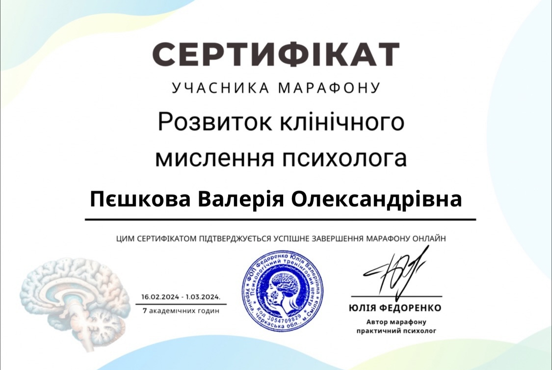Получила степень консультанта в методе положительной психотерапии (ППТ) (200 академ. часов). 2023г.
