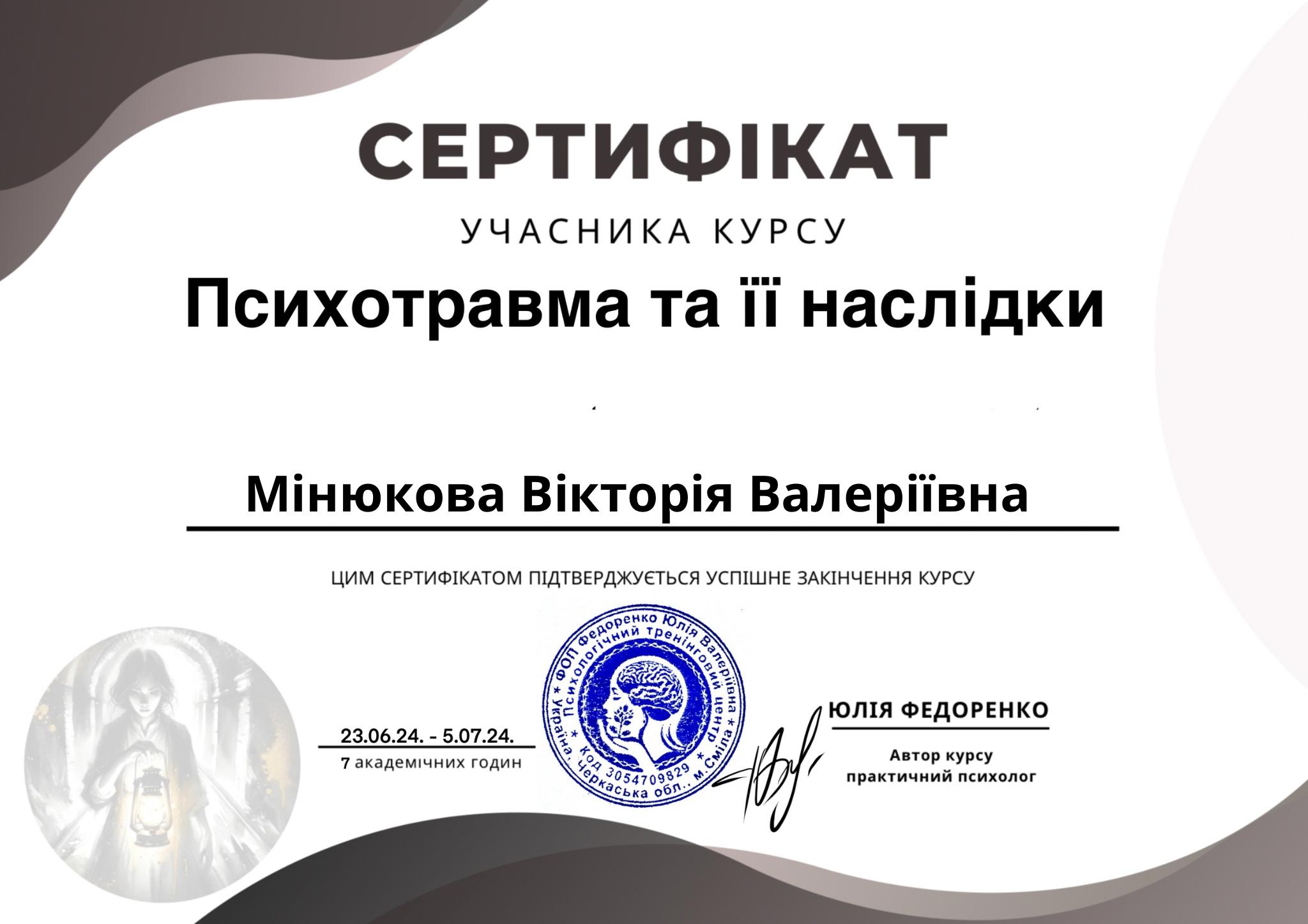 Прошла лекционный курс на тему "Разбор и динамика курса терапии с 15 сессий" в Институте структурного анализа. А также завершила обучение по курсу "Интегративная групповая психотерапия".