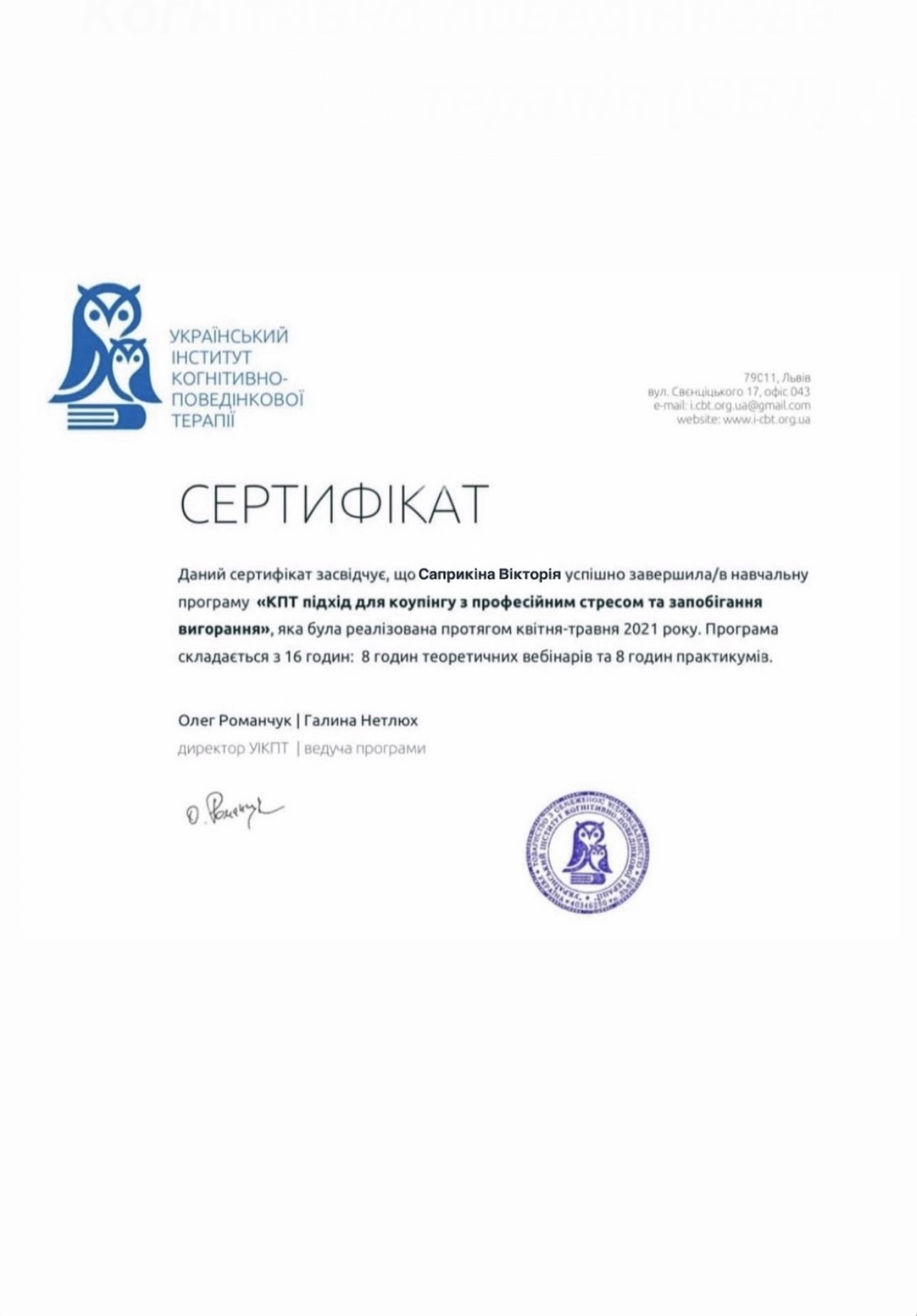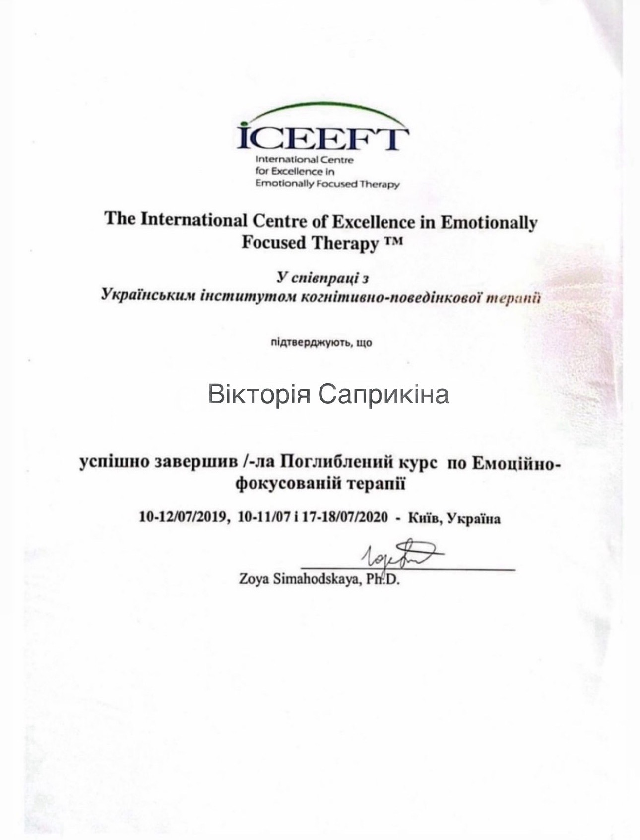 Южный институт, высшее образование по специализации «Психолог. Преподаватель психологии»/ психотерапевтический курс обучения методу «Символдрама» 192 часа, факультет психологии ЮФУ/ Диалеткическая поведенческая терапия - Ниндерландская тренинговая компания института Линехана/ CFT-